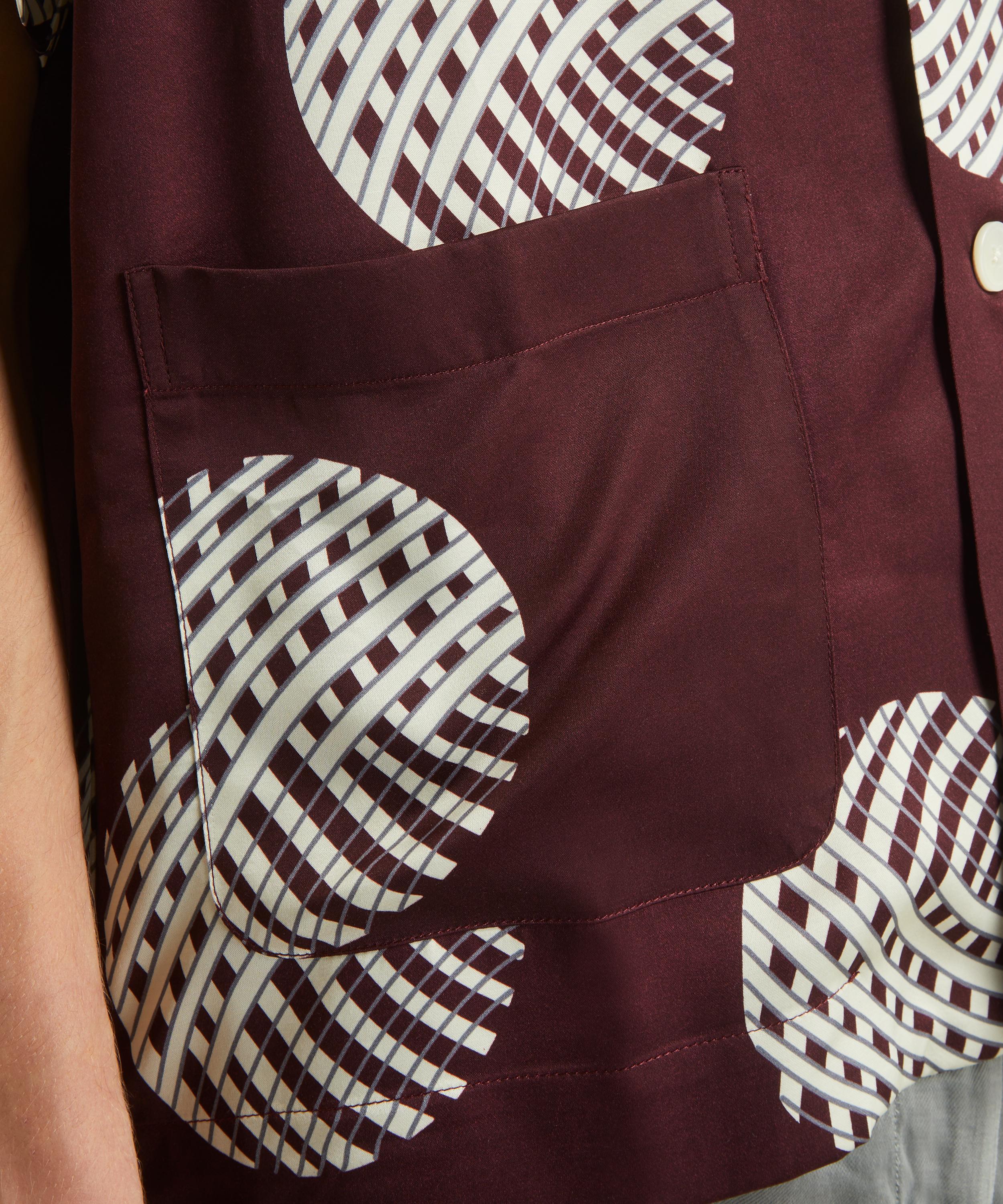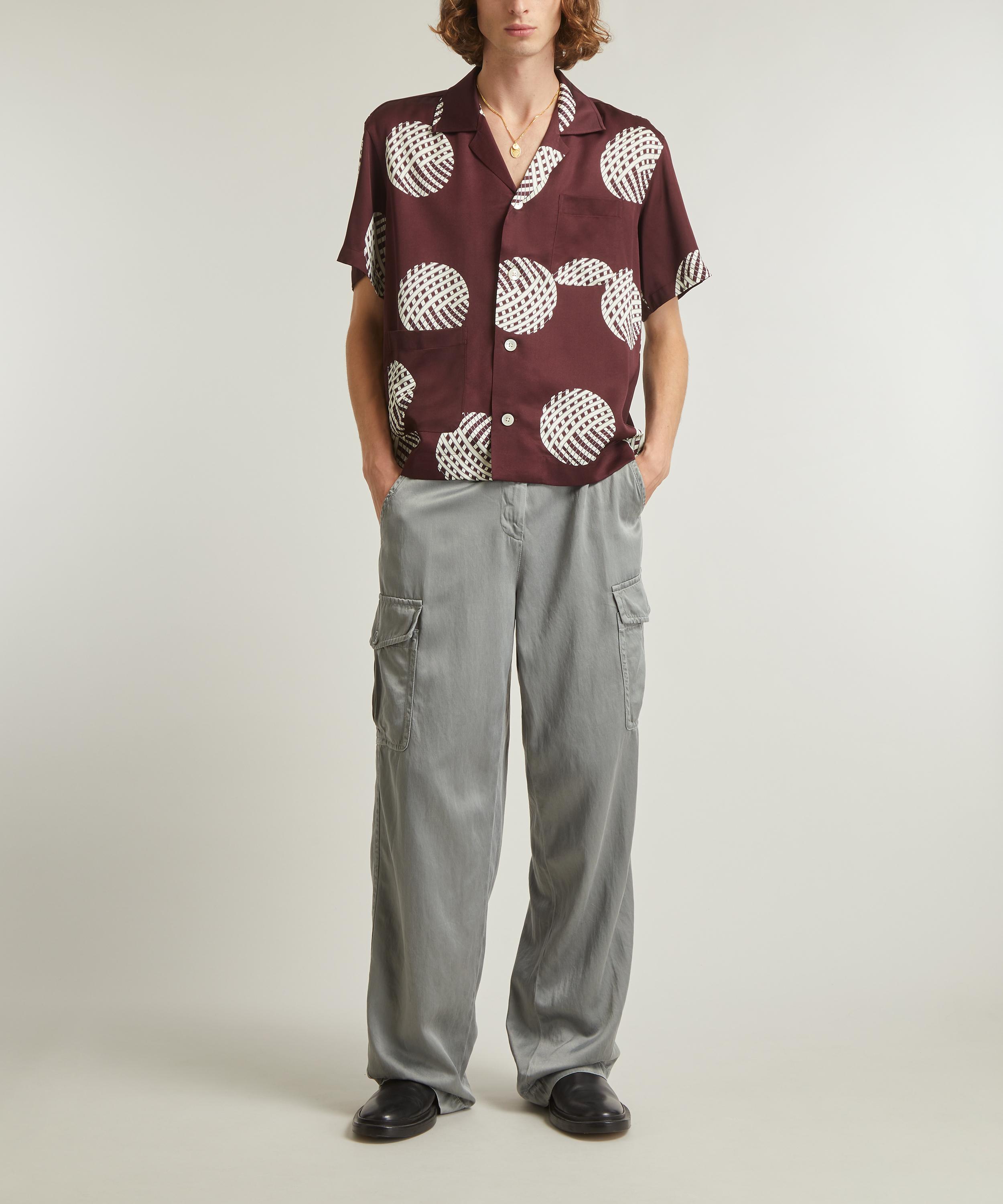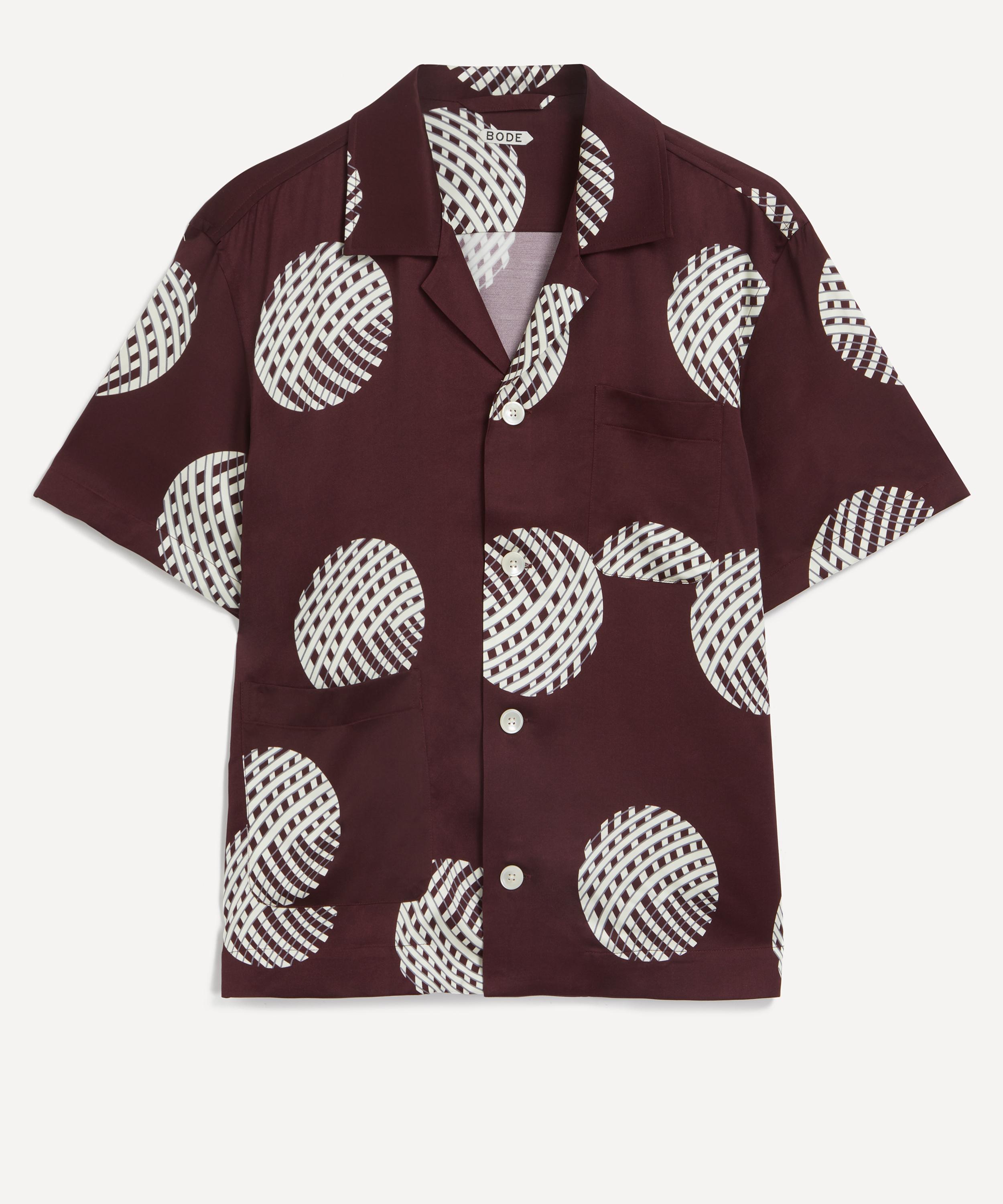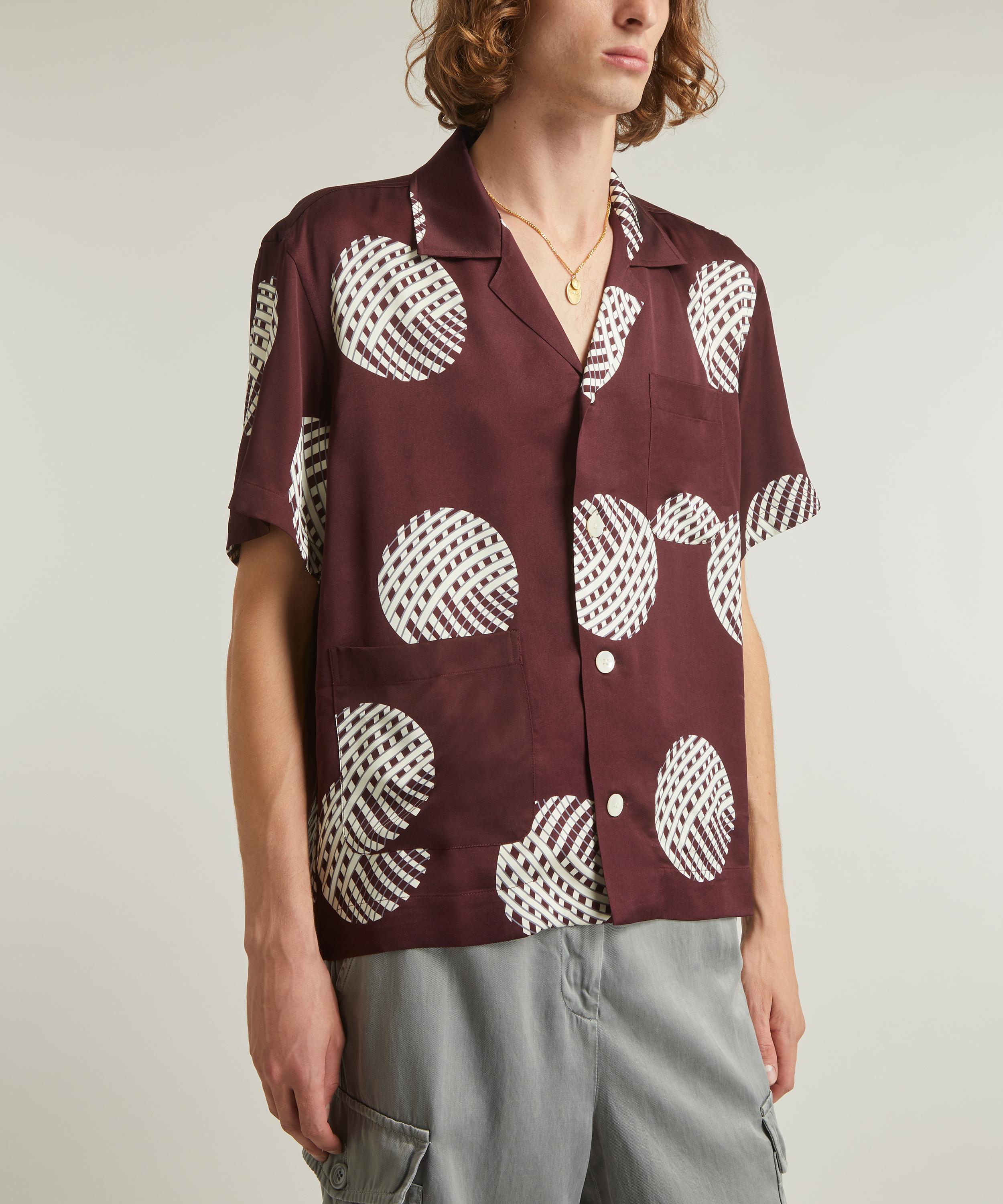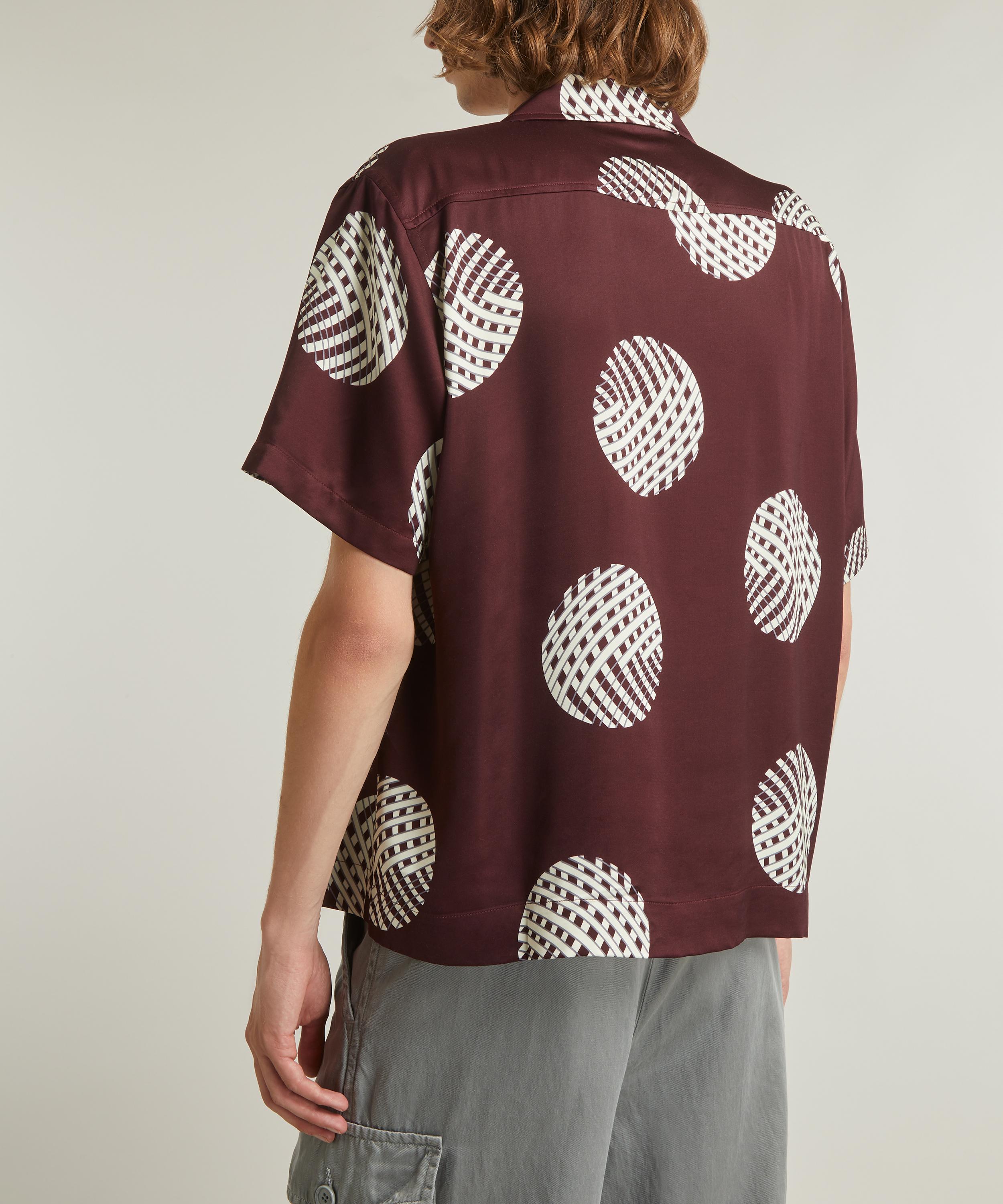 Inspired by deadstock yardage from the mid-century, this burgundy bowling–style shirt is detailed all-over with a red geometric sphere pattern. Cut from cotton for a boxy fit with short sleeves, it’s fitted with a spread collar and patch pocket at the chest.