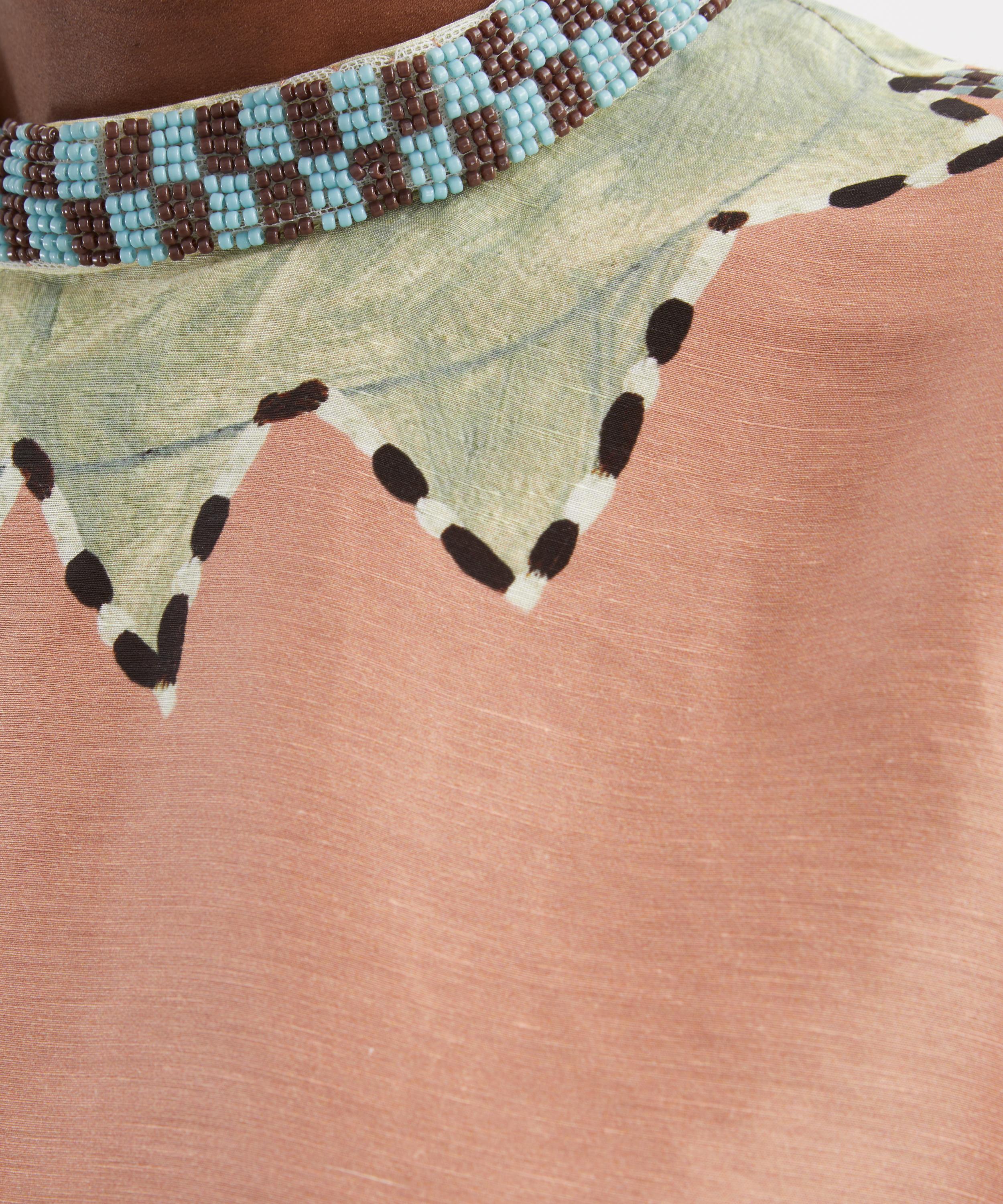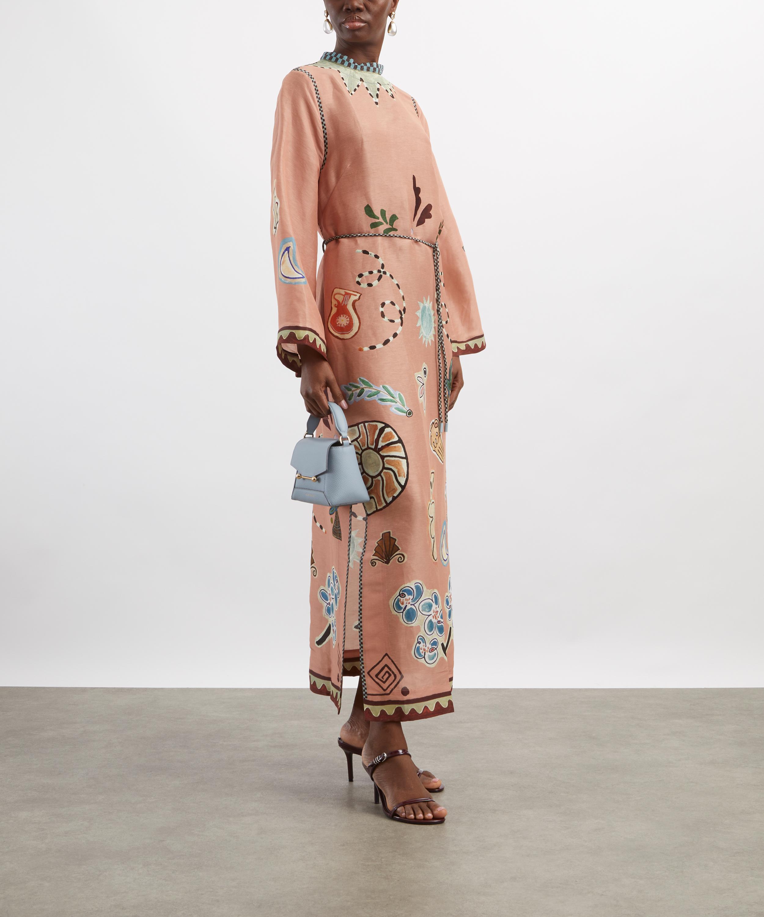 Created in collaboration with artist Laurence Leenaert, this midi dress is adorned with an abstract array of painterly illustrations. Cut from a lightweight linen–silk blend, it features a flattering straight silhouette with a beaded round neckline, wide long sleeves, and a side slit at the hem, finished with a detachable braided belt to define the waist.