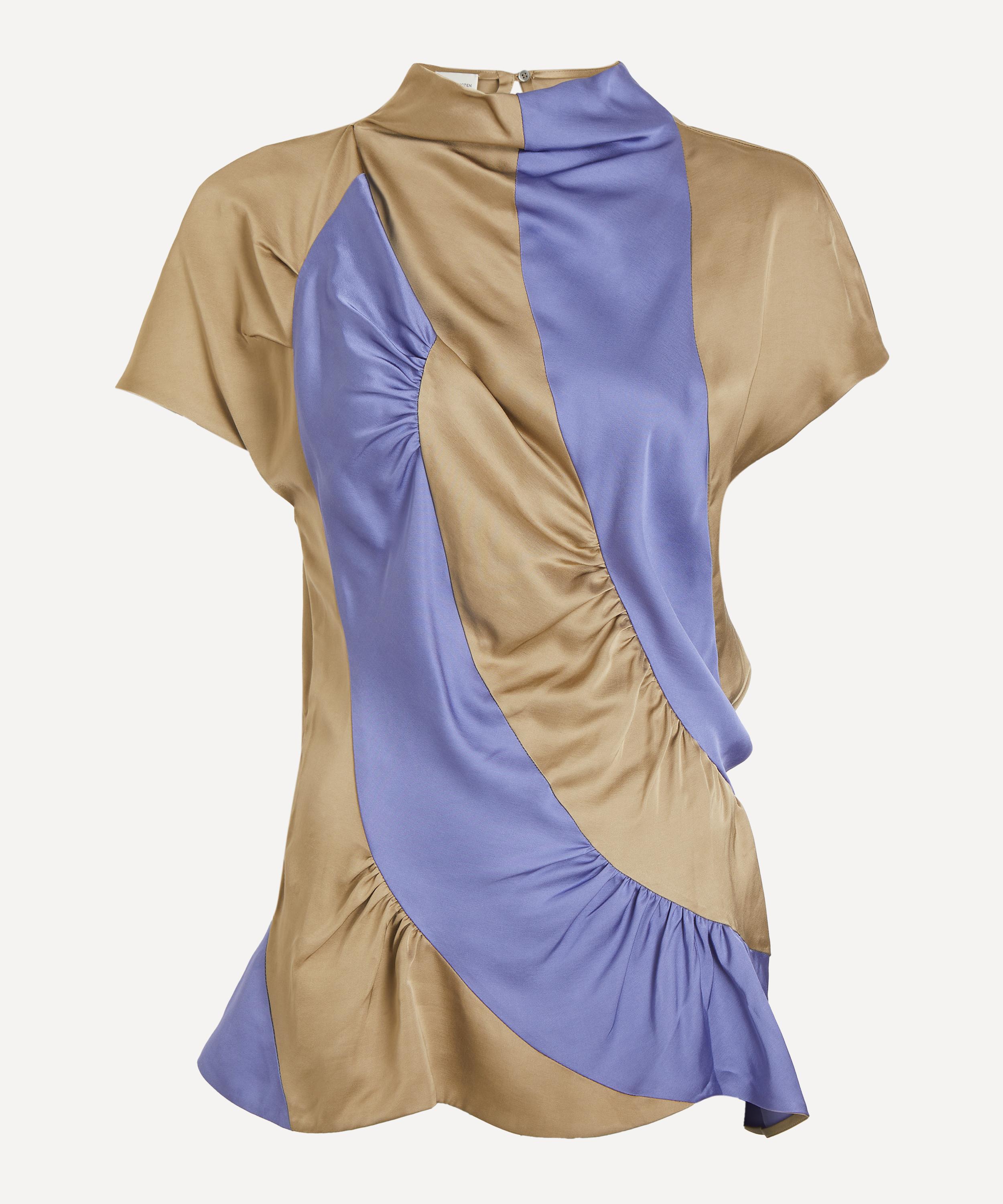 Constructed from asymmetric purple and beige satin panels, this striped shirt features a draped cowl neckline, short cap sleeves, and gathered detailing throughout, creating a bold, statement-making look.