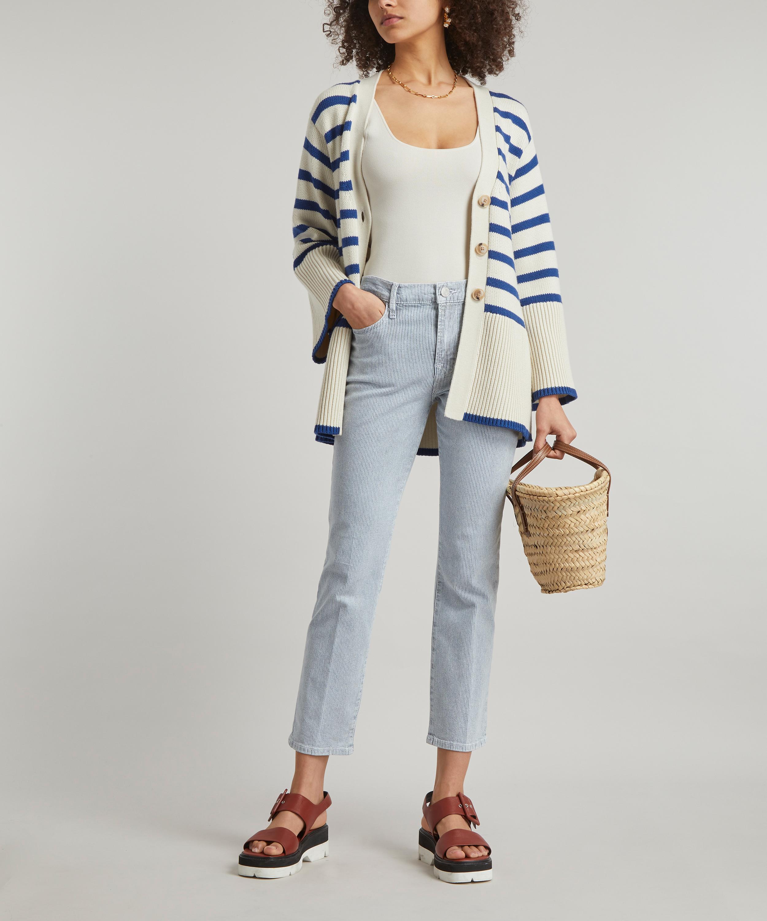 Los Angeles label Frame’s ‘dressed up casual’ aesthetic has won it legions of fans on both sides of the Atlantic. These high-rise jeans are cut for a straight-leg, relaxed fit and are finished with a soft-blue, thin vertical stripe.