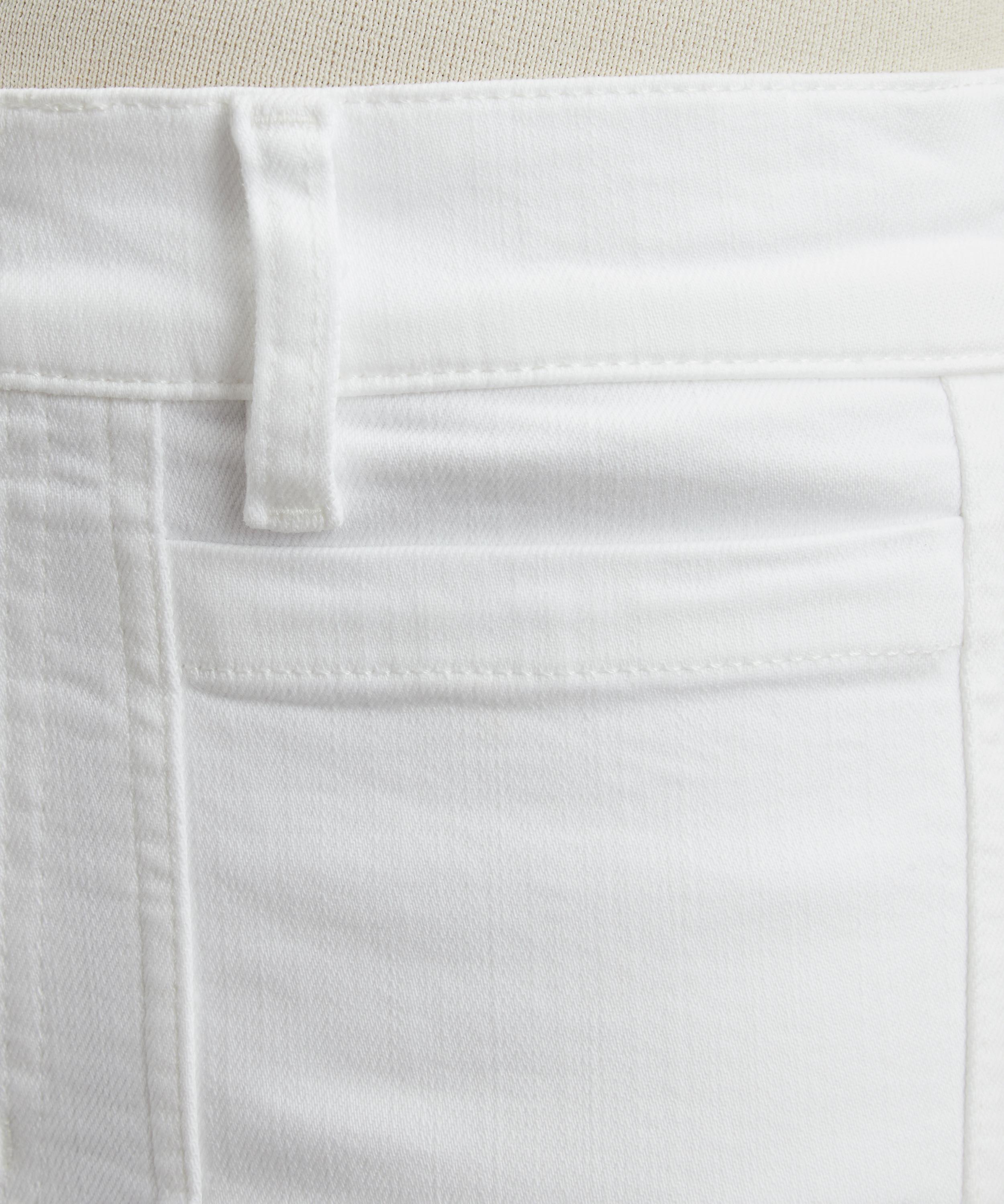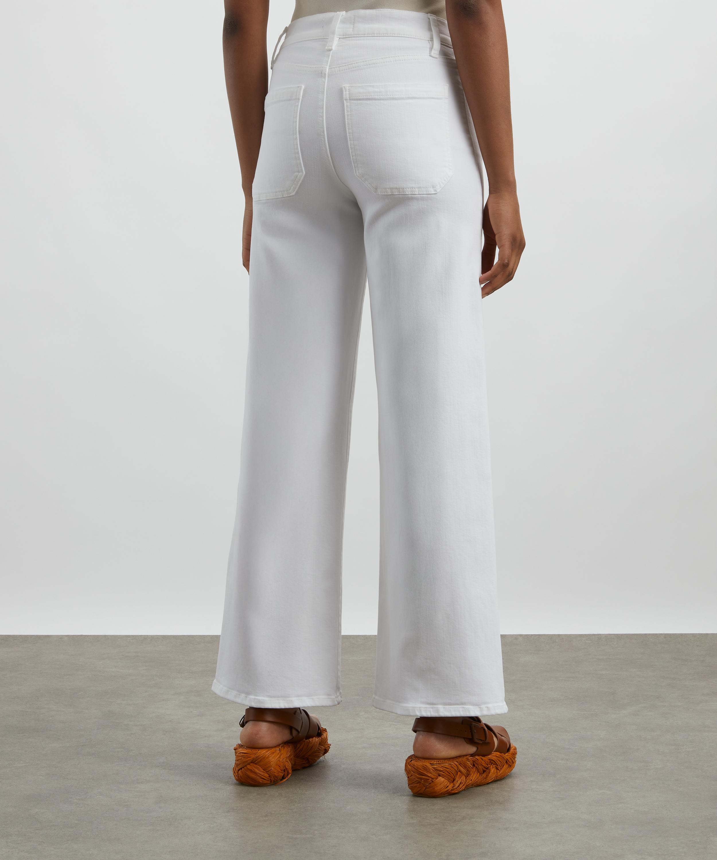 Crafted from FRAME’s signature super-stretch denim in a fresh white hue, these form-fitting jeans are cut to a high rise with subtle wide-leg flared hems that hit at the floor and are complete with chic front pocket details.