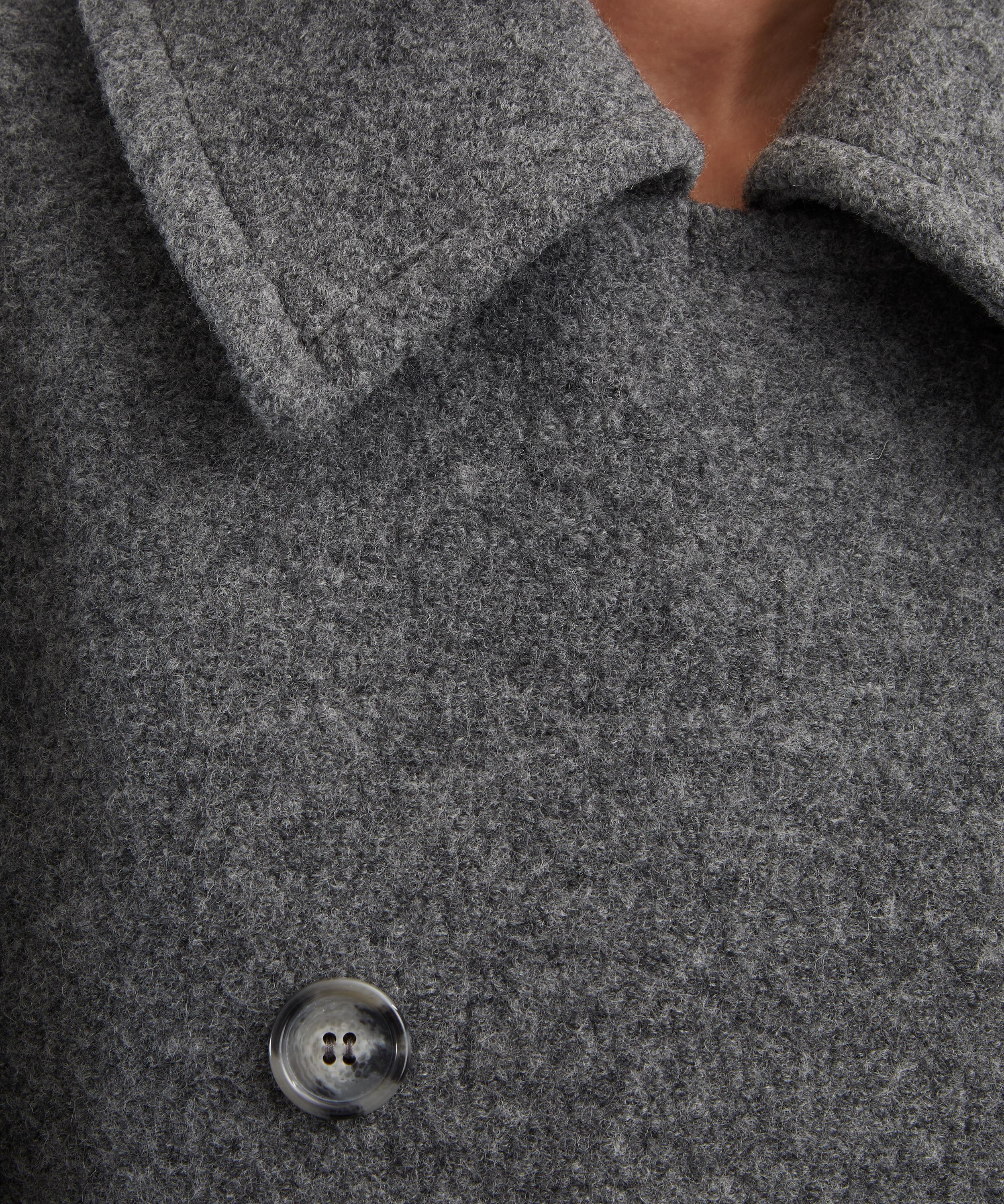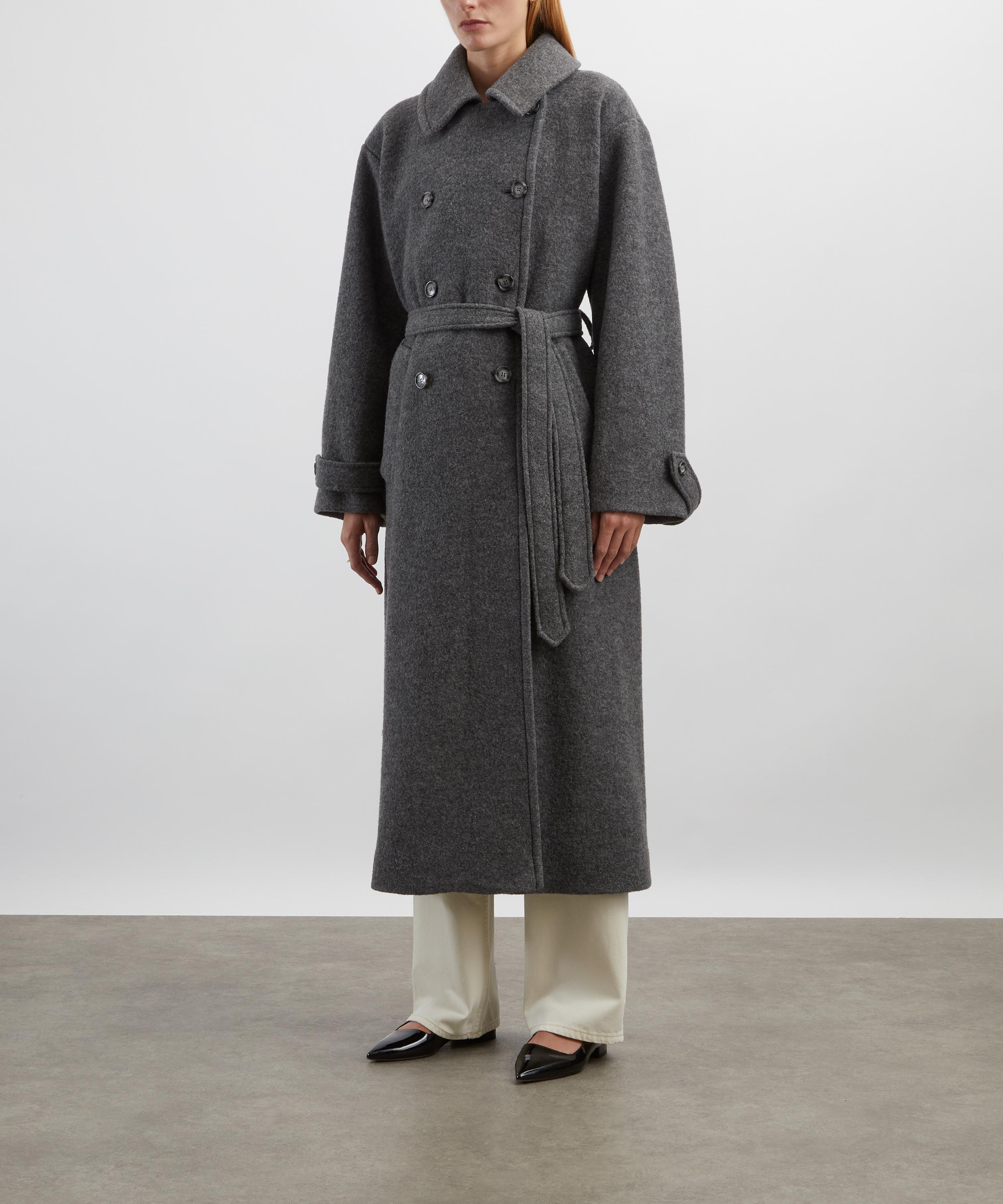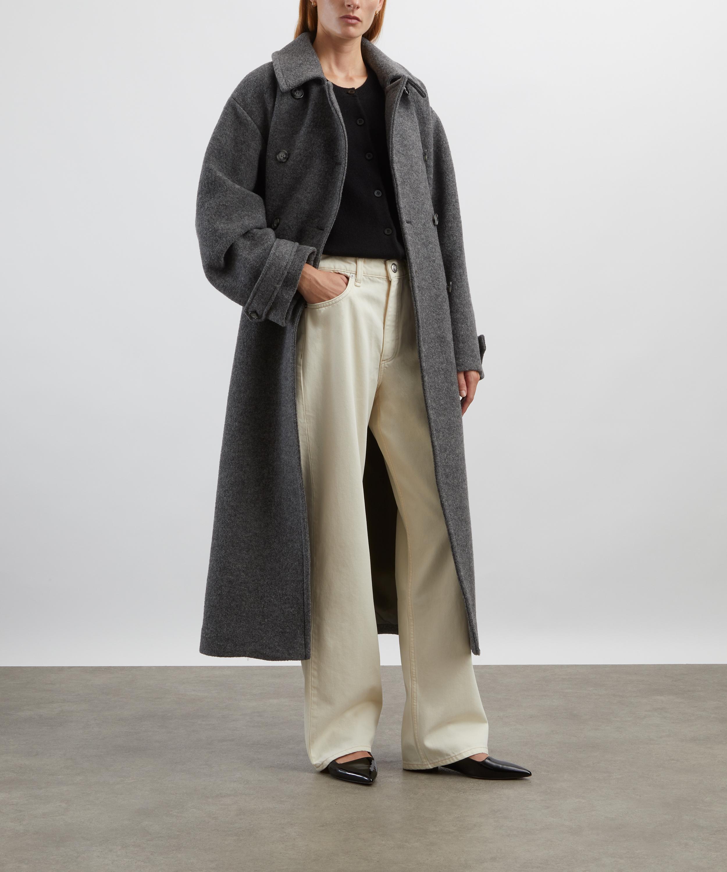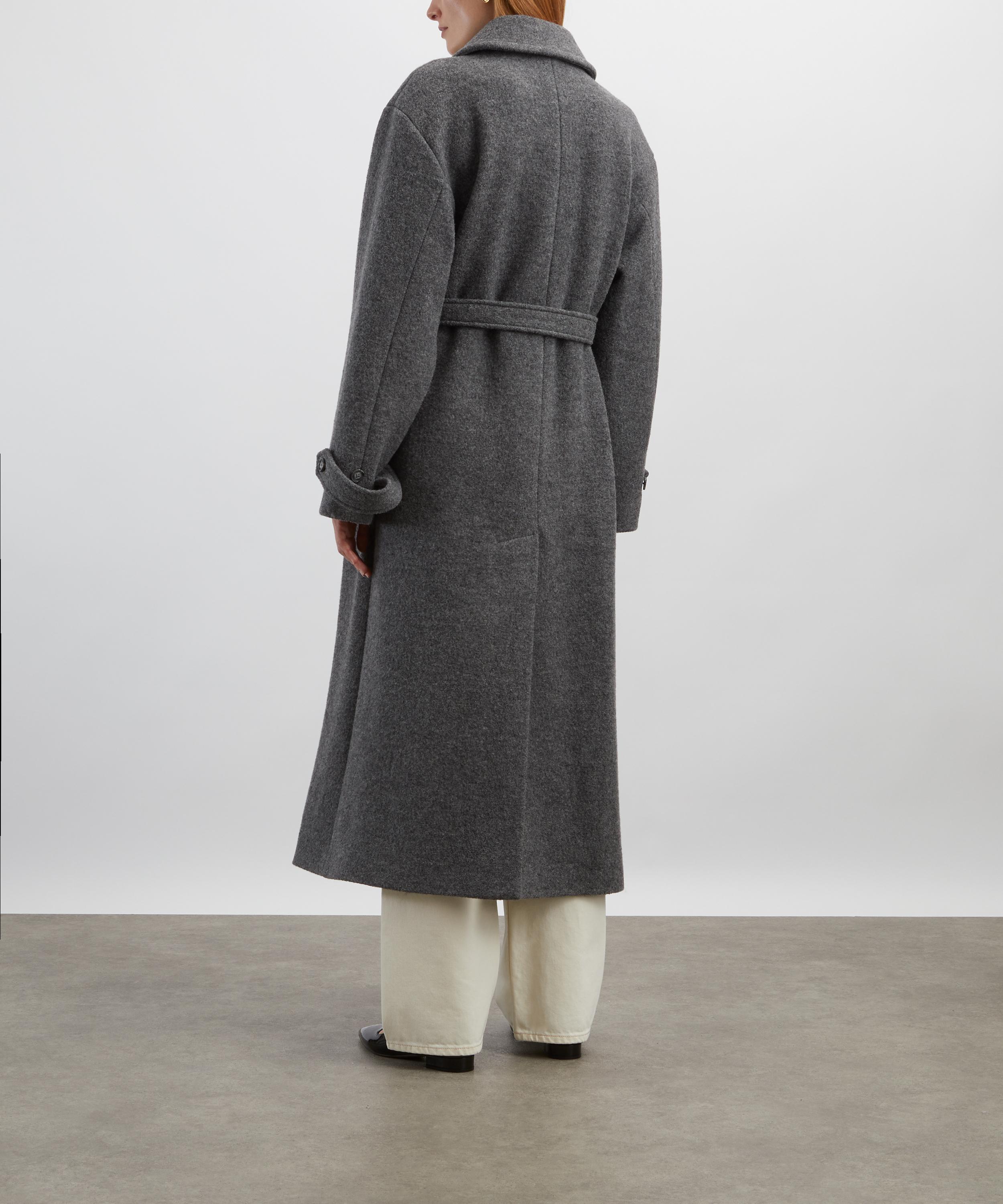 Crafted from thick wool, this grey coat is designed with a loose, ankle-length silhouette, featuring an oversized classic collar, a double-breasted front, side pockets, and a removable waist belt for a customisable, flattering fit.