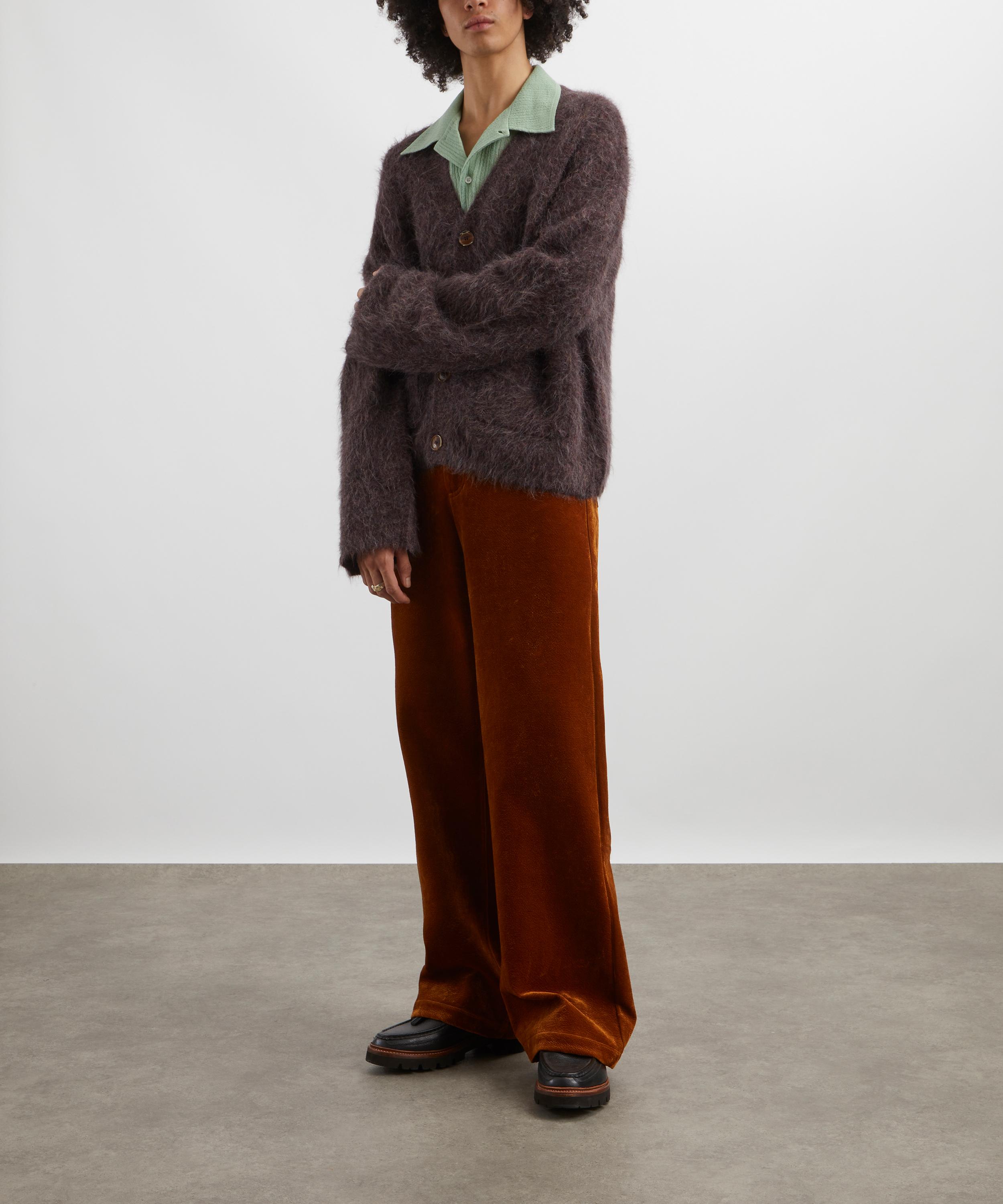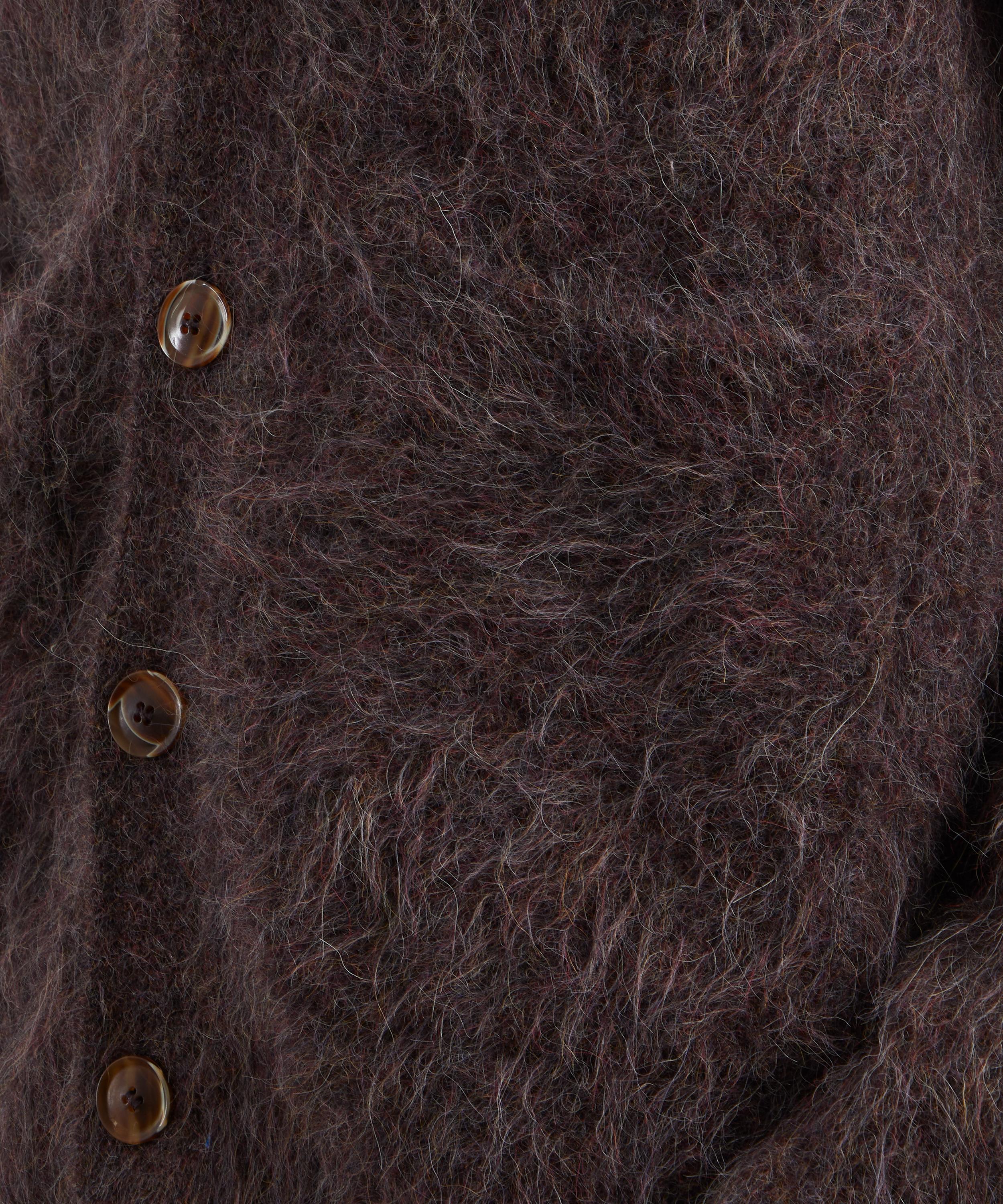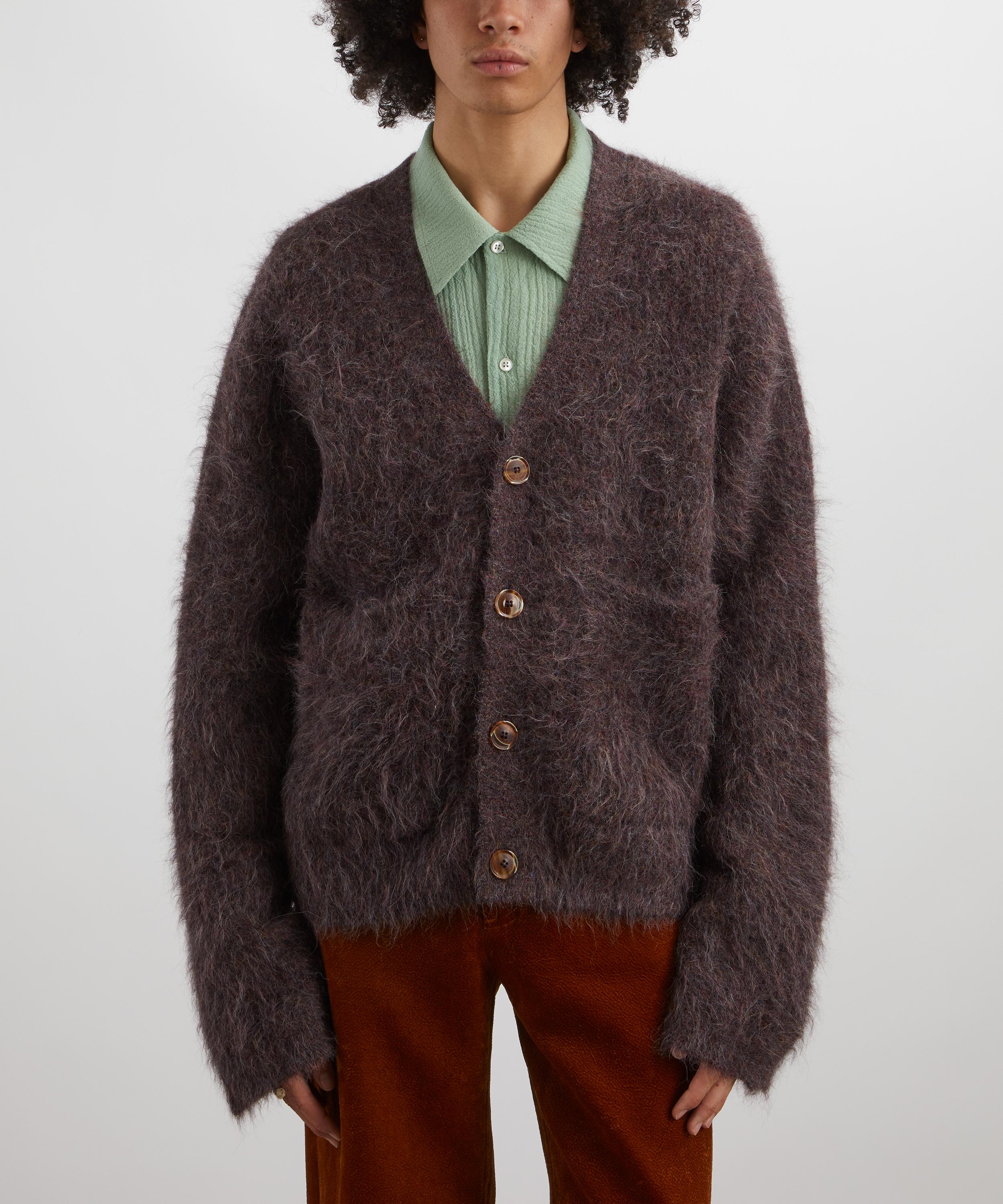 Crafted from a luxuriously soft alpaca-blend yarn with a brushed finish, this cardigan boasts a relaxed, boxy fit, a V-neckline, two patch pockets, and is secured with a horn button closure at the front.