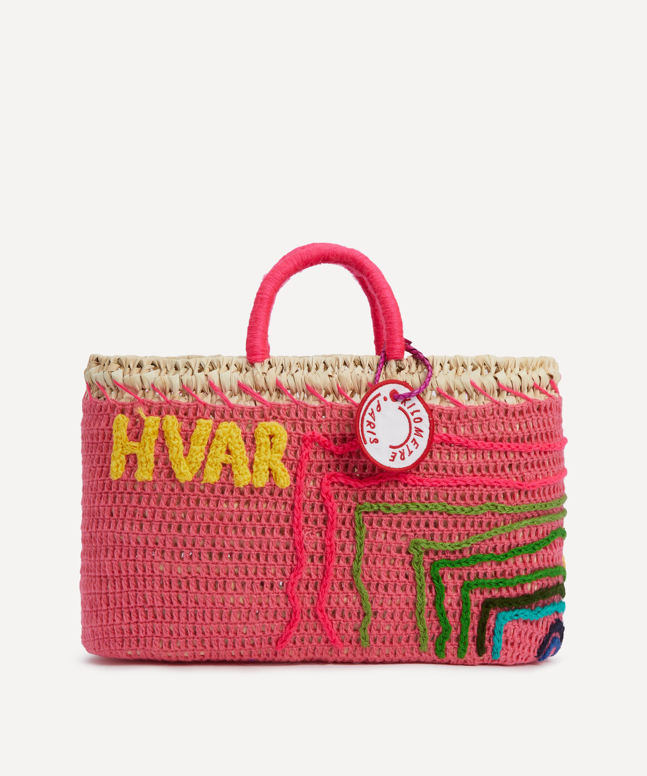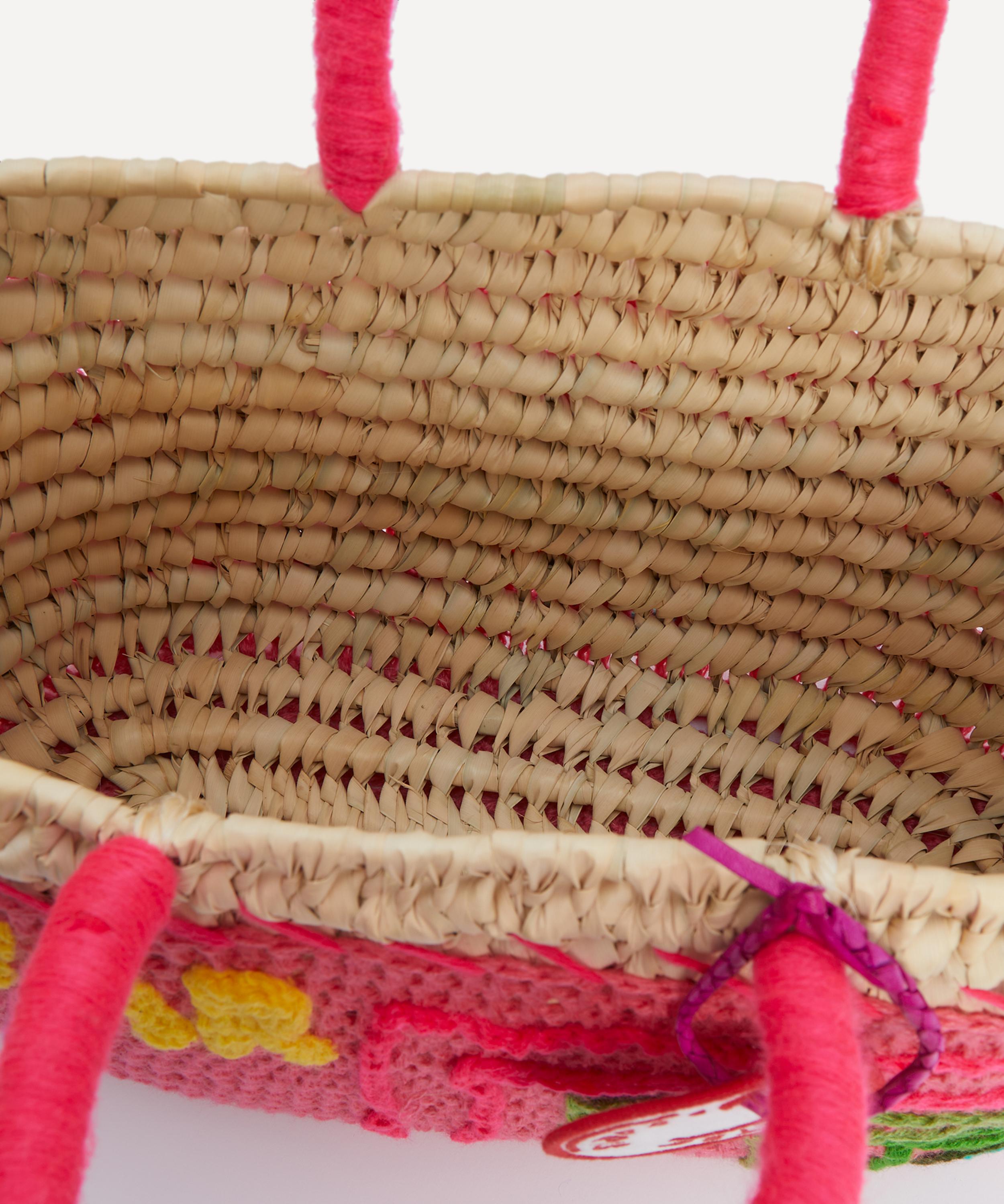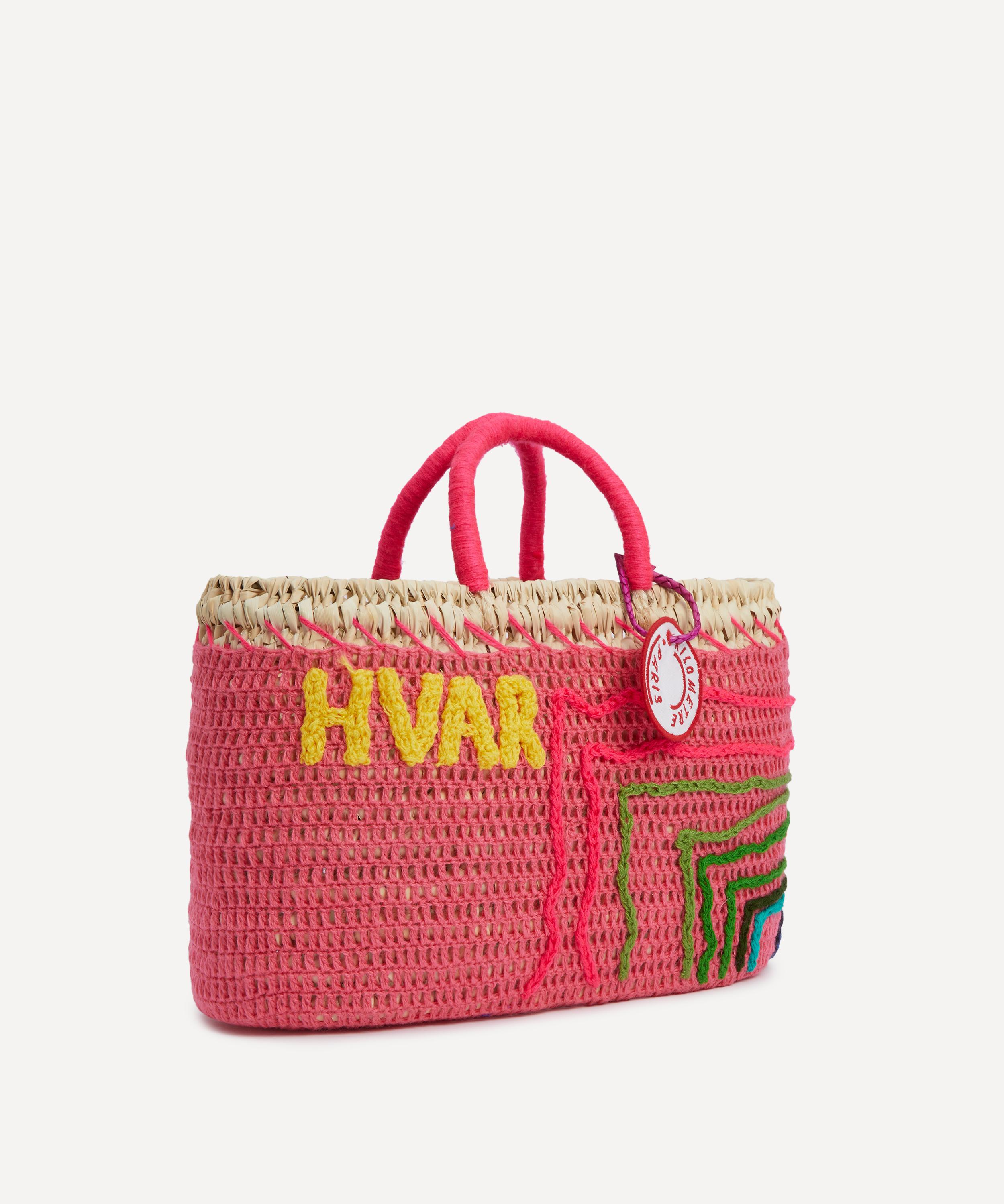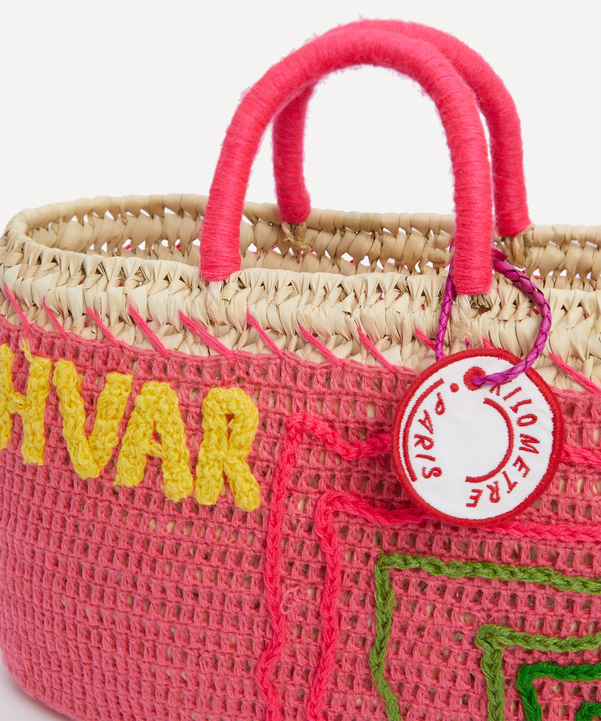 Made using time-honoured, traditional techniques cherished in Moroccan artisanship, this meticulously hand-woven palm straw bag features a colourful design, complete with text stitched across the front and two short top handles – ideal for enhancing your everyday look on trips to the market, city strolls, or balmy beach days.