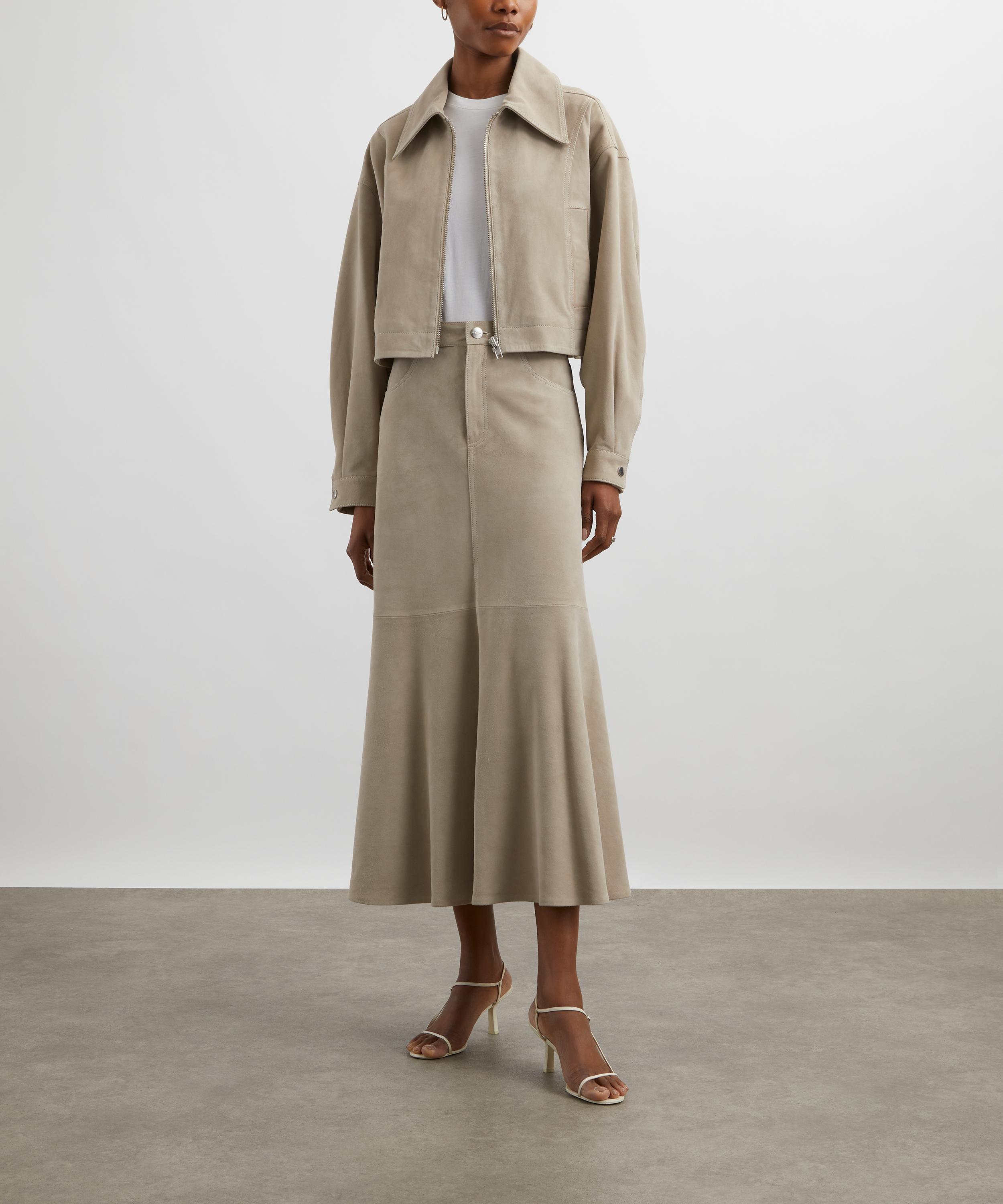 Crafted from supple suede, this cropped bomber jacket features a boxy silhouette with a spread collar, wide sleeves, and a zip fastening - offering a relaxed, contemporary twist on the classic bomber.