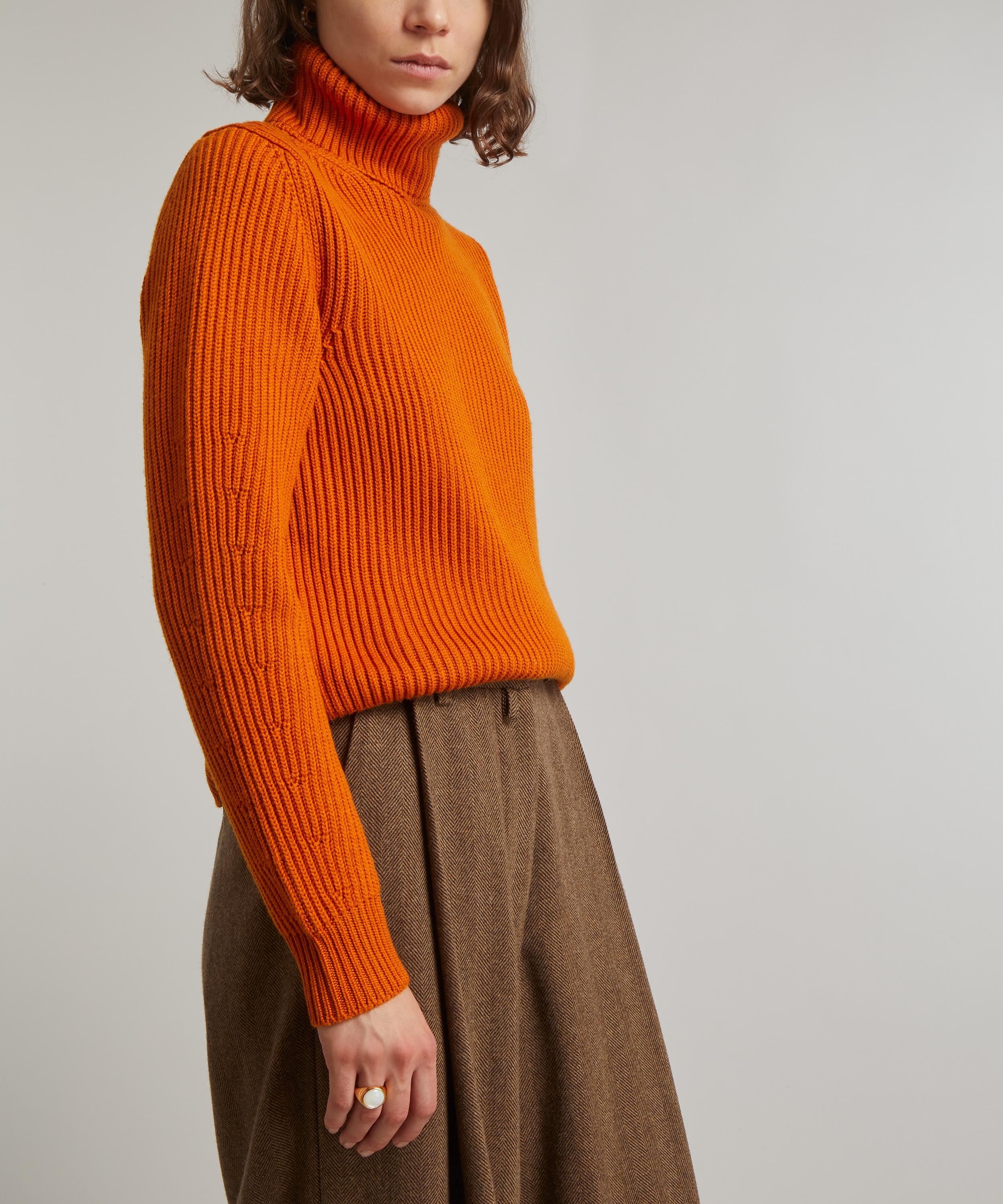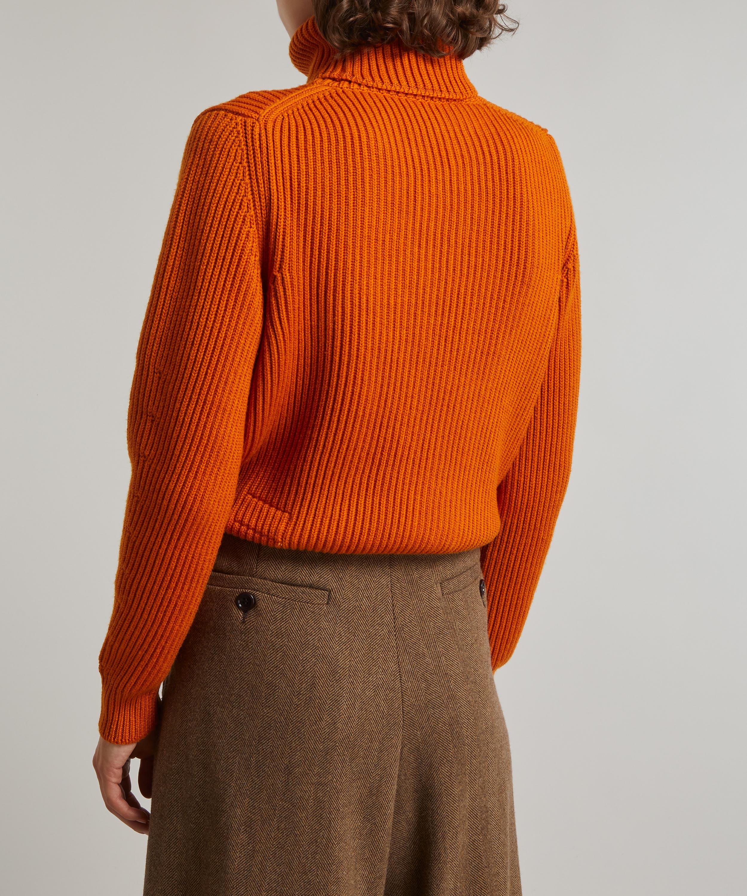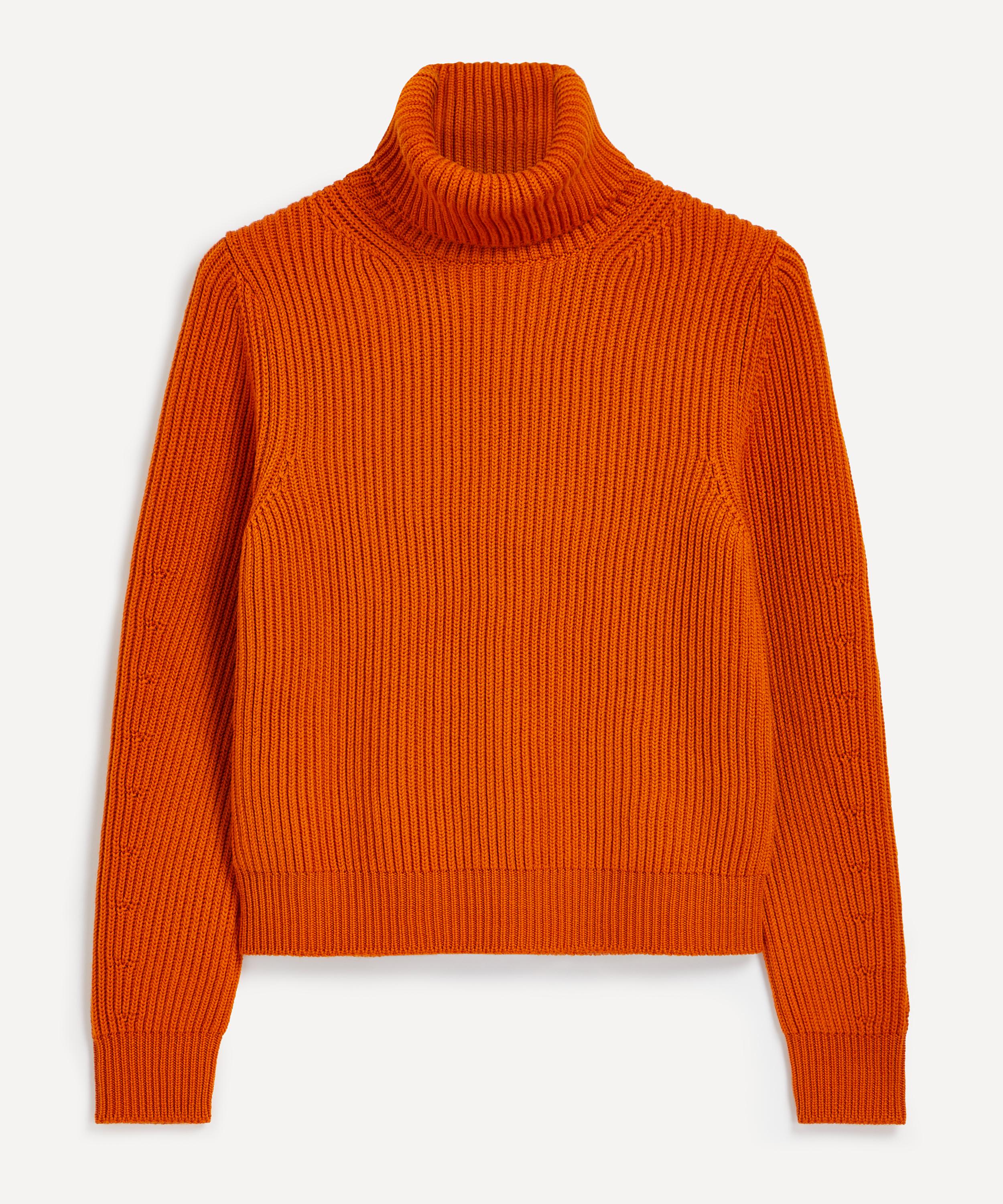 Fusing timeless tailored cuts with exceptional Italian craftsmanship, Fortela’s Leona cardigan perfectly encapsulates the brand’s signature sartorial savoir. Inspired by classic Americana knitted styles, this ribbed pullover is stylishly snug with its chunky turtleneck collar and slouchy long-sleeves. Crafted from super-soft Merino wool yarns to a relaxed fit, its vibrant orange hue instantly elevates your everyday winter edit.