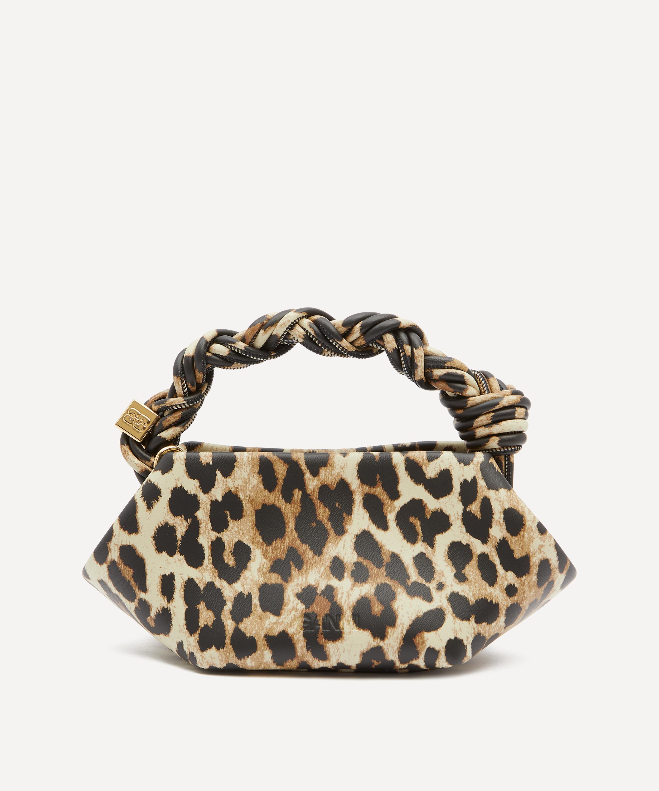 The Mini Bou top handle bag is a signature style by millennial-favourite brand Ganni. Staying true to the brand's coveted cool-girl image, this bag is characterised by a structured, hexagonal silhouette in an all-over leopard print, and a twisted top handle with a braided knot and metallic dice engraved with Ganni’s butterfly logo. Further equipped with a magnetic closure and one main compartment, it’s finished with a detachable shoulder strap that can be worn crossbody or over the shoulder for an effortlessly stylish alternative to your usual day bag.