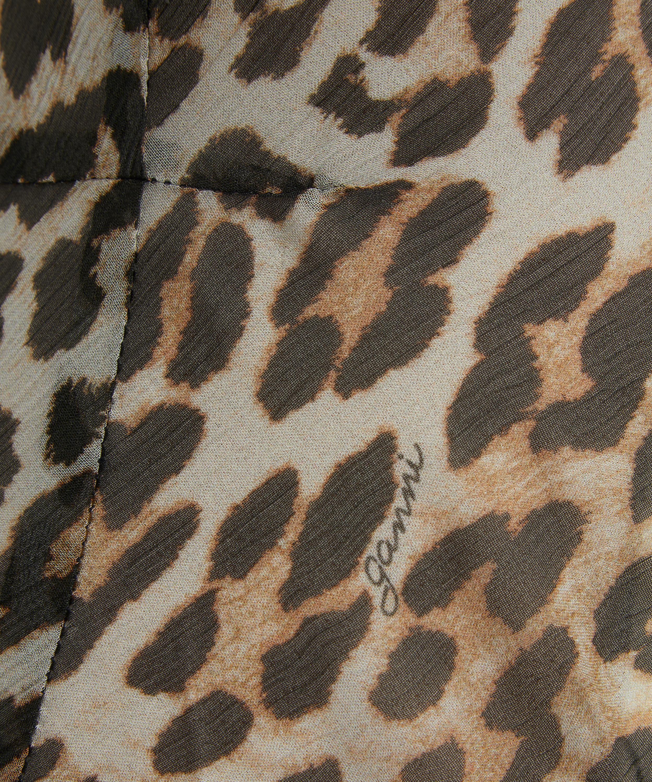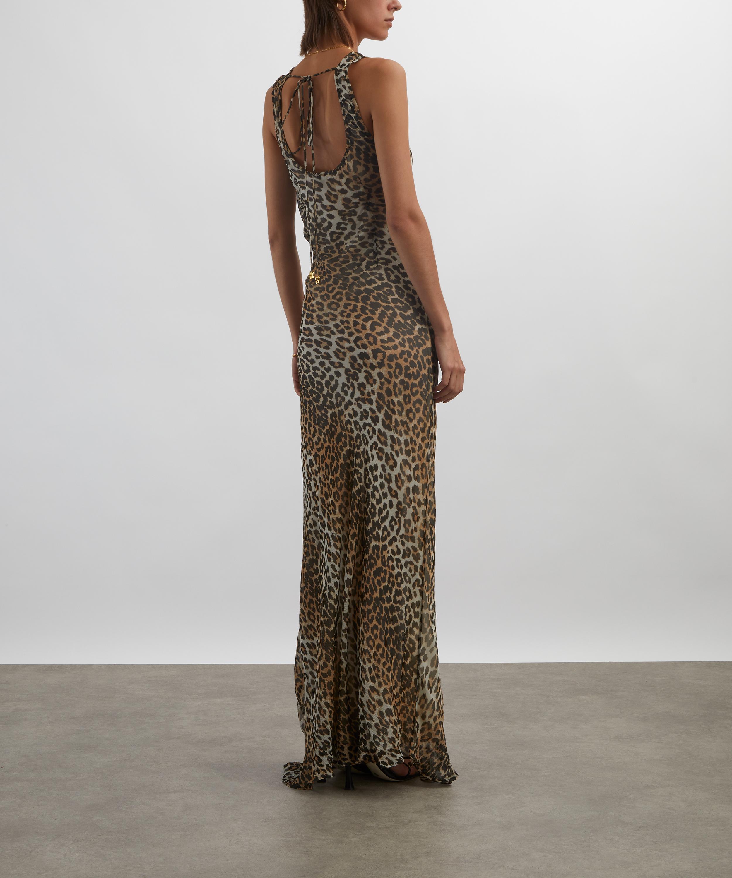 Crafted from crepe adorned with GANNI’s signature leopard print, this maxi dress offers a sleeveless, slim-fit silhouette complete with a scoop neckline and an open back with delicate tie strings - blending timeless sophistication with a modern edge.