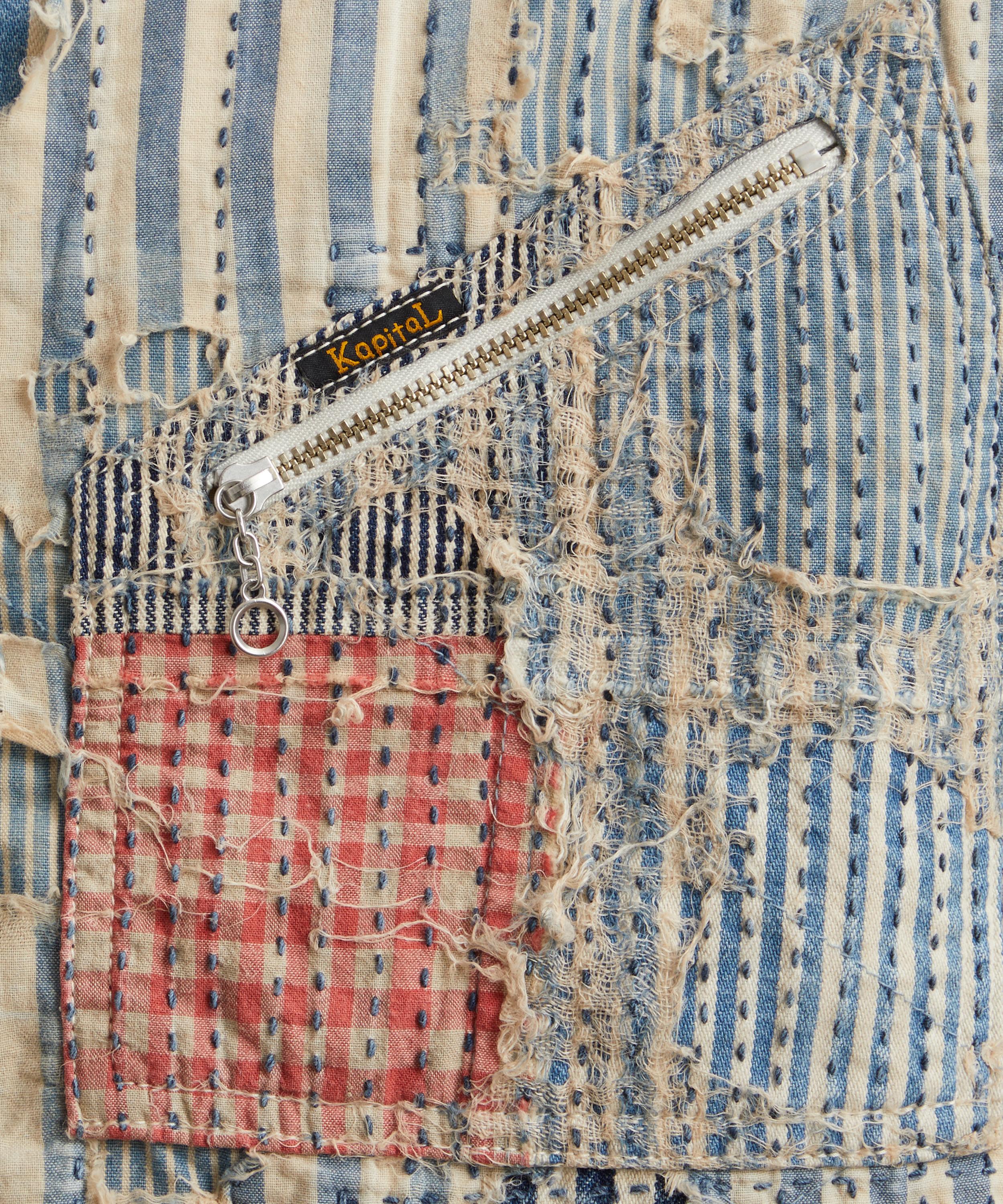 Made in Kojima, Okayama in Japan from disparate scraps of cotton and linen-blend cloth patterned with contrasting striped patterns, this blouson jacket highlights Japan’s ancient ‘Boro’ mending technique. Combining style and functionality, it features two patch pockets and a double-ended zip closure.