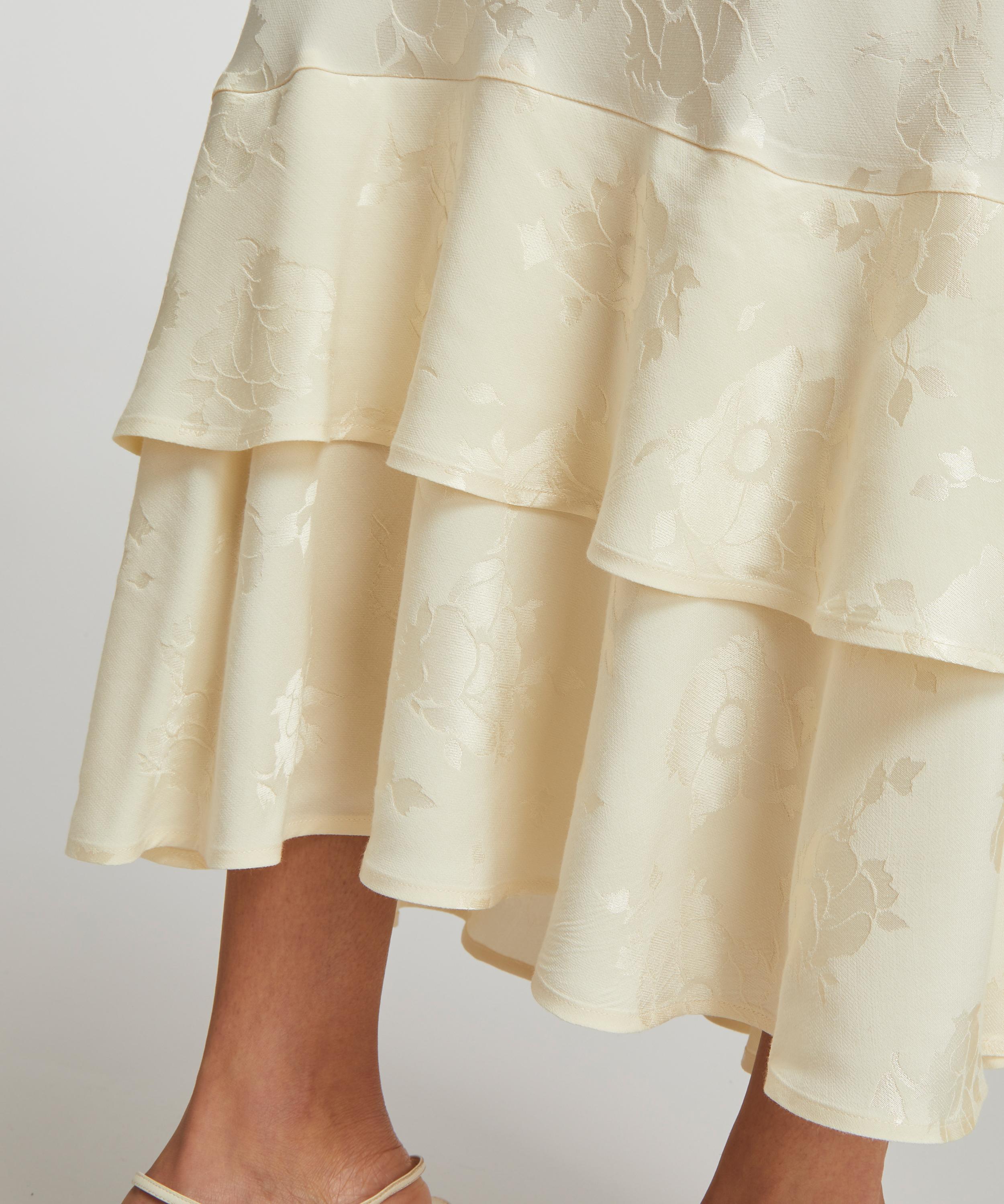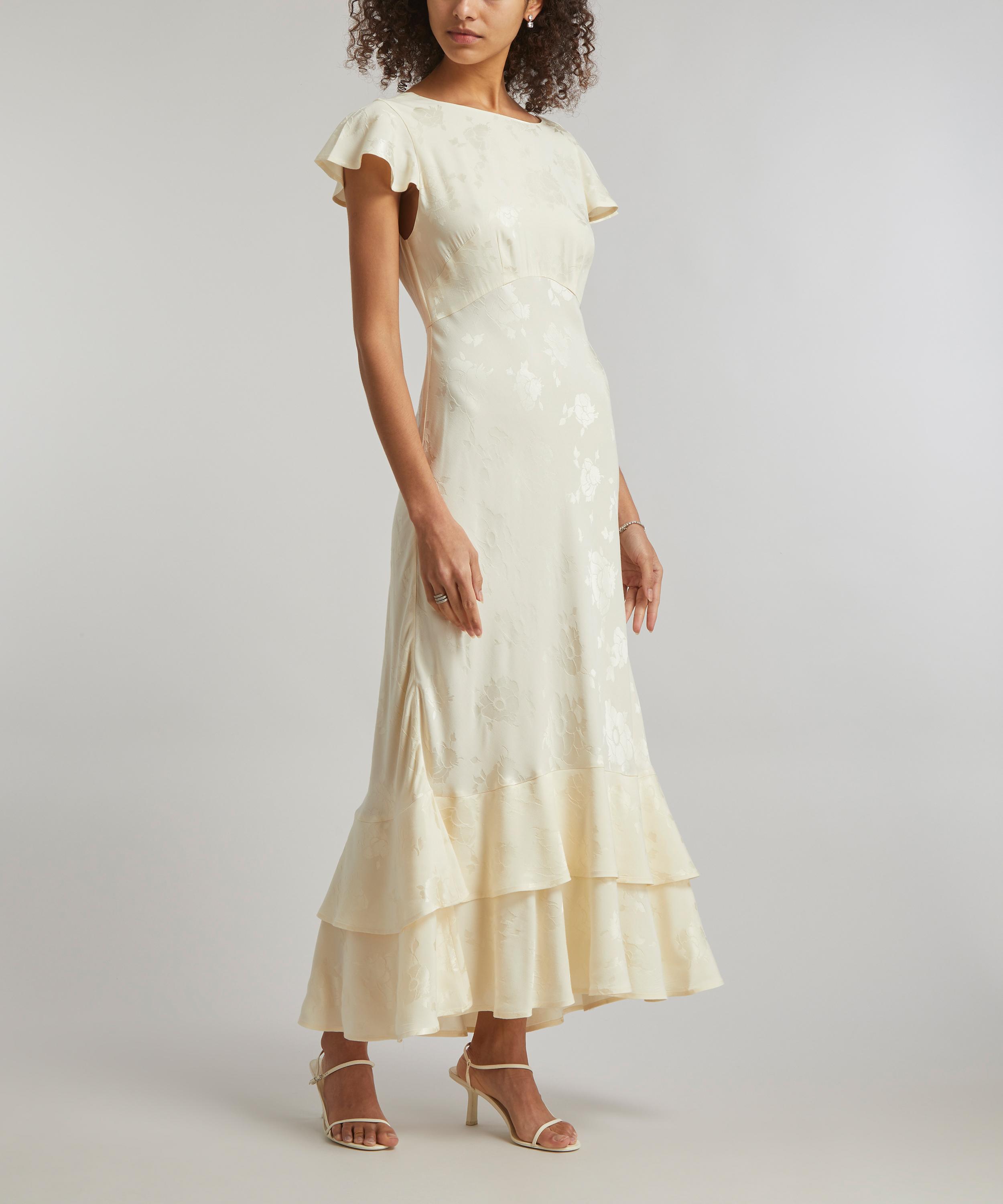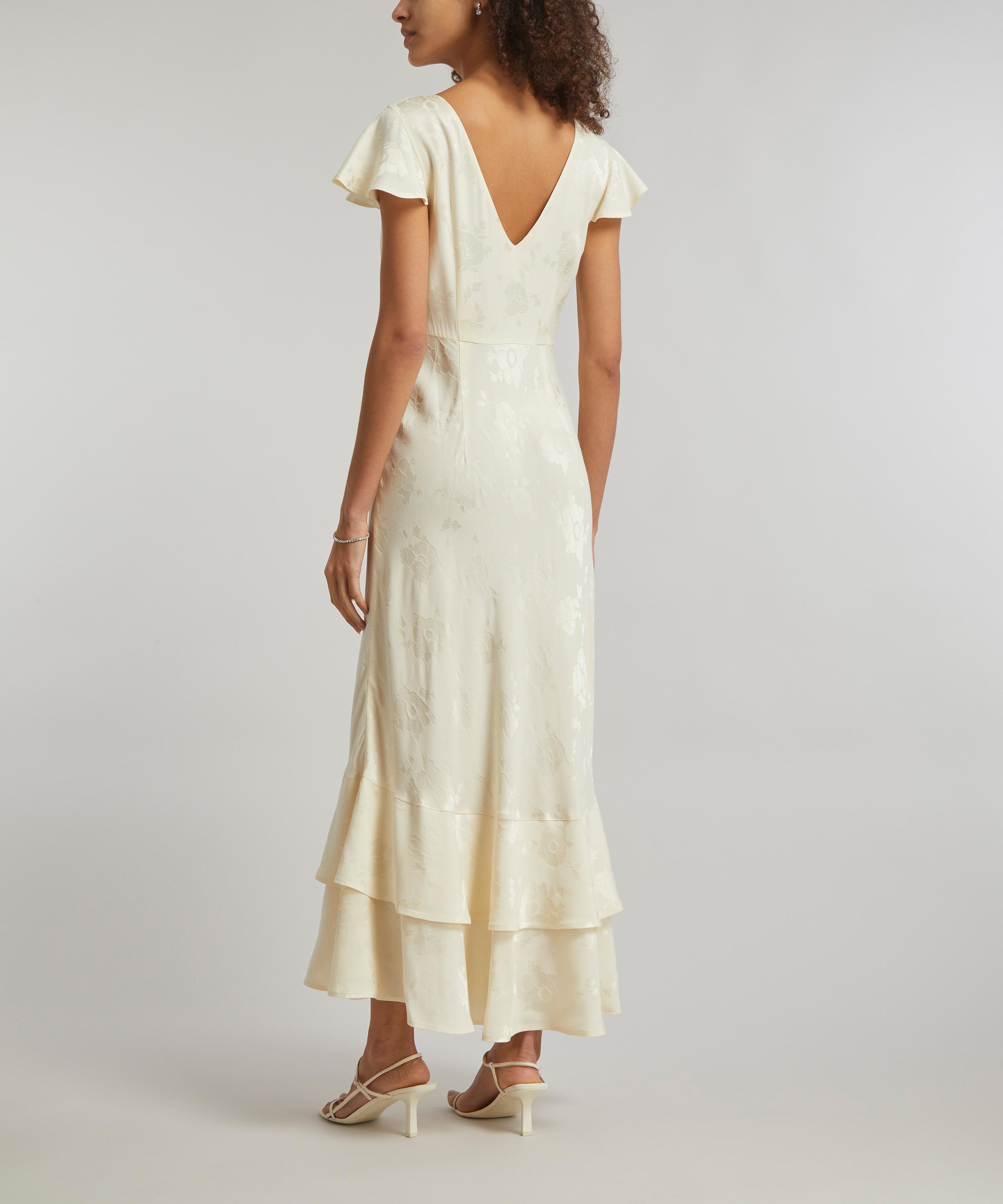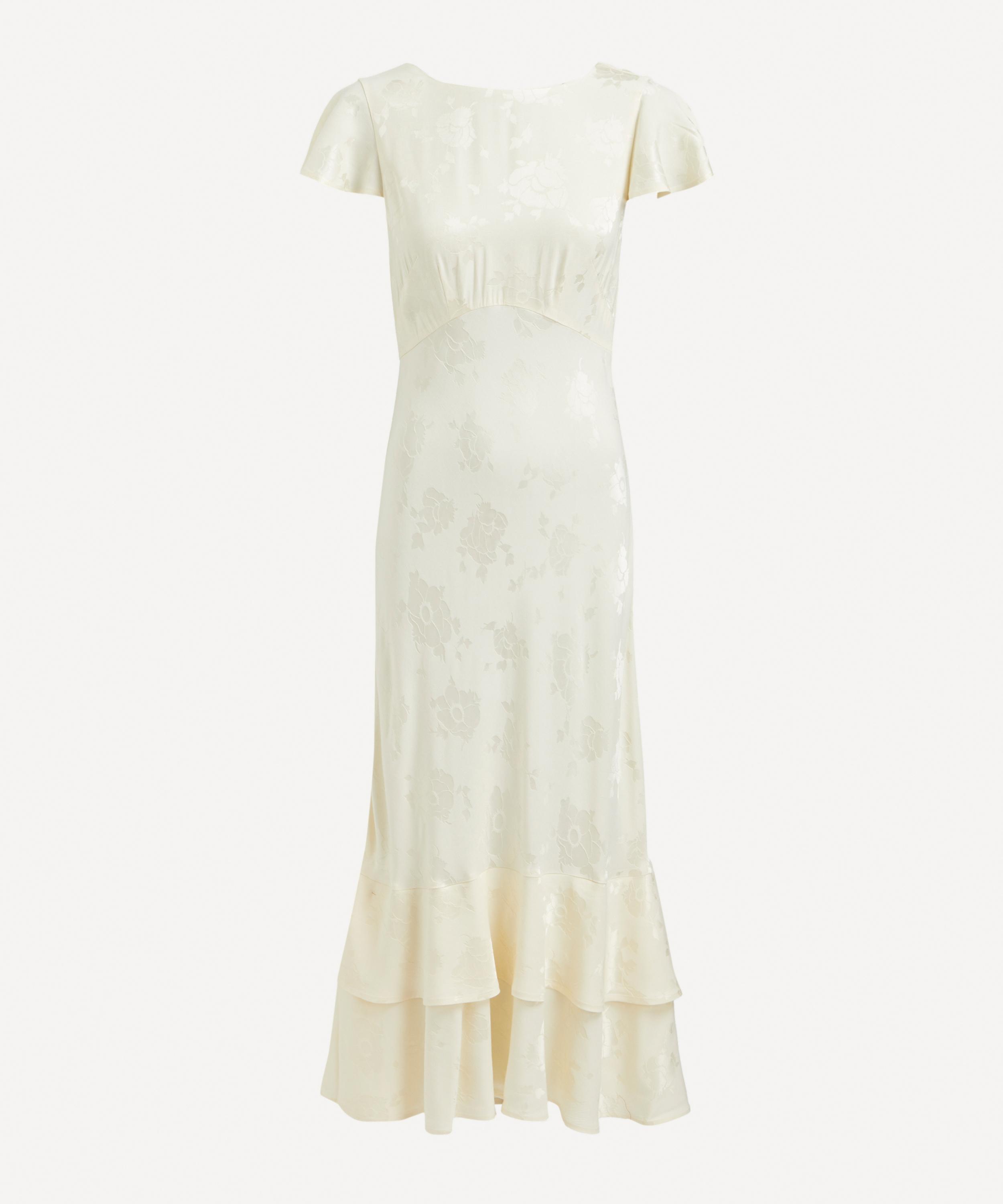 Effortlessly flattering and feminine, RIXO’s vintage-inspired bridal styles look as beautiful in antique frames as they do on Instagram – the Liberty dress is no exception. Cut from ivory viscose-jacquard adorned all-over with a delicate poppy print, this figure skimming dress boasts fluttery cap-sleeves and a flattering empire-waistline that falls to a flowy, tiered hem that’s perfect for dancing the night away in.