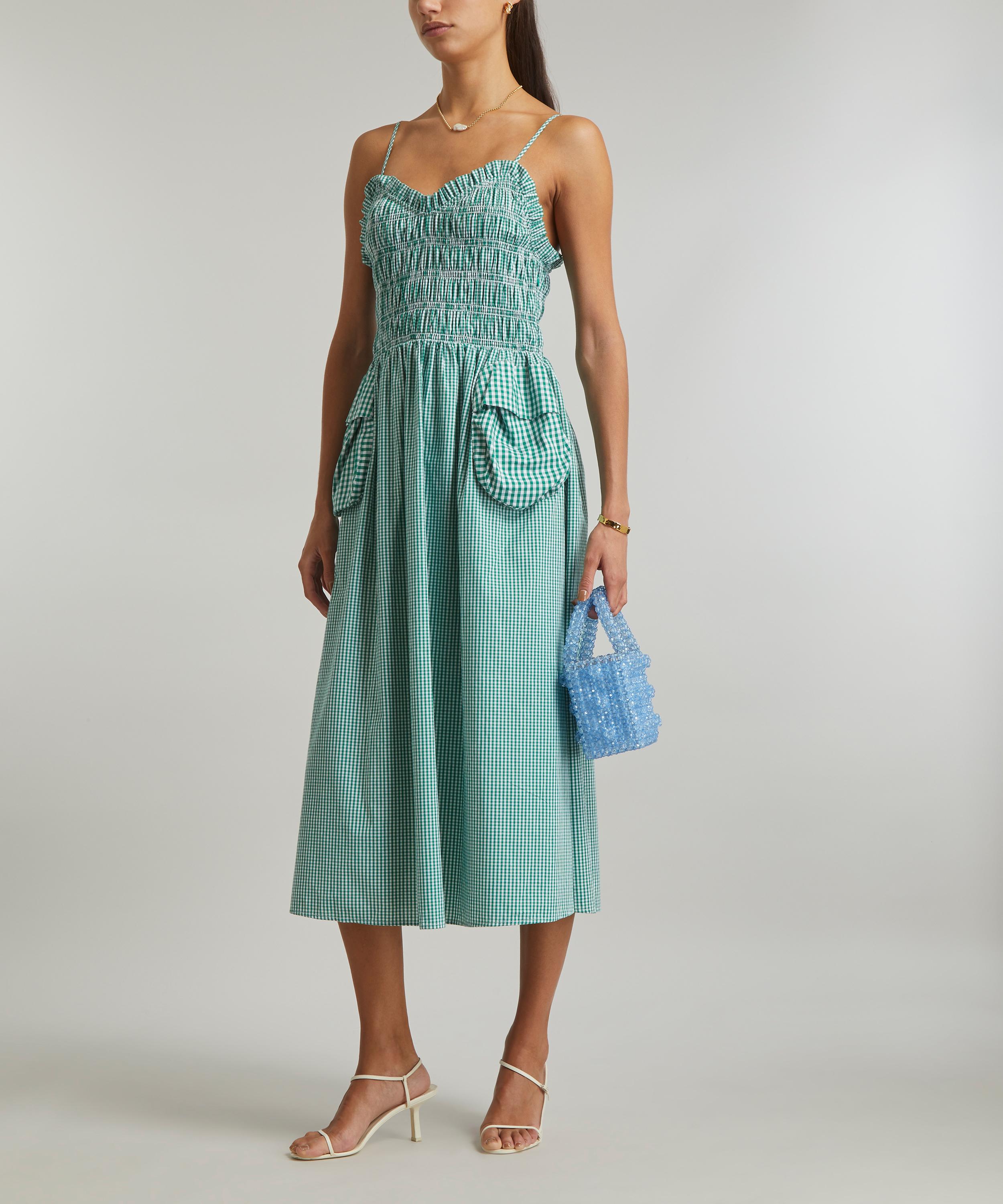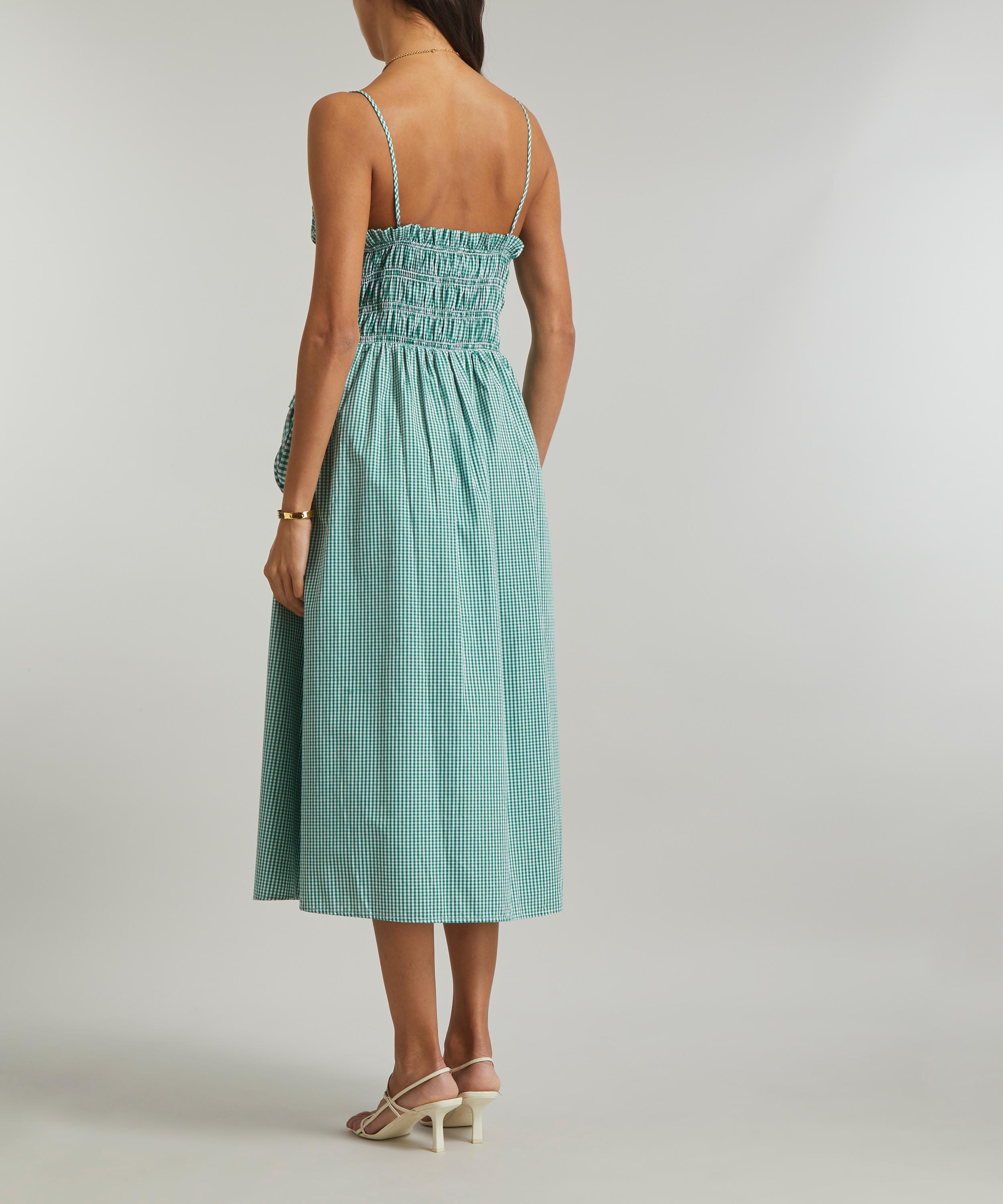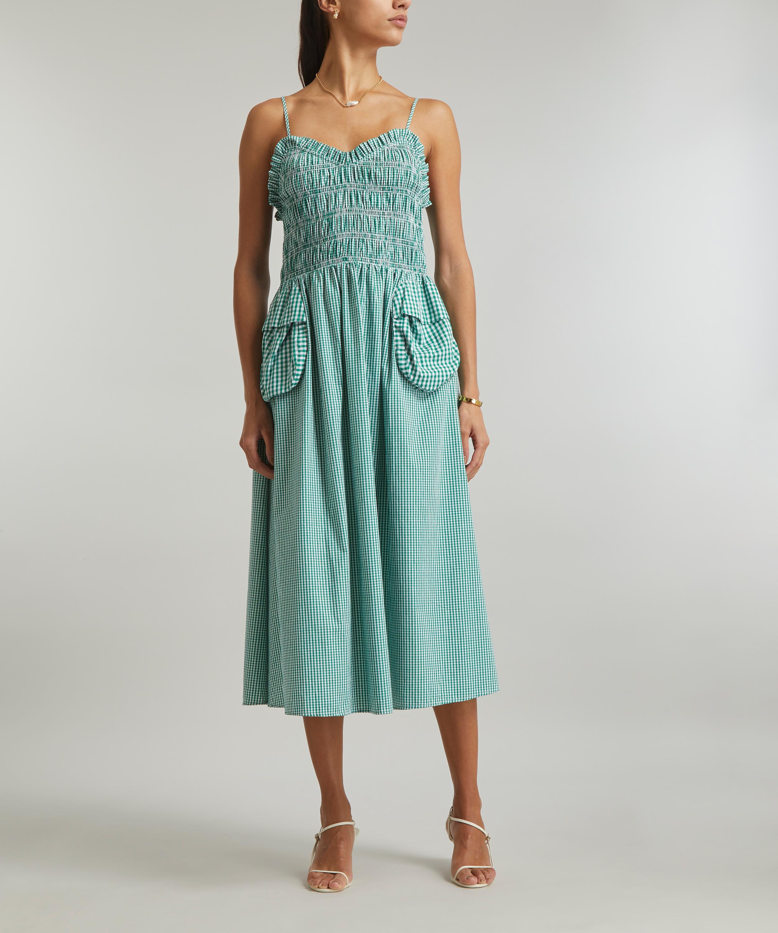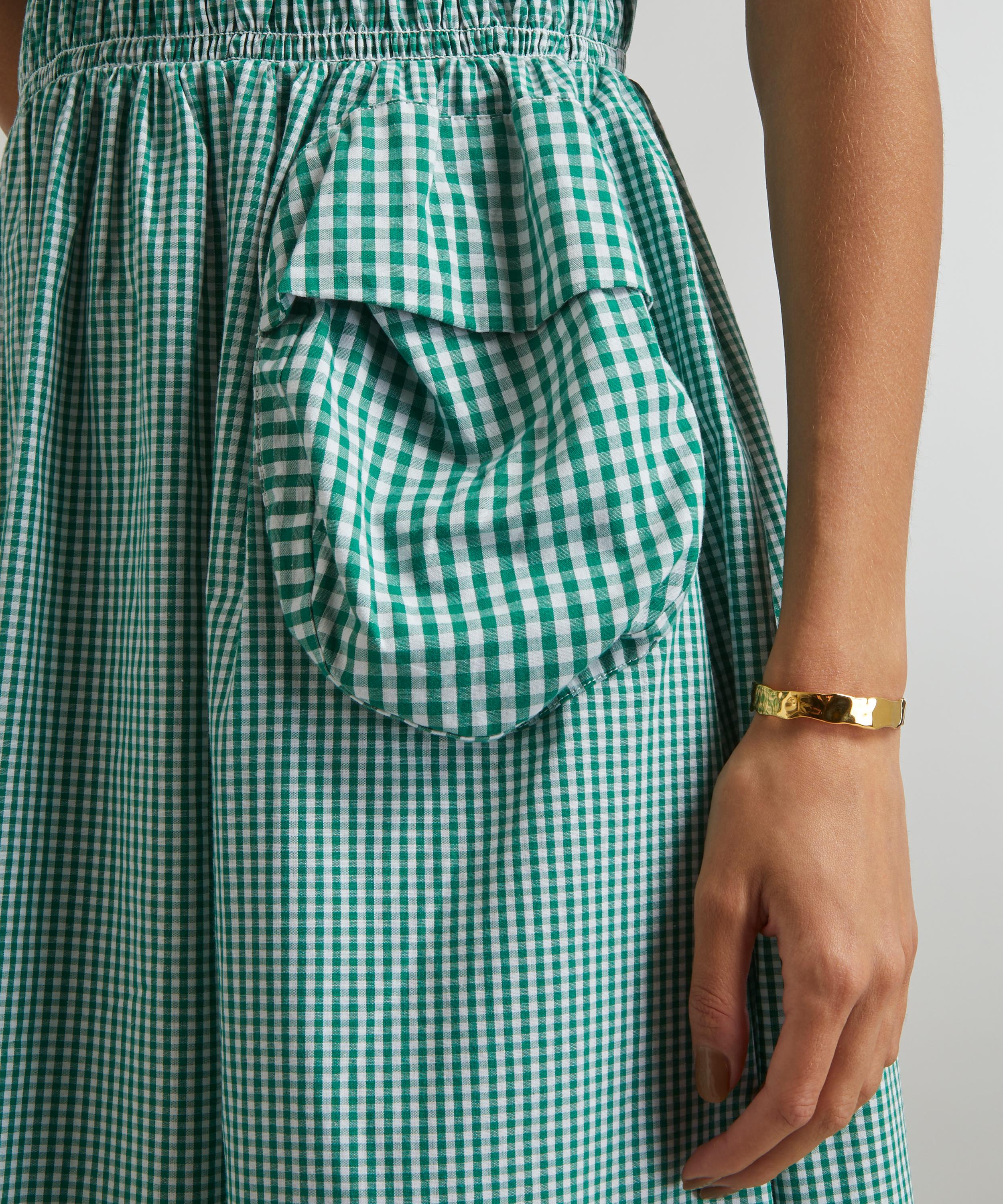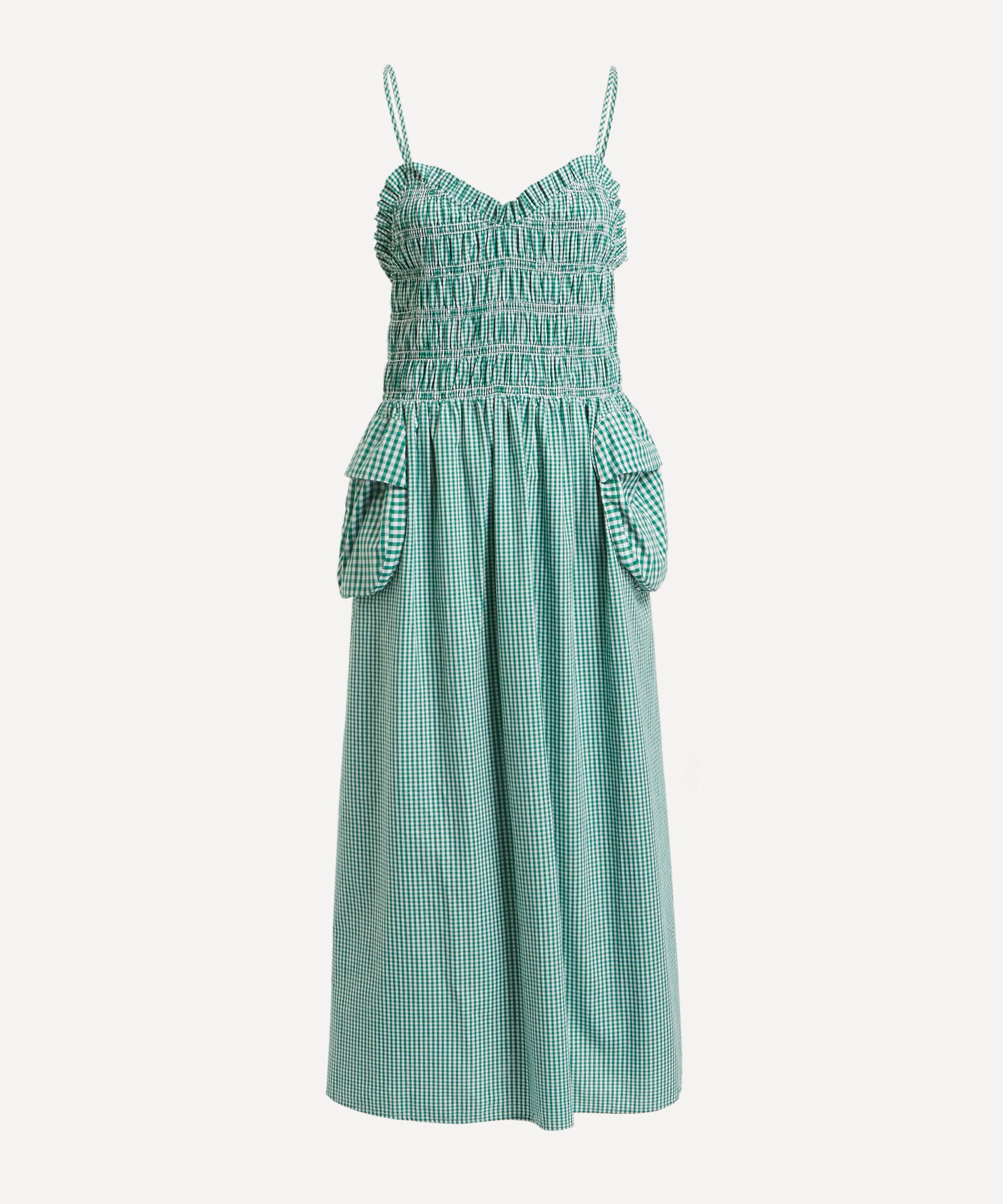 Shrimp’s signature Liberty dress is updated for the new season in a folkish green and white gingham check. Lightweight and loose, it’s made for summer days with its smocked bodice featuring a frilled neckline, spaghetti-straps and a gently gathered skirt, fitted with functional flap-pockets.