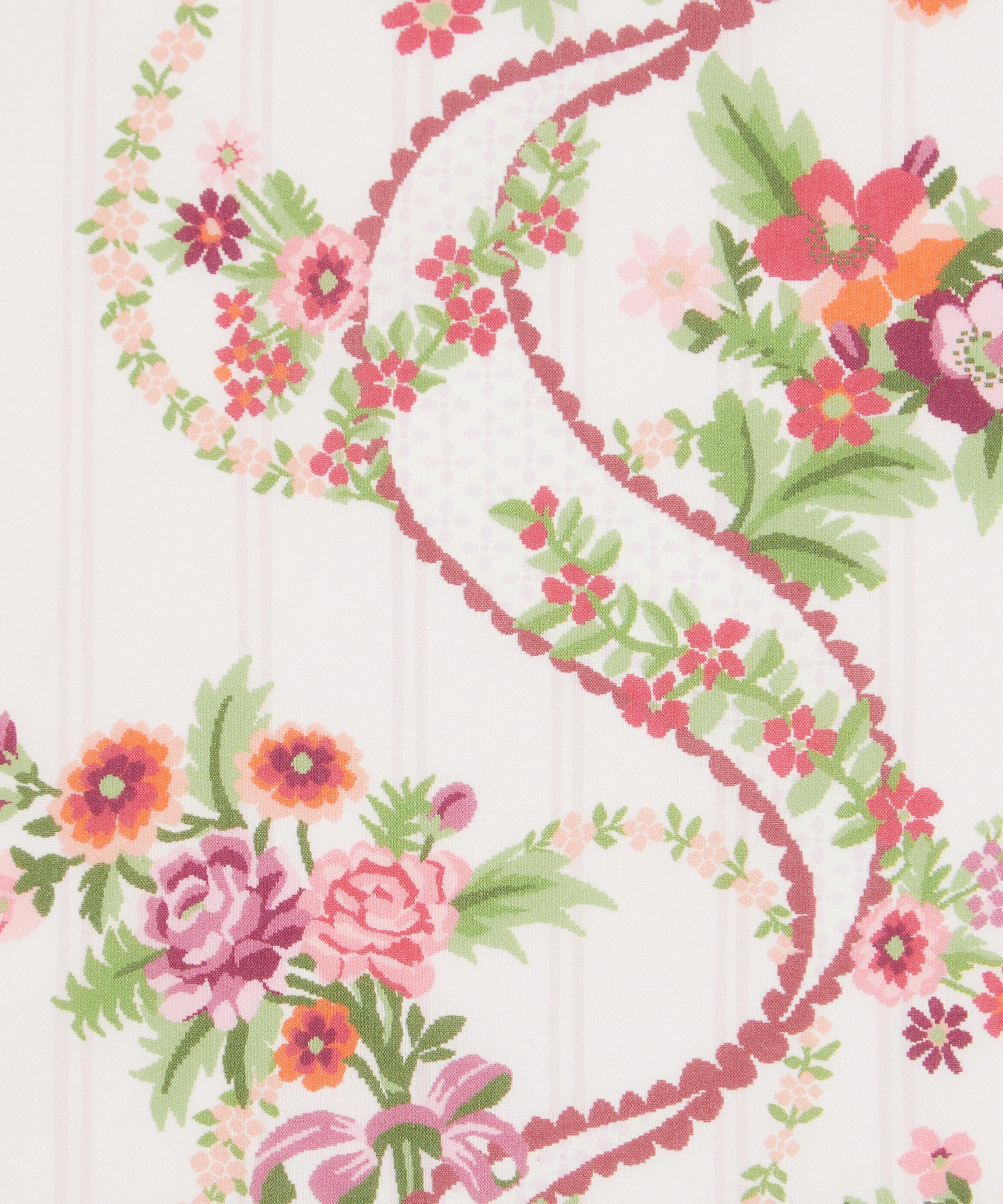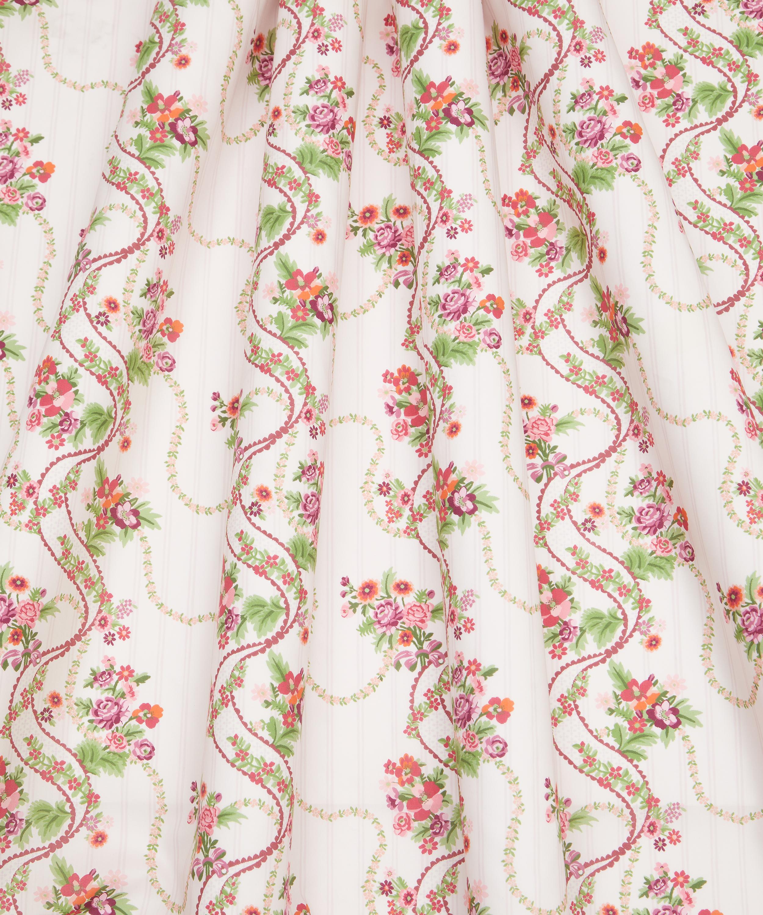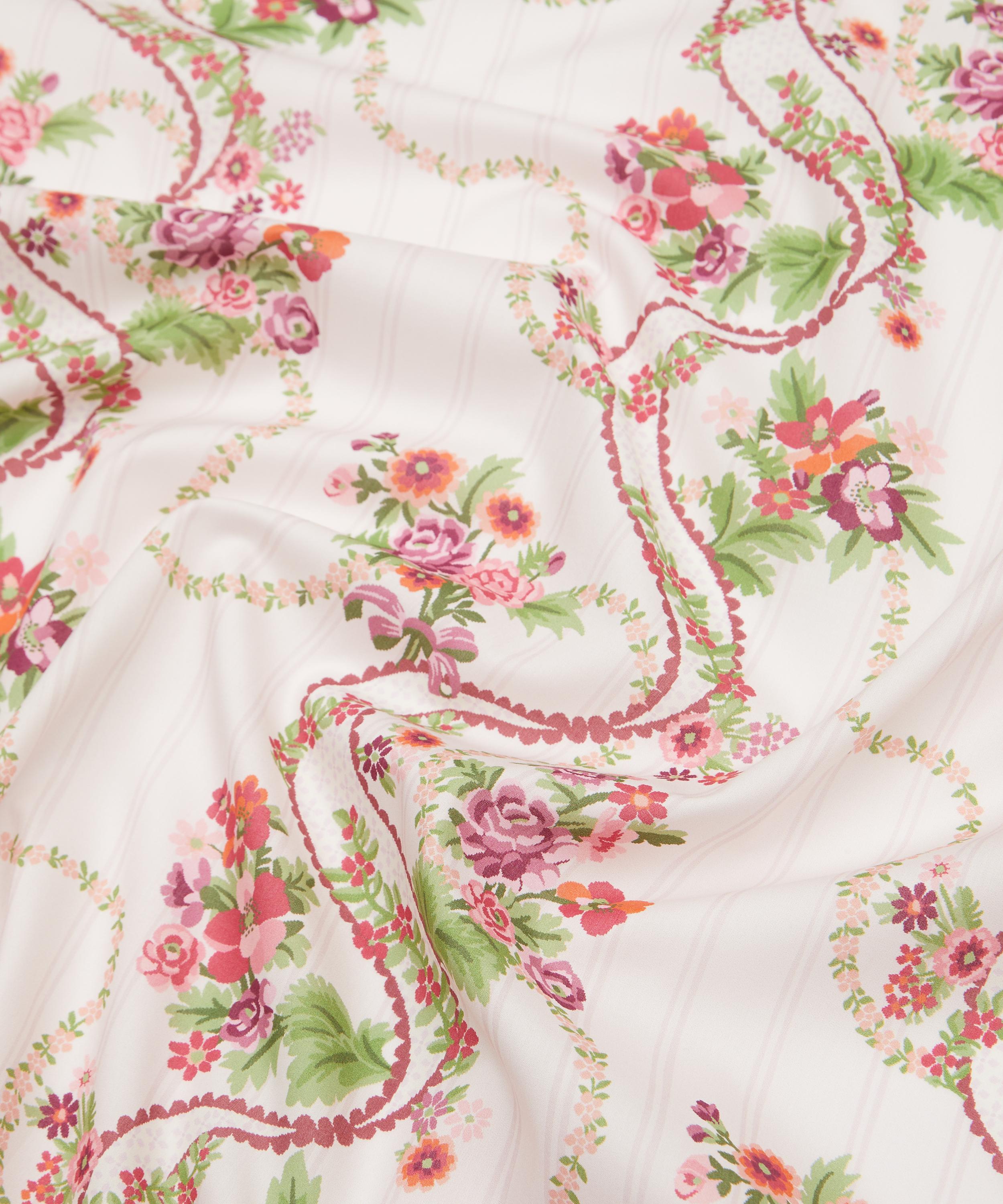 Inspired by a collection of 18th century hand-painted point papers from the Liberty archive, this design exudes poetic allure and graceful fluidity. Nostalgic rose, poppy, and daisy bouquets peek through finely embroidered ribbons and cascading floral chains, enhanced by a palette of soft pastel hues. The design takes on an eclectic twist with the addition of a fine background stripe, exuding a sense of whimsy and sophistication.