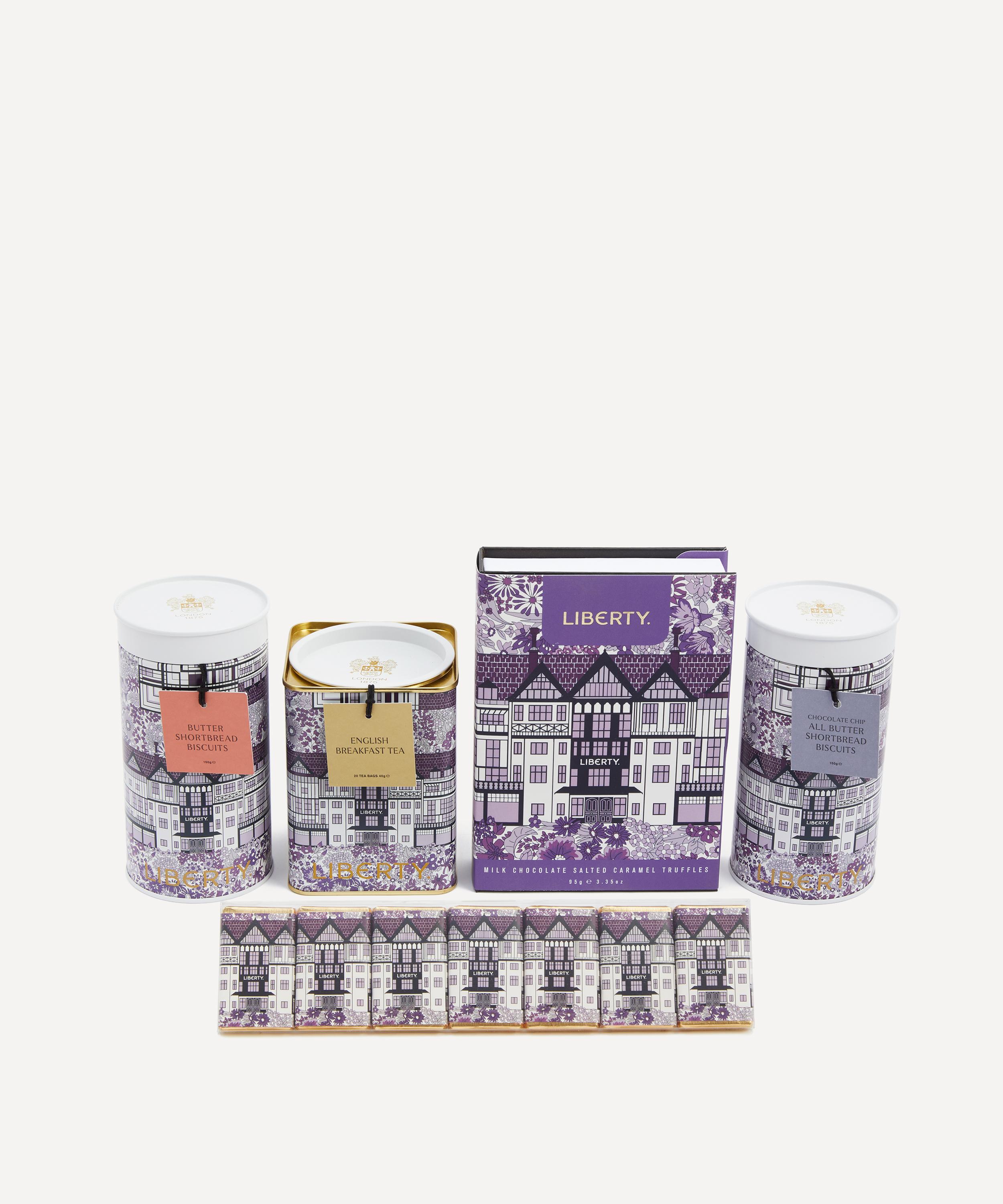 - Includes: Liberty Tudor Belle Chocolate Book Box (95g), Liberty Tudor Belle Chocolate Thins (70g), Liberty Tudor Choc Chip Shortbread Biscuits (150g), Liberty Tudor All Butter Shortbread Biscuits (150g), Liberty Tudor English Breakfast Tea (40g)