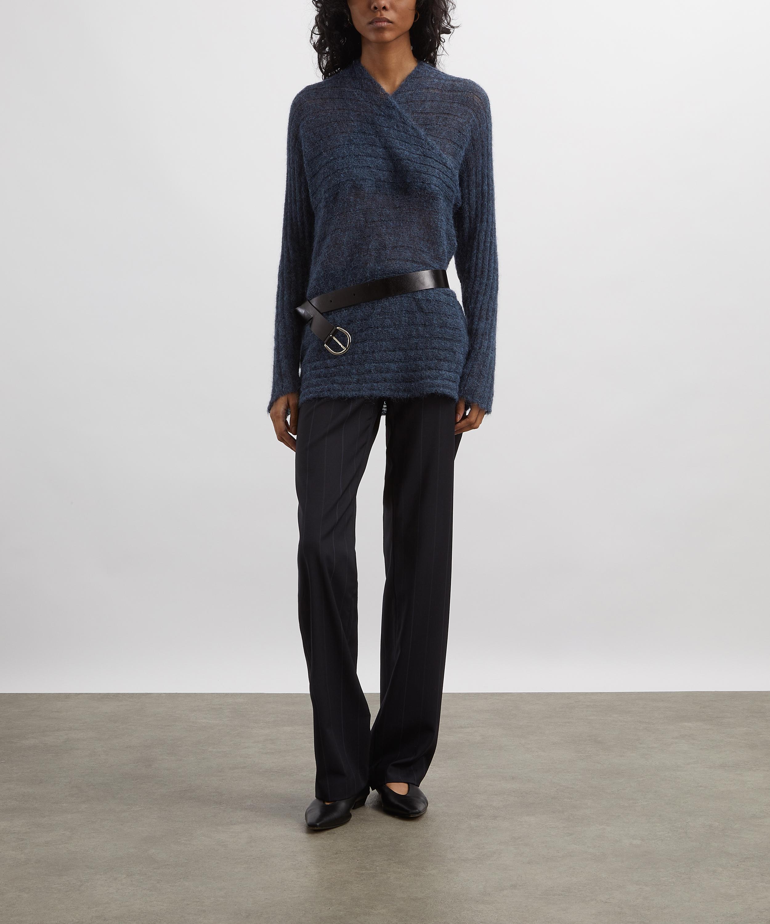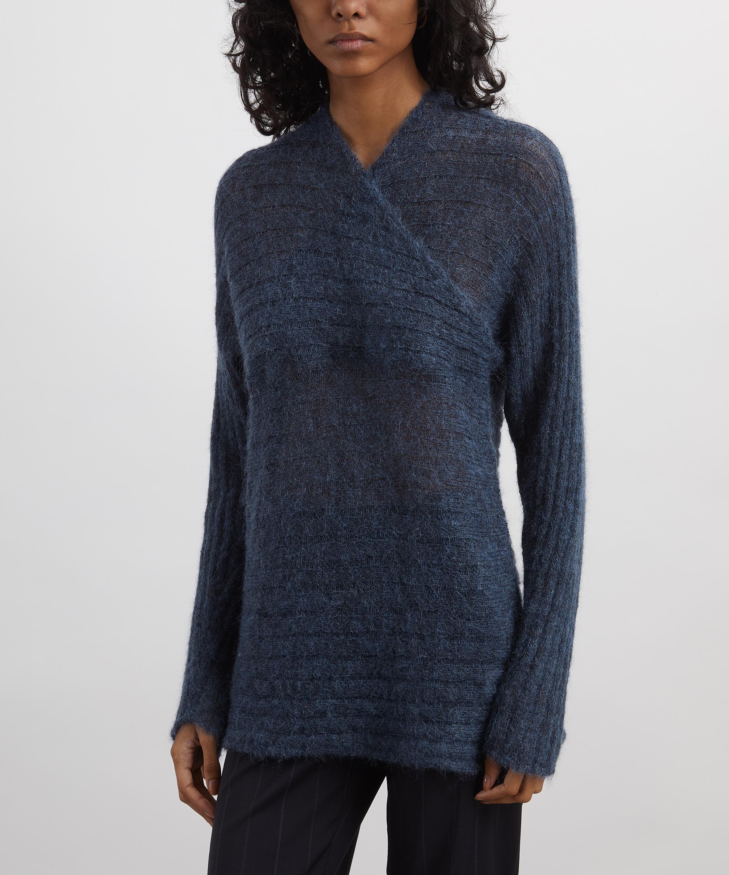 Crafted from a brushed medium-weight wool blend, this piece reinterprets traditional knitwear with understated elegance, featuring a crossed neckline, slim-fitting silhouette and subtle ribbed detailing. Pair with tailored suit trousers for a look that balances ease with refinement.
