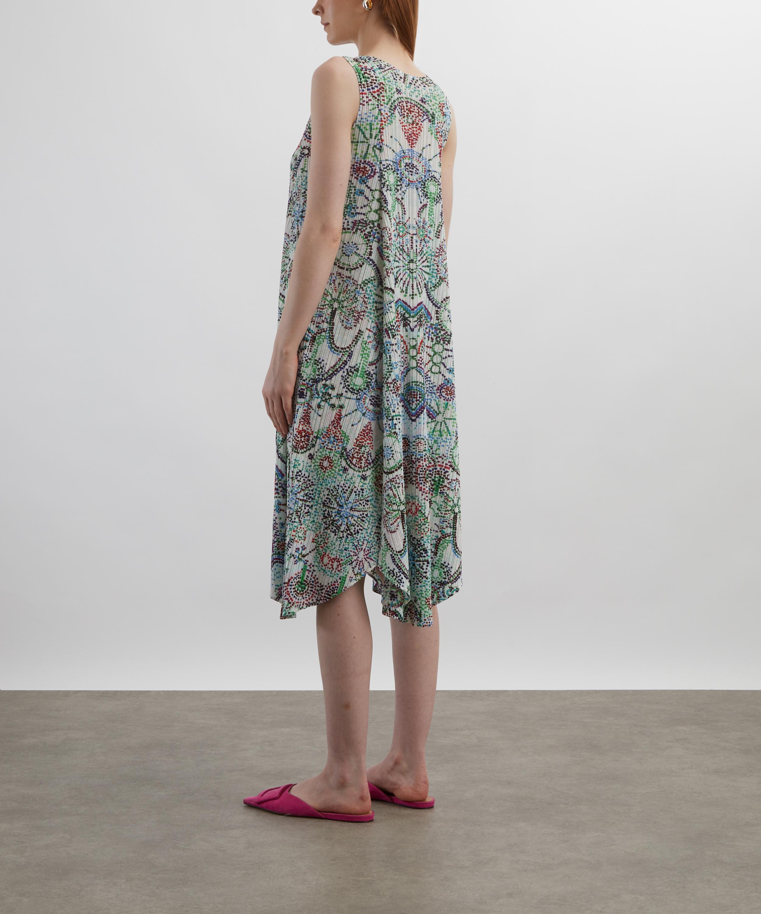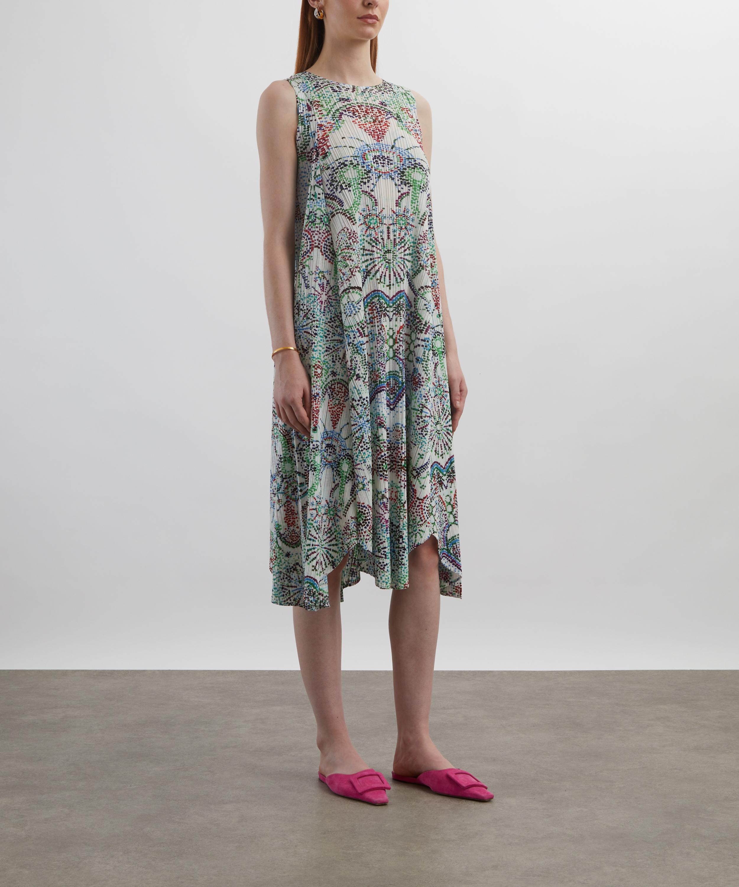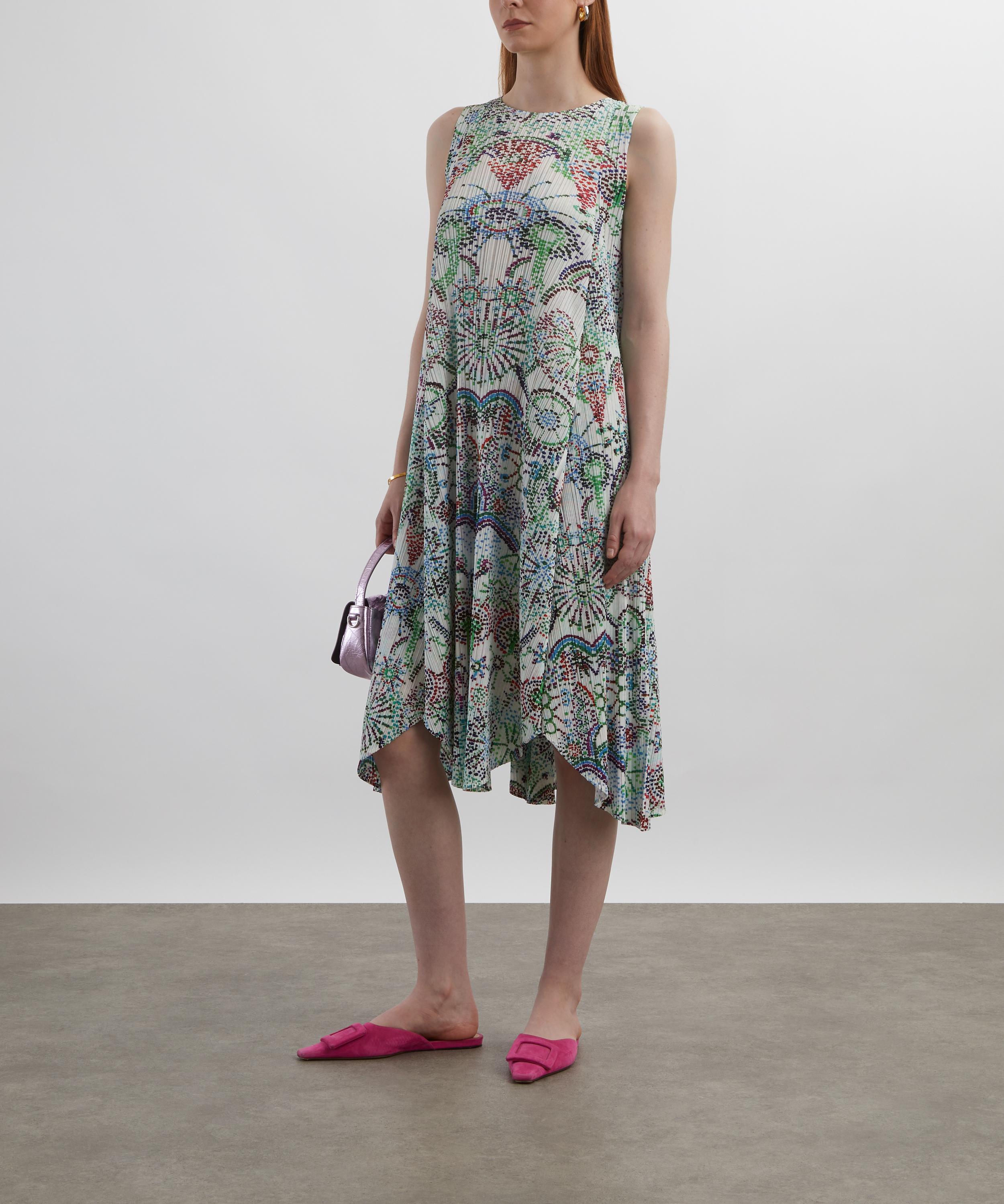 Part of the LIGHT FESTIVAL collection, which features firework-inspired motifs that evoke a sense of nostalgia and warmth, this pleated midi dress offers a flared, A-line silhouette complete with an elegant round neckline, making it the perfect piece for warm-weather elegance.