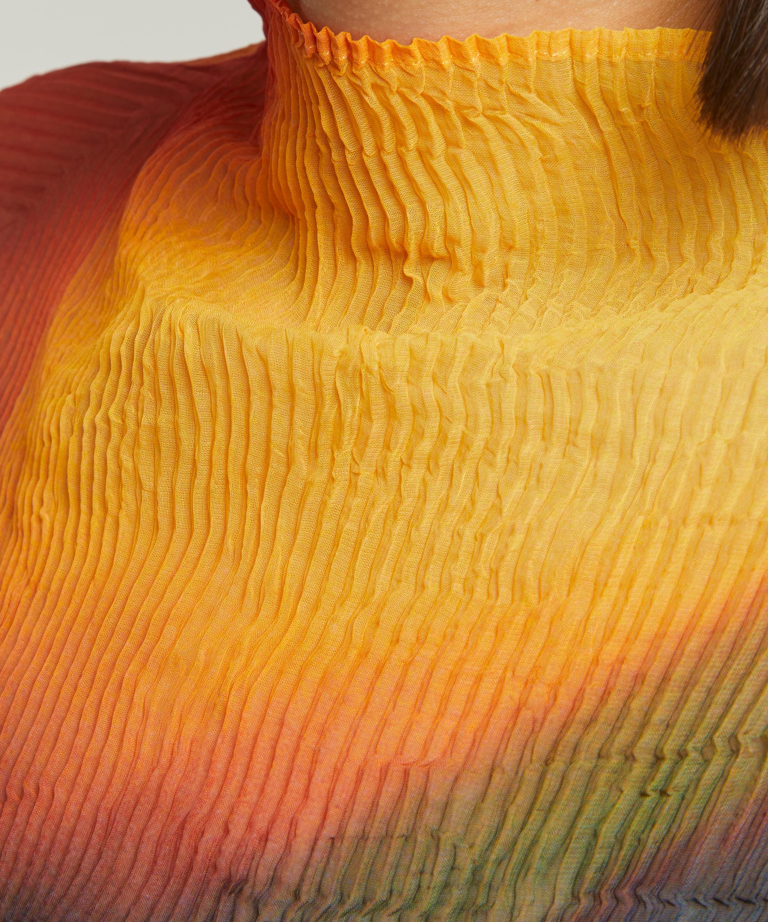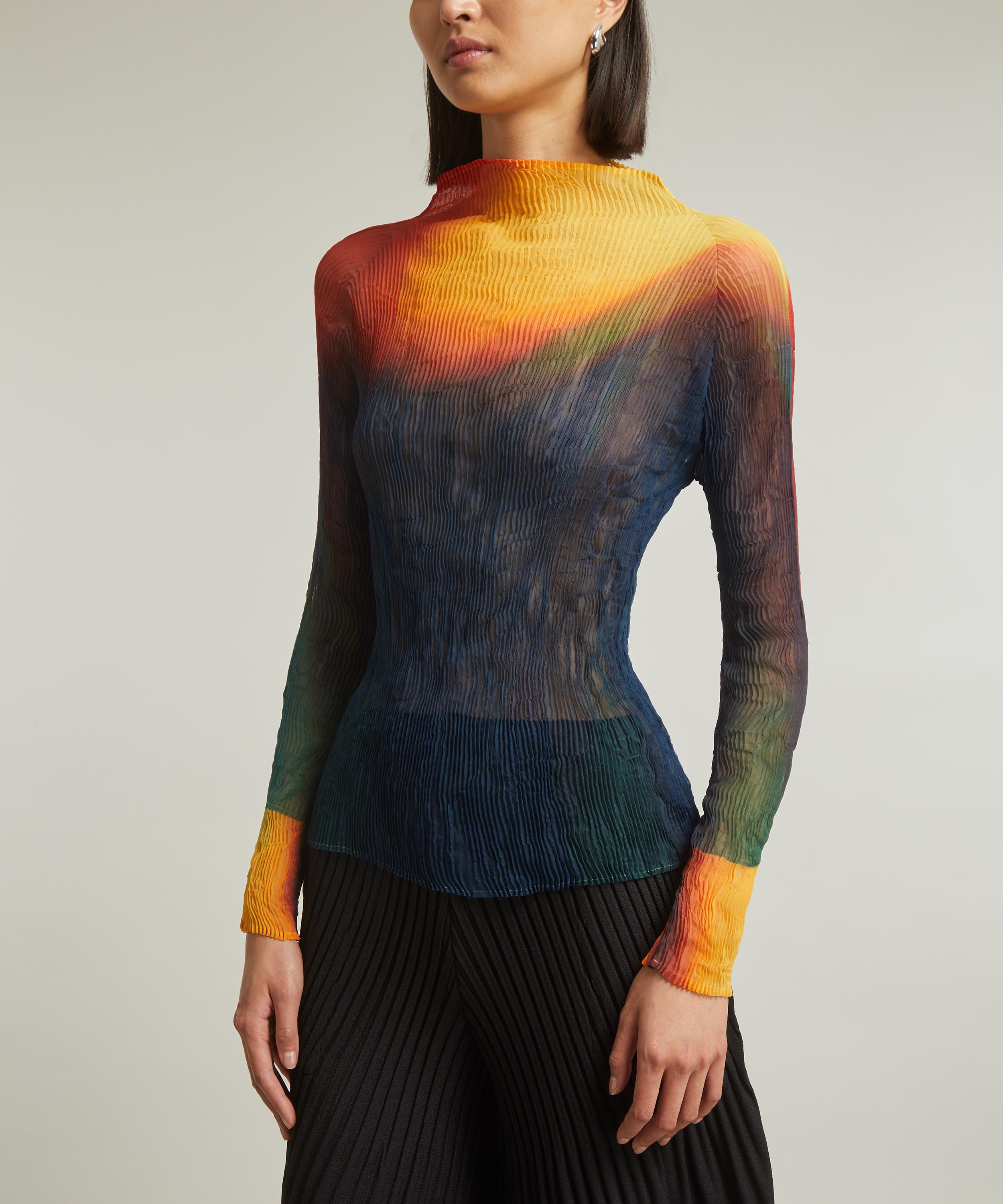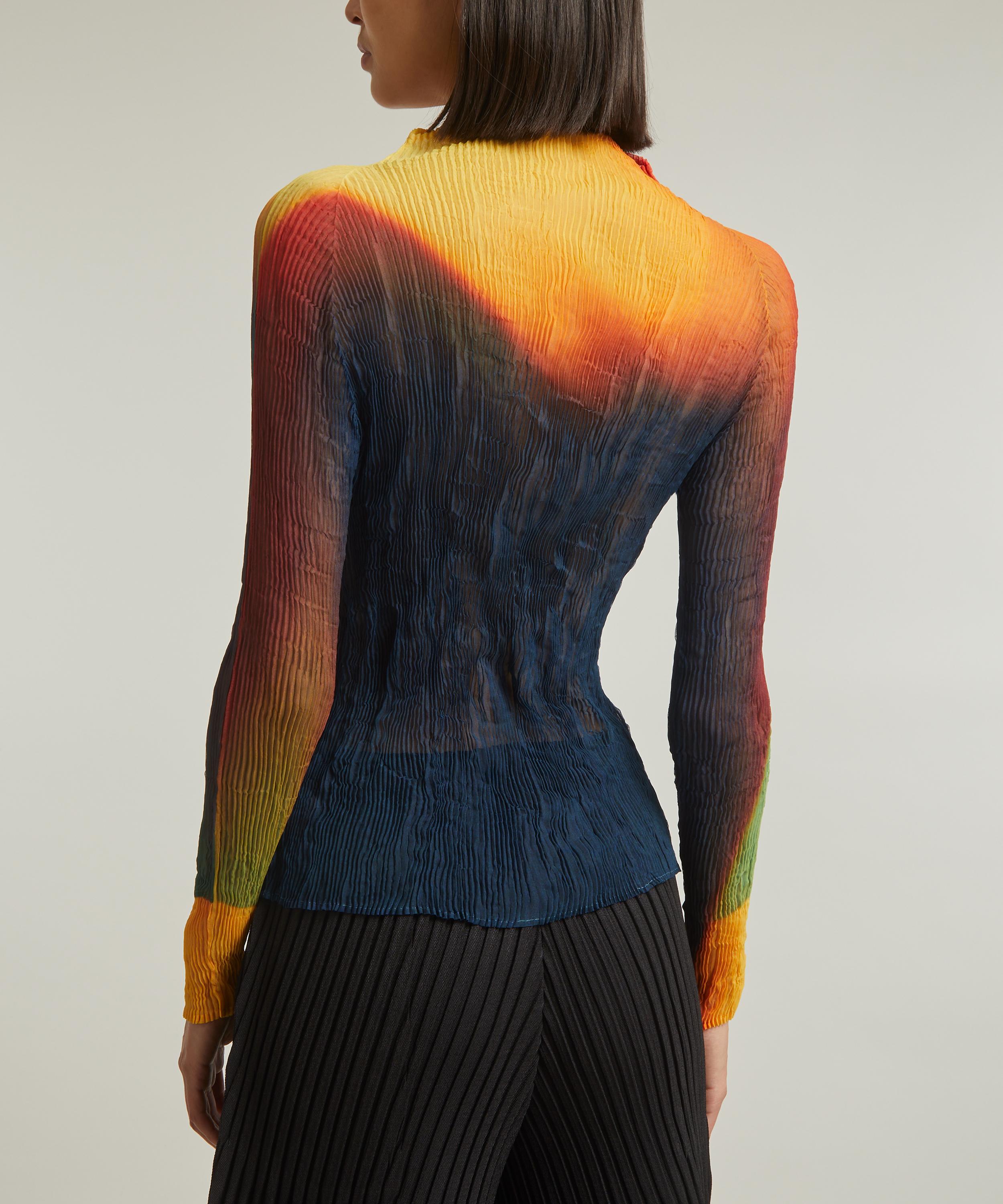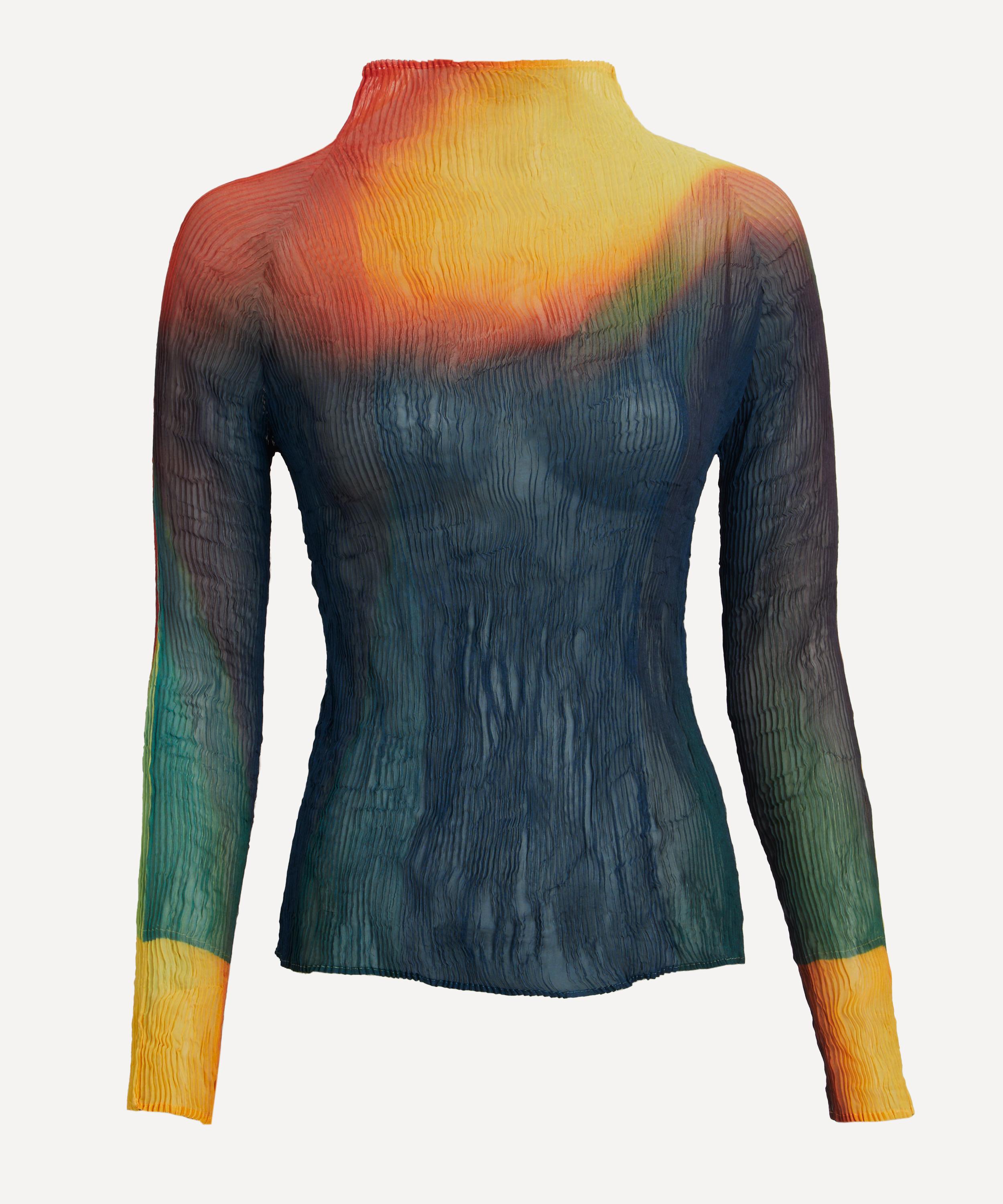 Offering classic design with a modern twist, the Light Leak Chiffon Twist is part of a collection of sheer, finely hand-pleated tops adorned with custom prints of exposed photographic films. Effortlessly flattering, the delicate nature of the twisted chiffon fabric seamlessly contours the body, while its mock neckline and long sleeves add a touch of demure elegance.