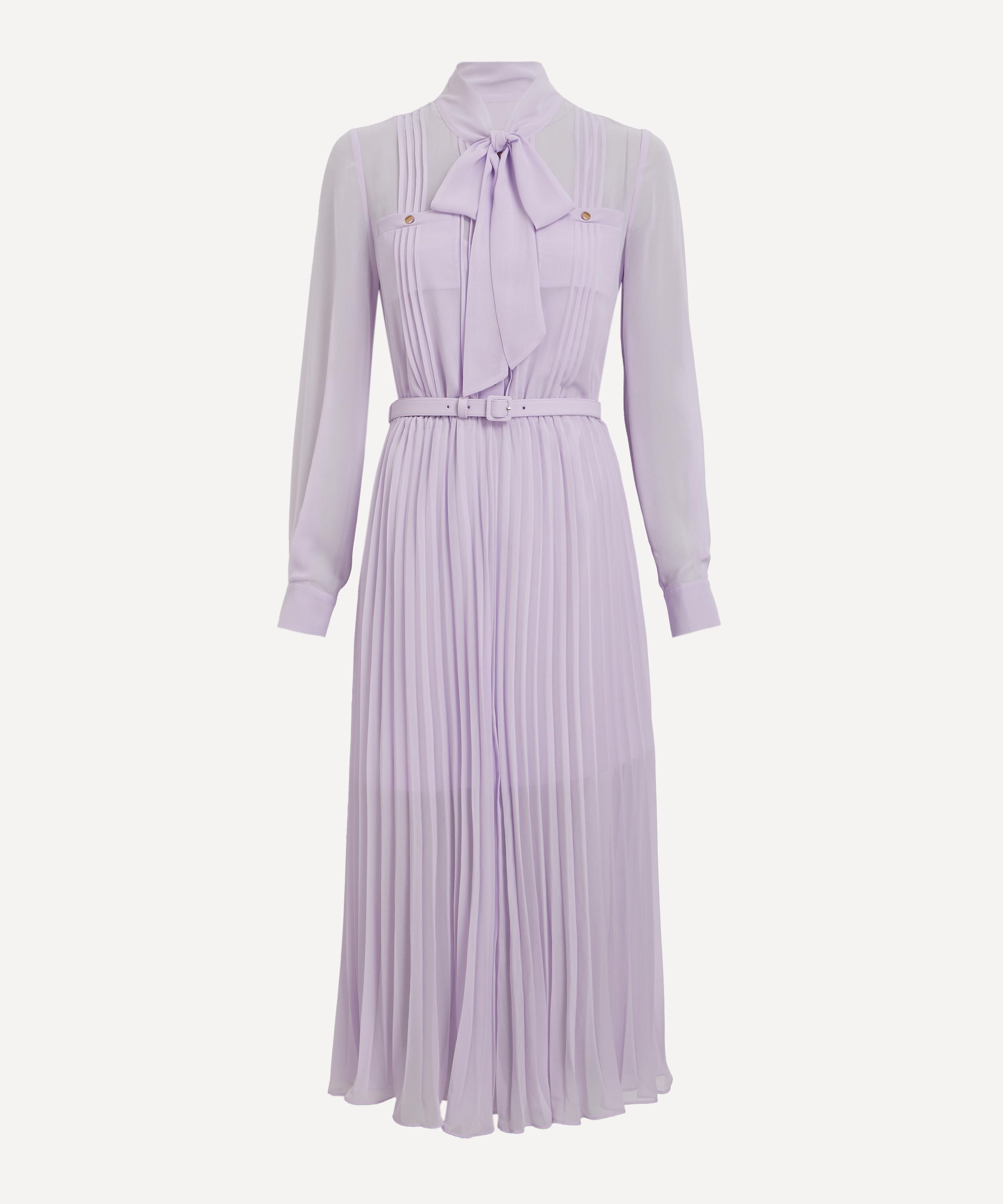 With its delicate lilac chiffon construction and tailored design, this midi dress exudes retro charm. Framed by a flouncy pussy-bow and a belted waist that flows into a pleated skirt, gold buttons add a refined touch of sophistication, making it the perfect choice for a special occasion or an unforgettable event.