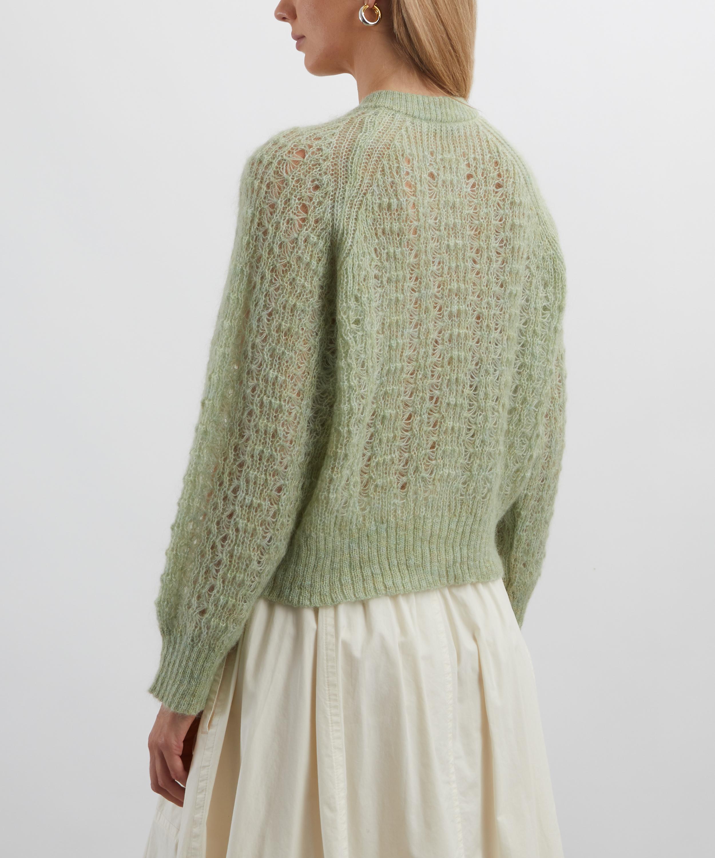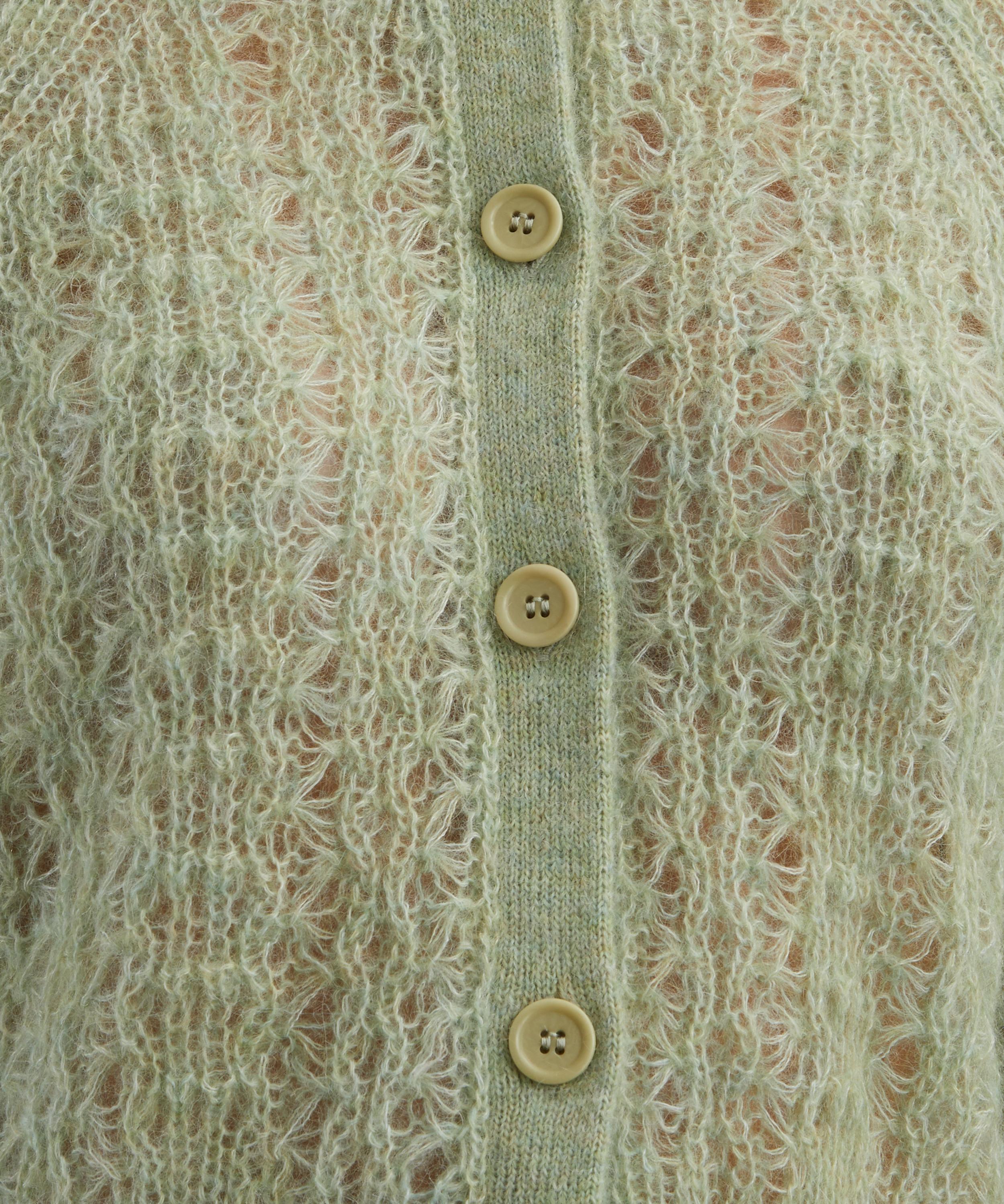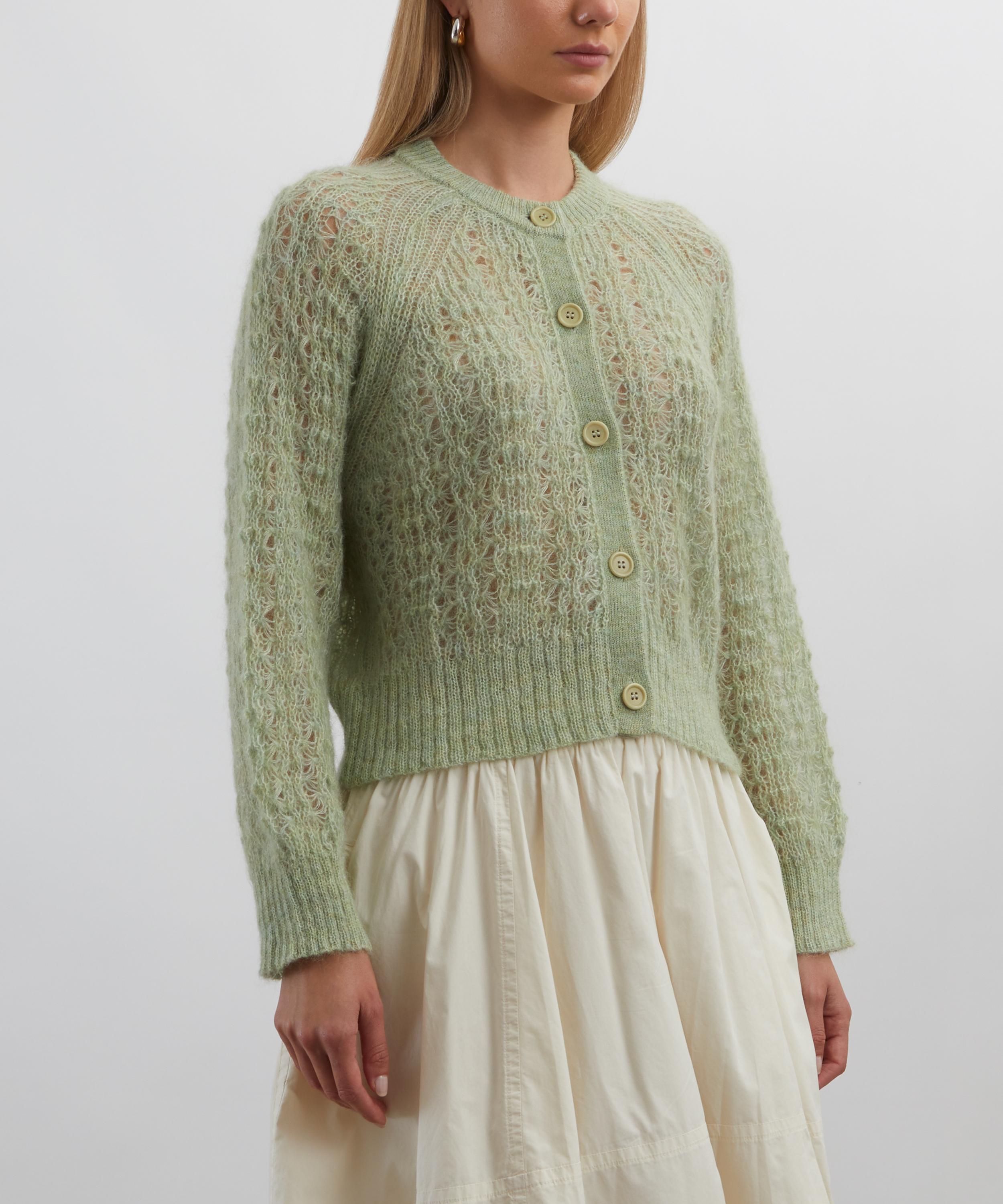 Knitted from a plush mohair and alpaca blend, this green cardigan features a relaxed, cropped fit, ribbed trims, and an intricate ladder-stitch construction for a delicate, airy finish.