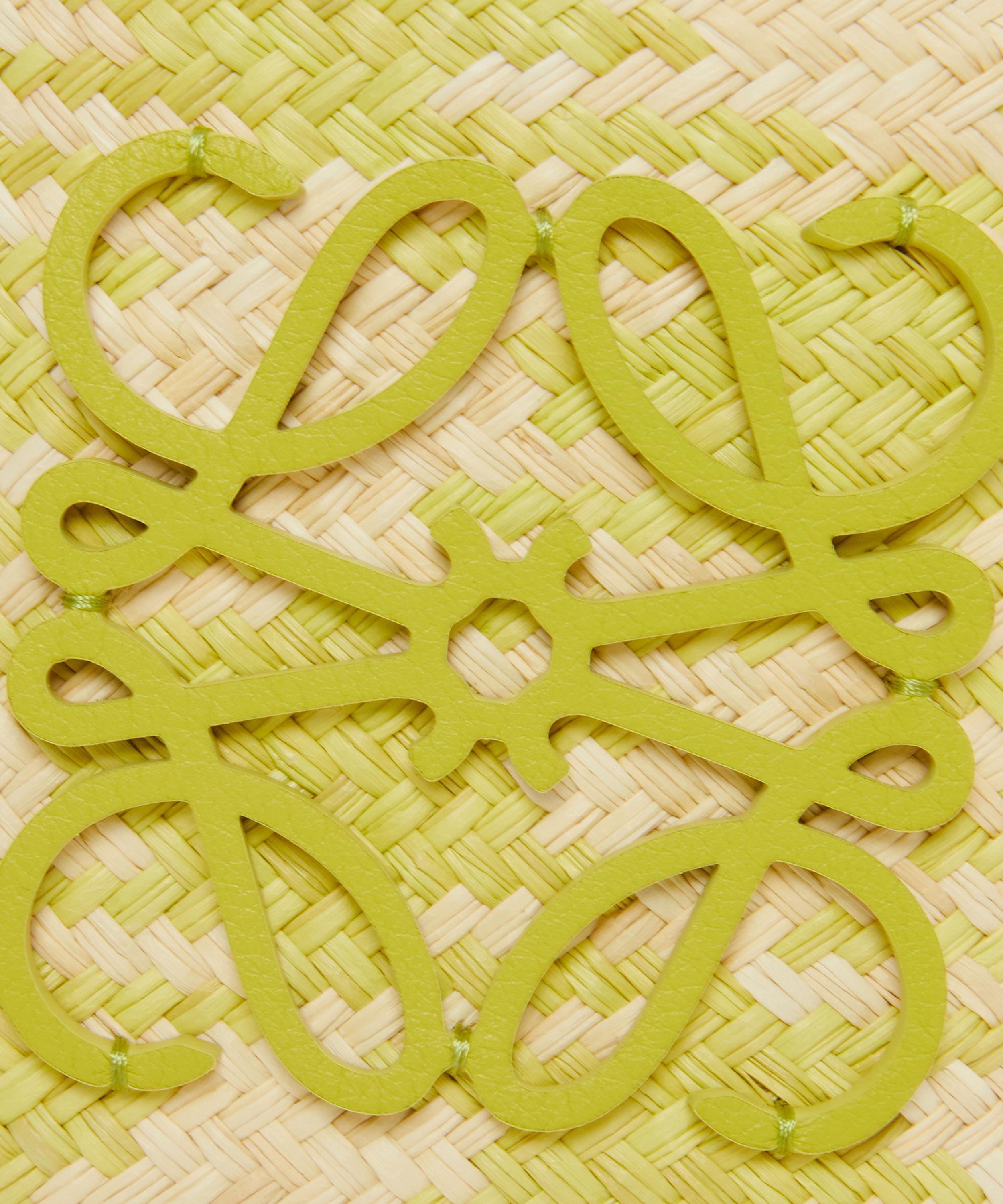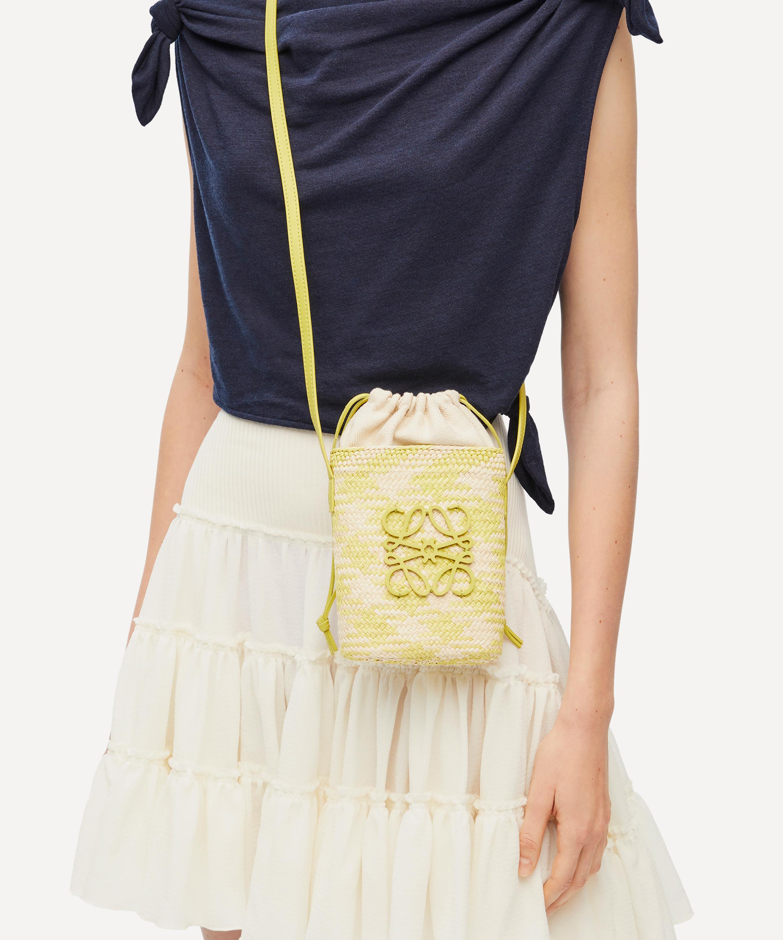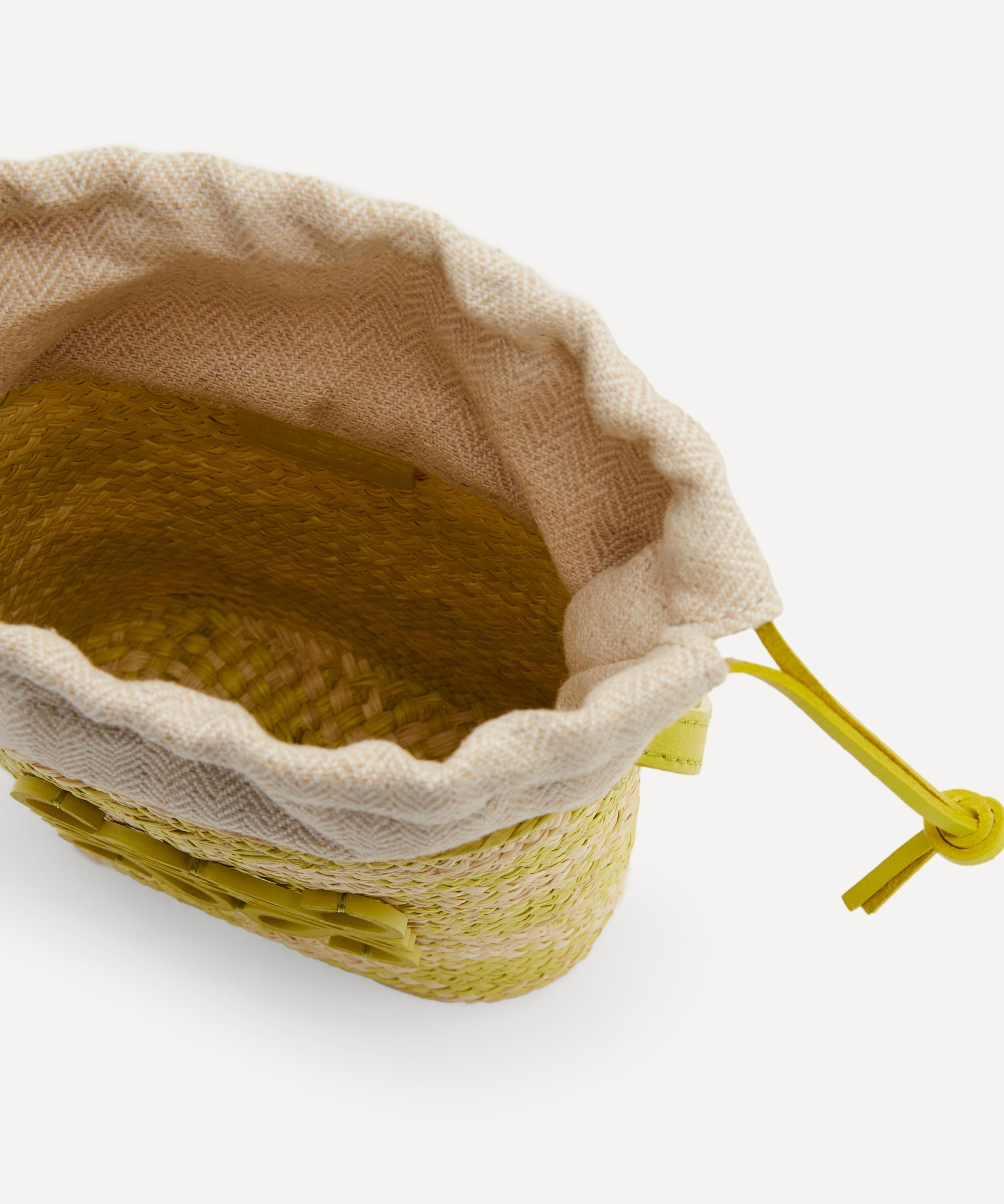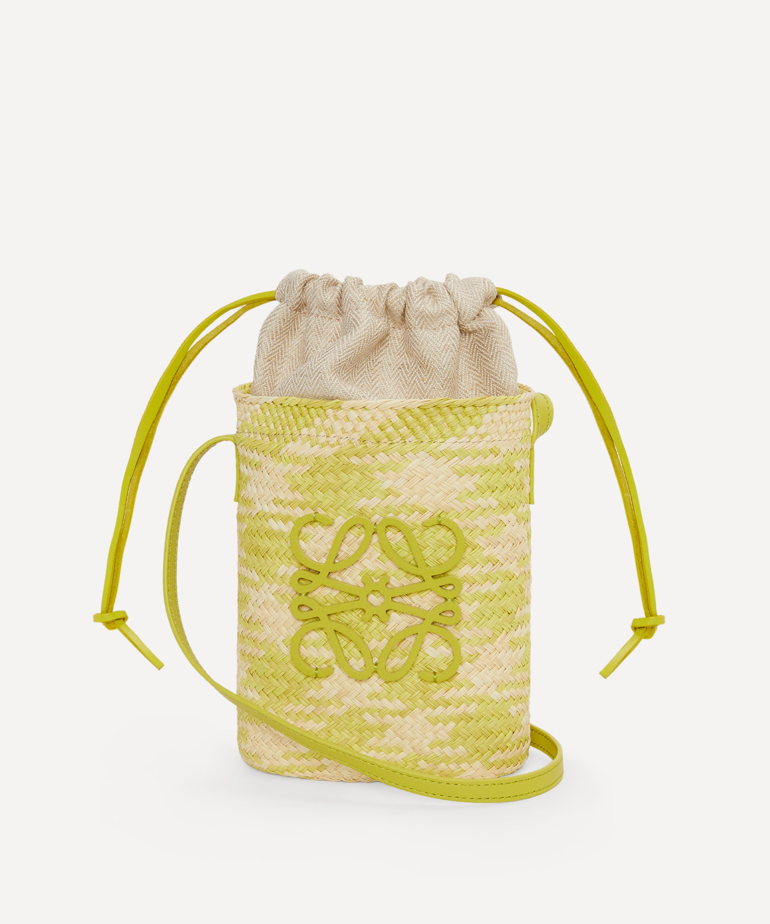 Crafted from iraca palm with a vibrant, two-tone herringbone pattern, this square pocket bag showcases a rustic, unlined design with a leather shoulder strap and a drawstring top in cotton canvas – finished with the brand's distinctive Anagram logo embroidered in leather on the front.