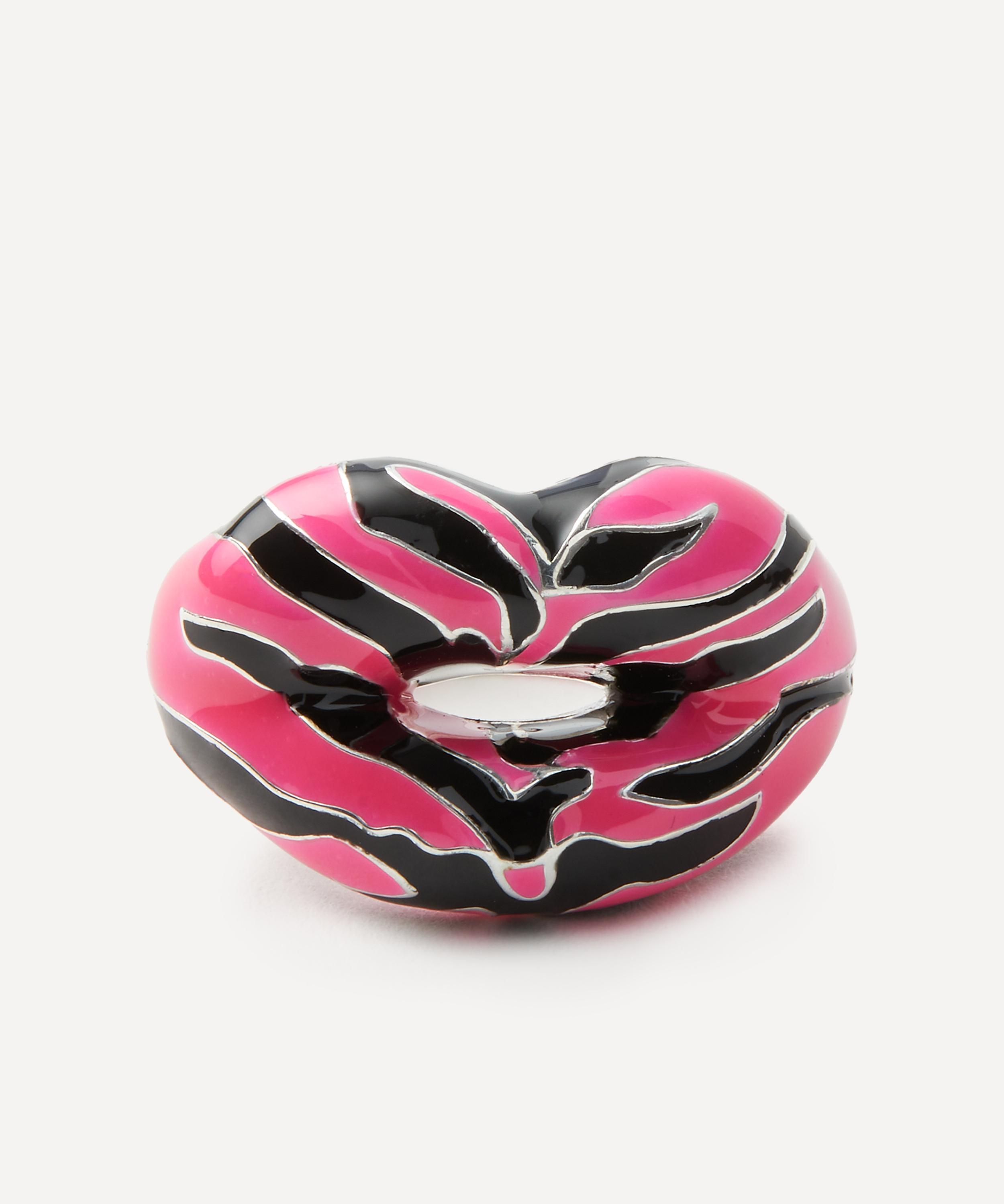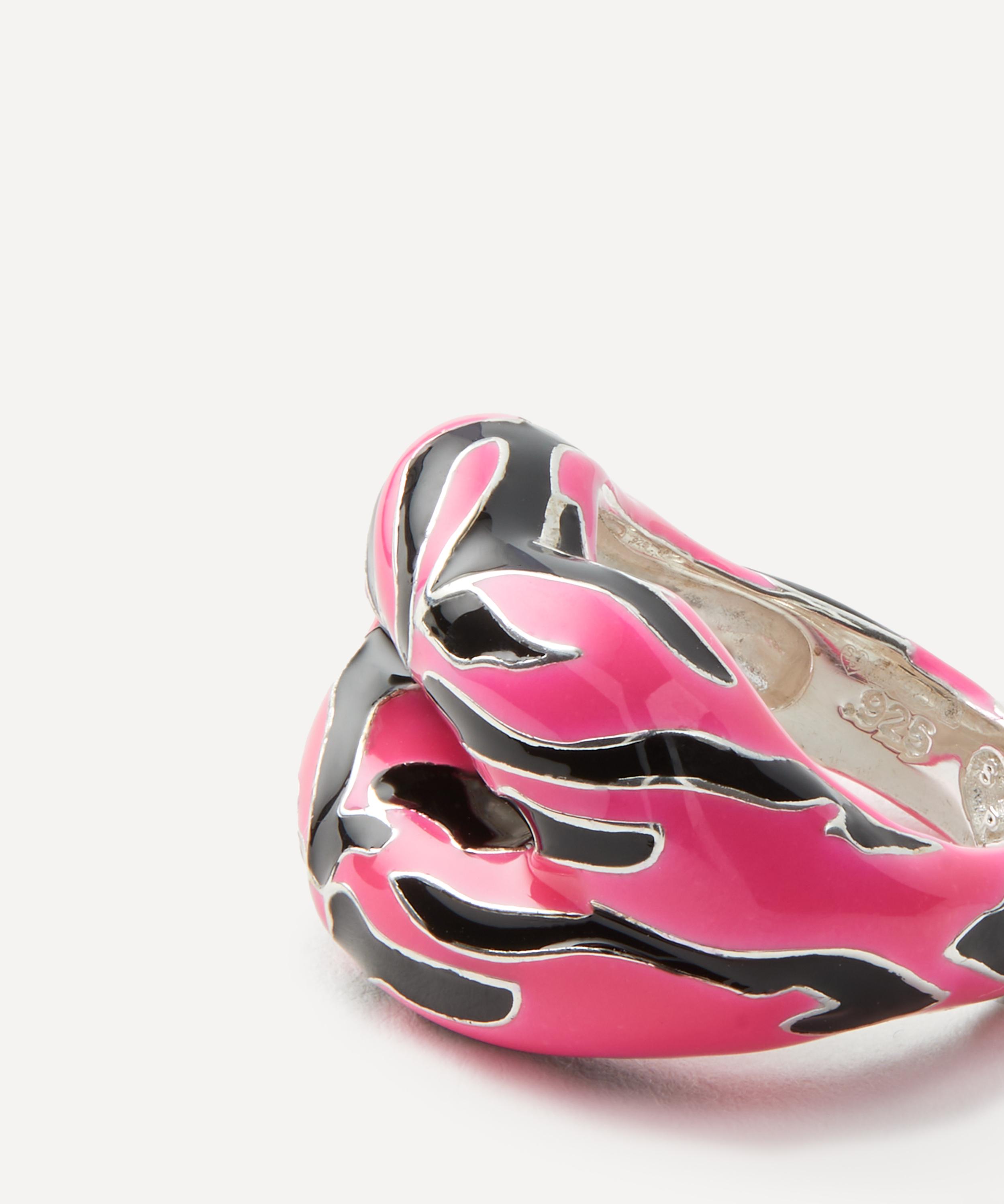 A statement addition to your ring stack, this limited edition rendition of the iconic Hotlips ring by British designer Solange Azagury-Partridge is coated in glossy neon pink lacquer with a bold tiger print pattern. Crafted from solid sterling silver, each one features a lacquer lipstick colour on a pair of pouting lips - this version is even brighter than the original thanks to the bold neon pink colourway. Try wearing several together on different fingers for a fun, contemporary curation that pairs perfectly with partywear.