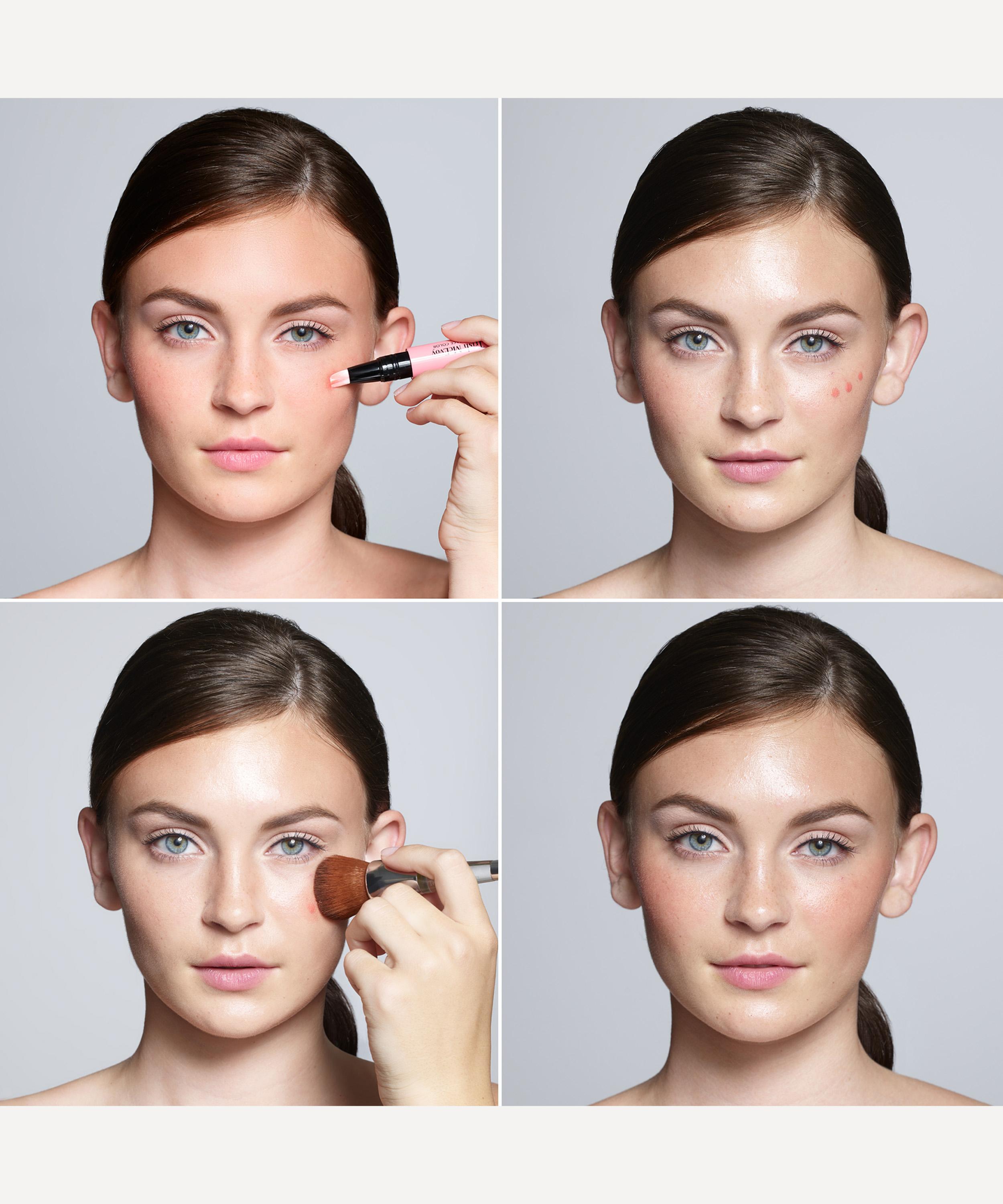 Apply a very small amount of Liquid Face Colour onto a brush, your fingertip or directly onto the apple of the cheek. Pat the colour with your finger to evenly distribute the shade, until it is blended into the skin.
