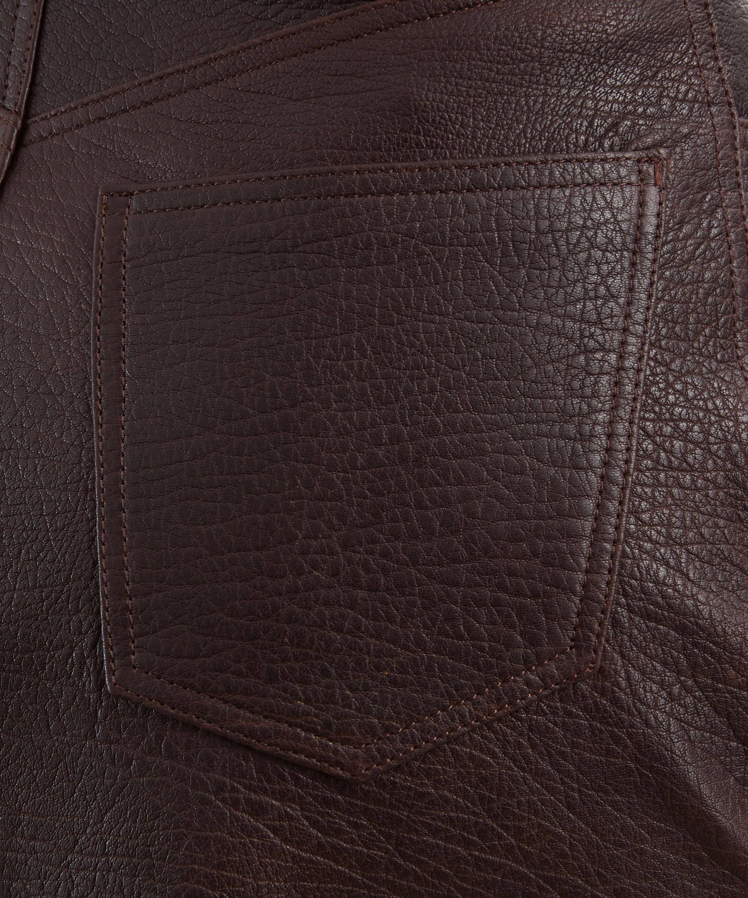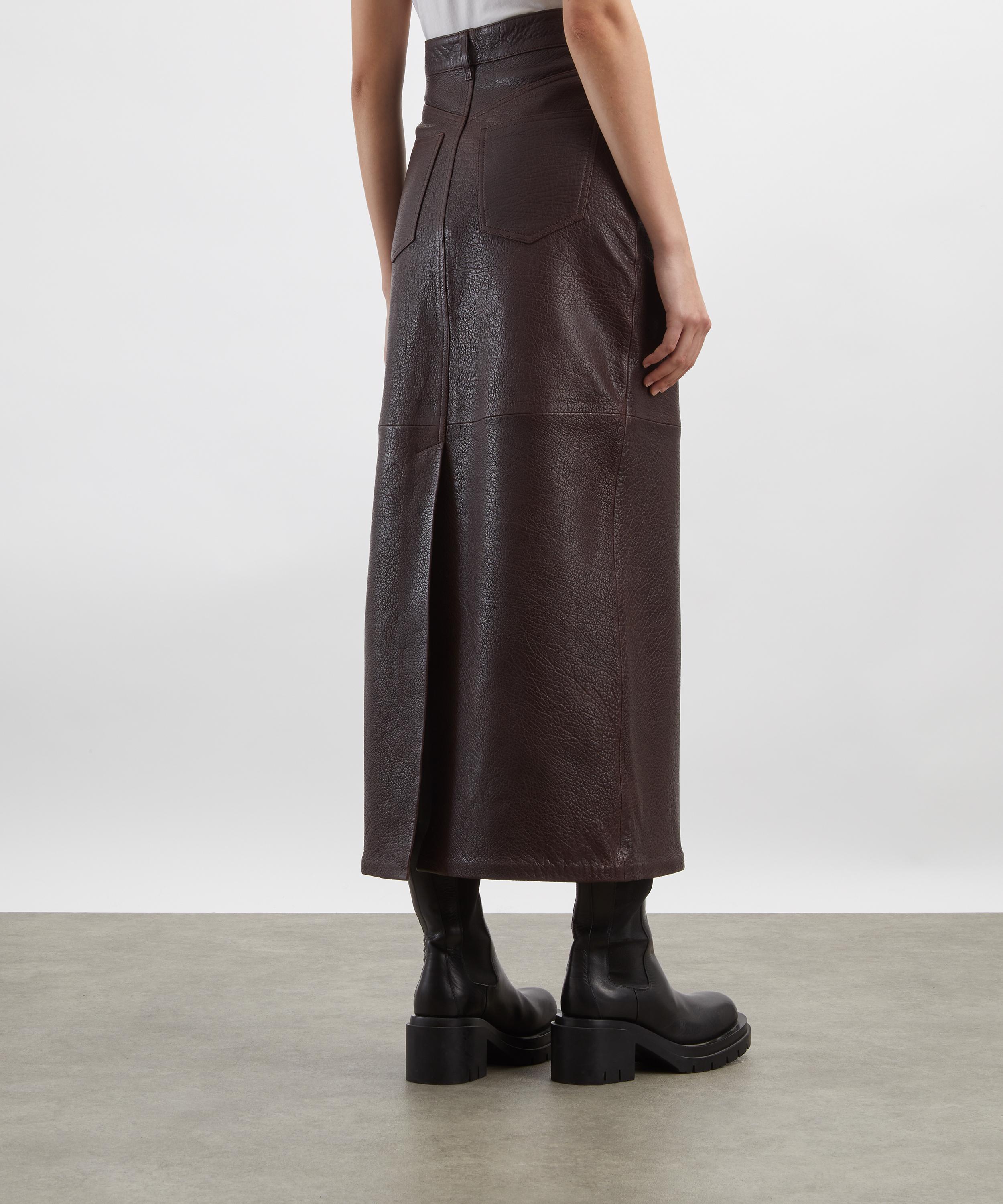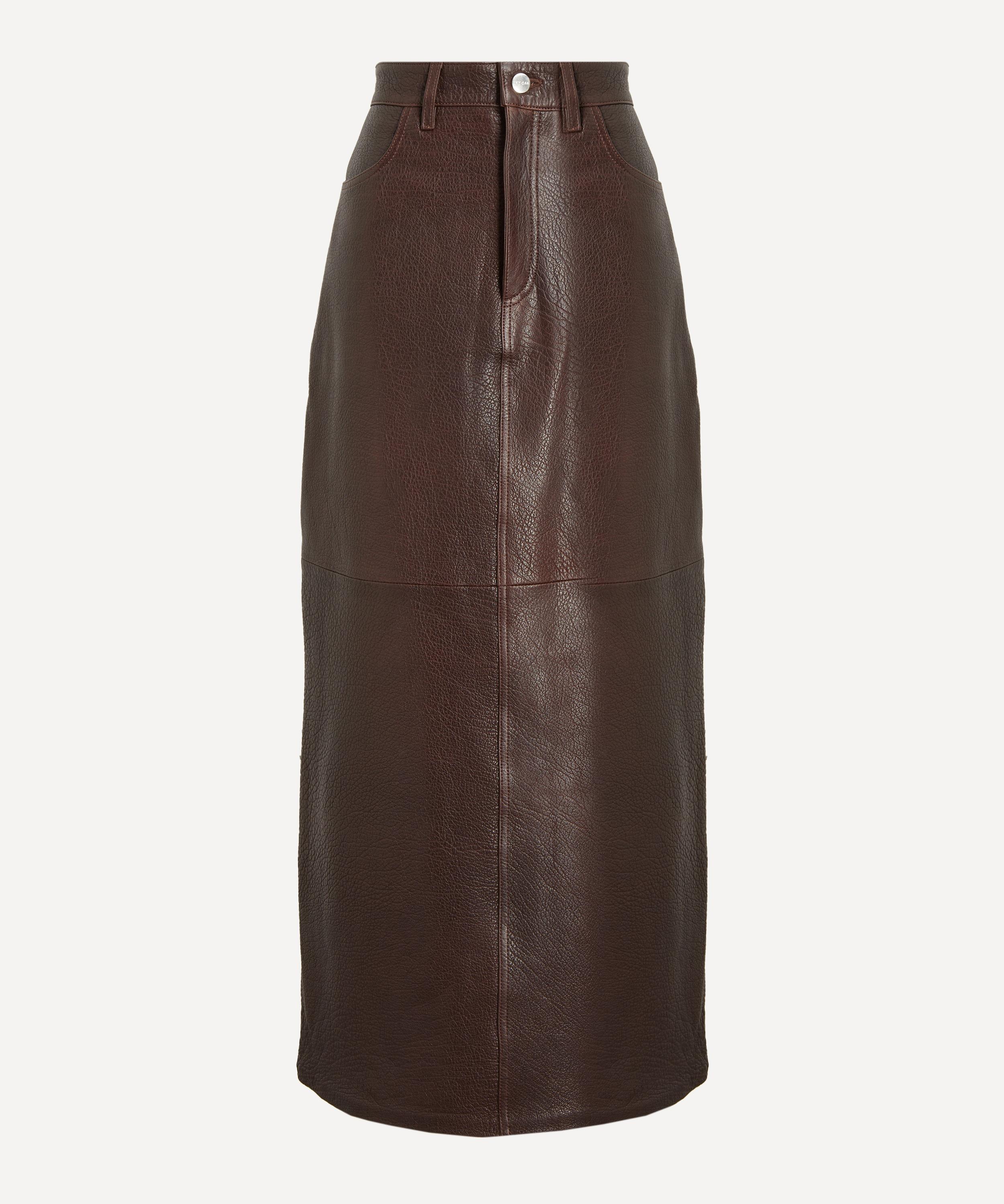 Crafted from richly grained nappa leather, this ankle-length skirt showcases a flattering A-line silhouette, complete with classic denim-style pockets, refined seam detailing, and a back slit for ease of movement.