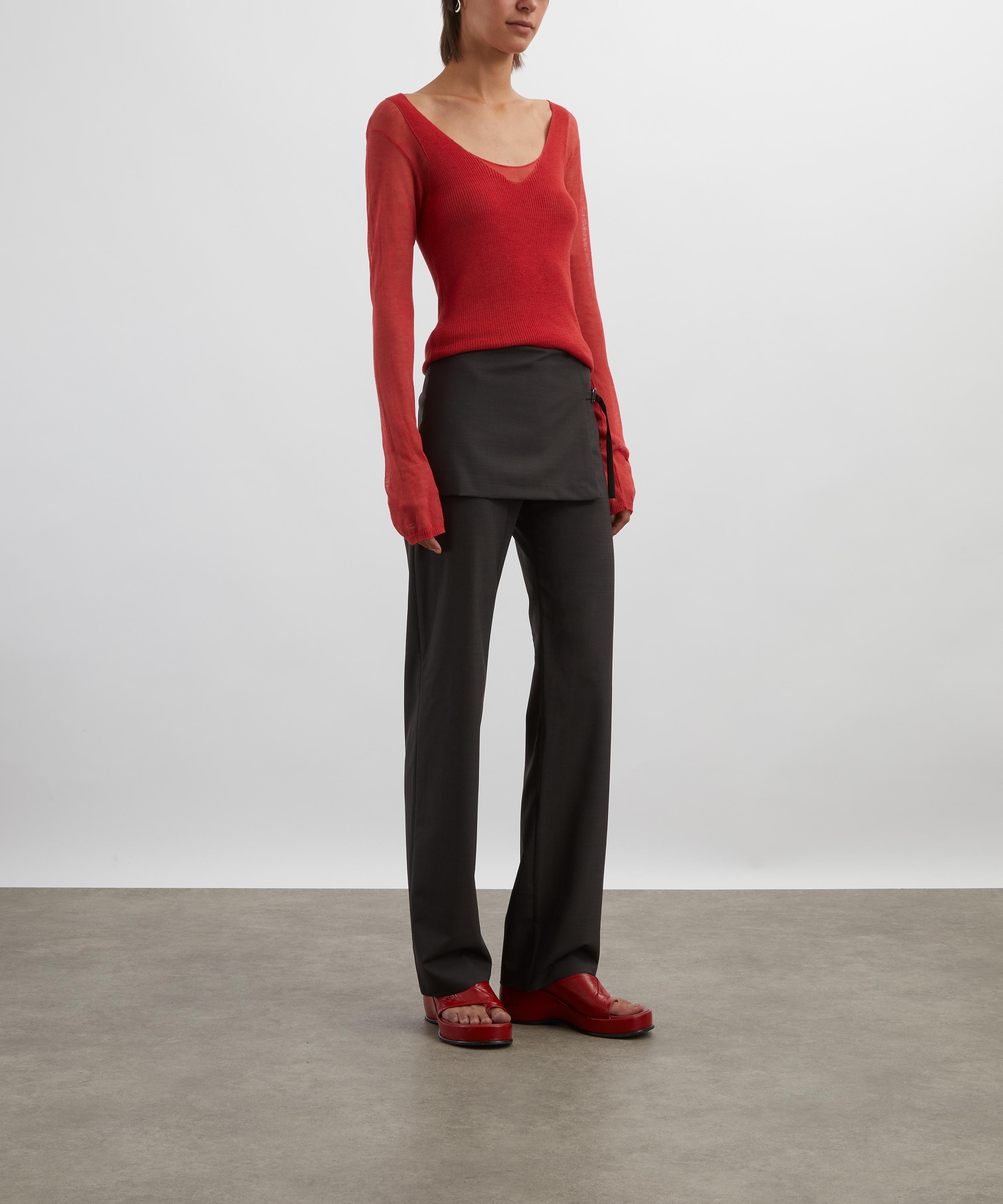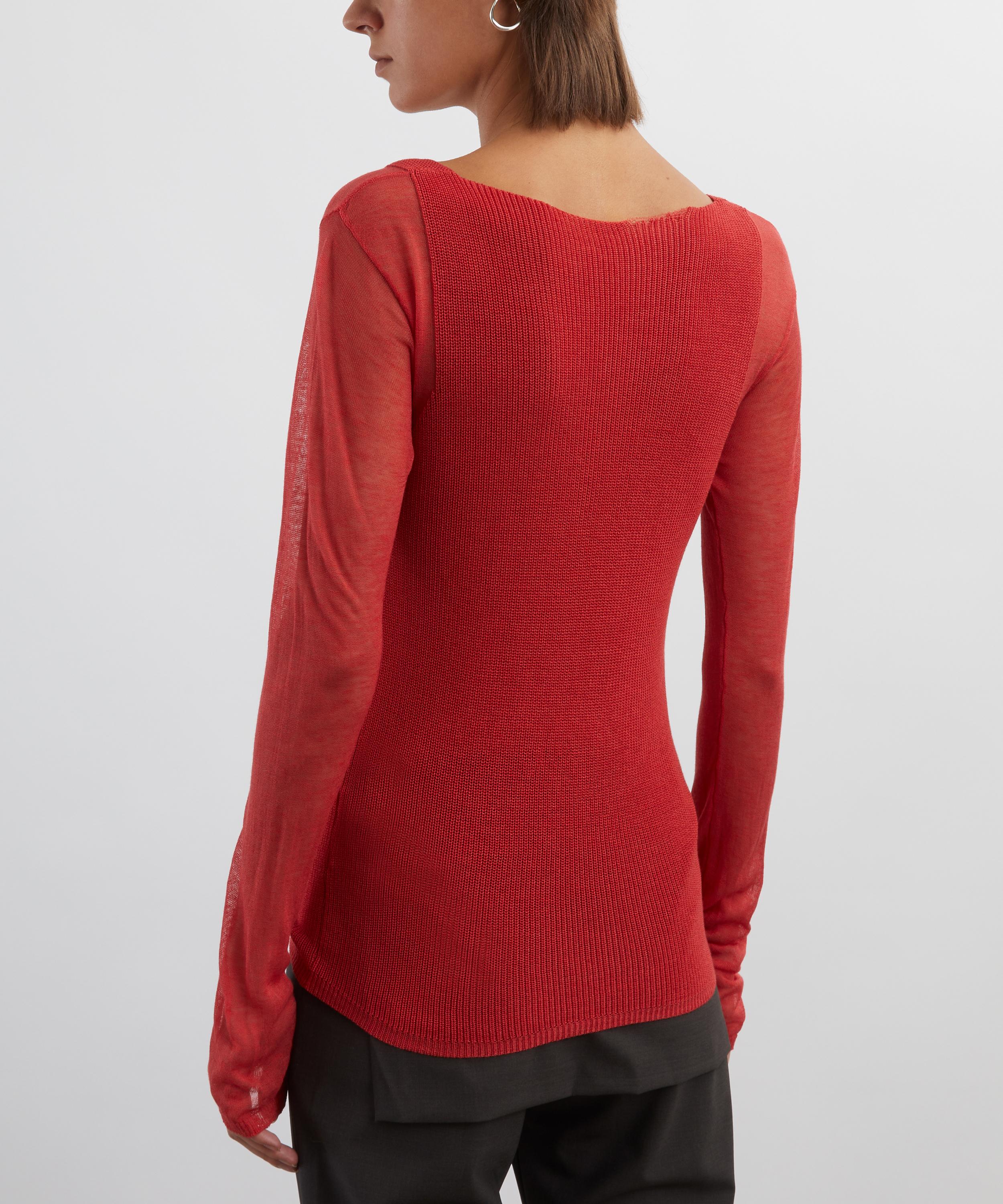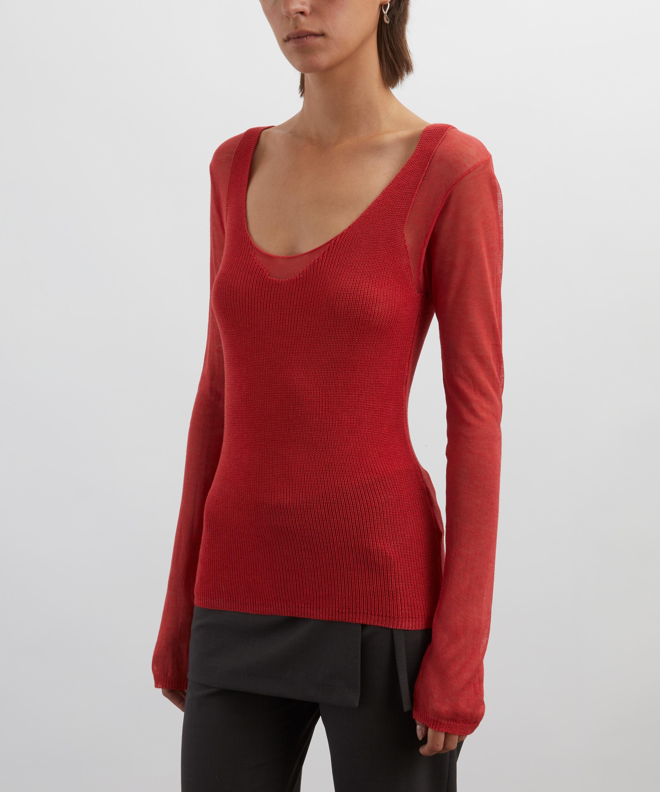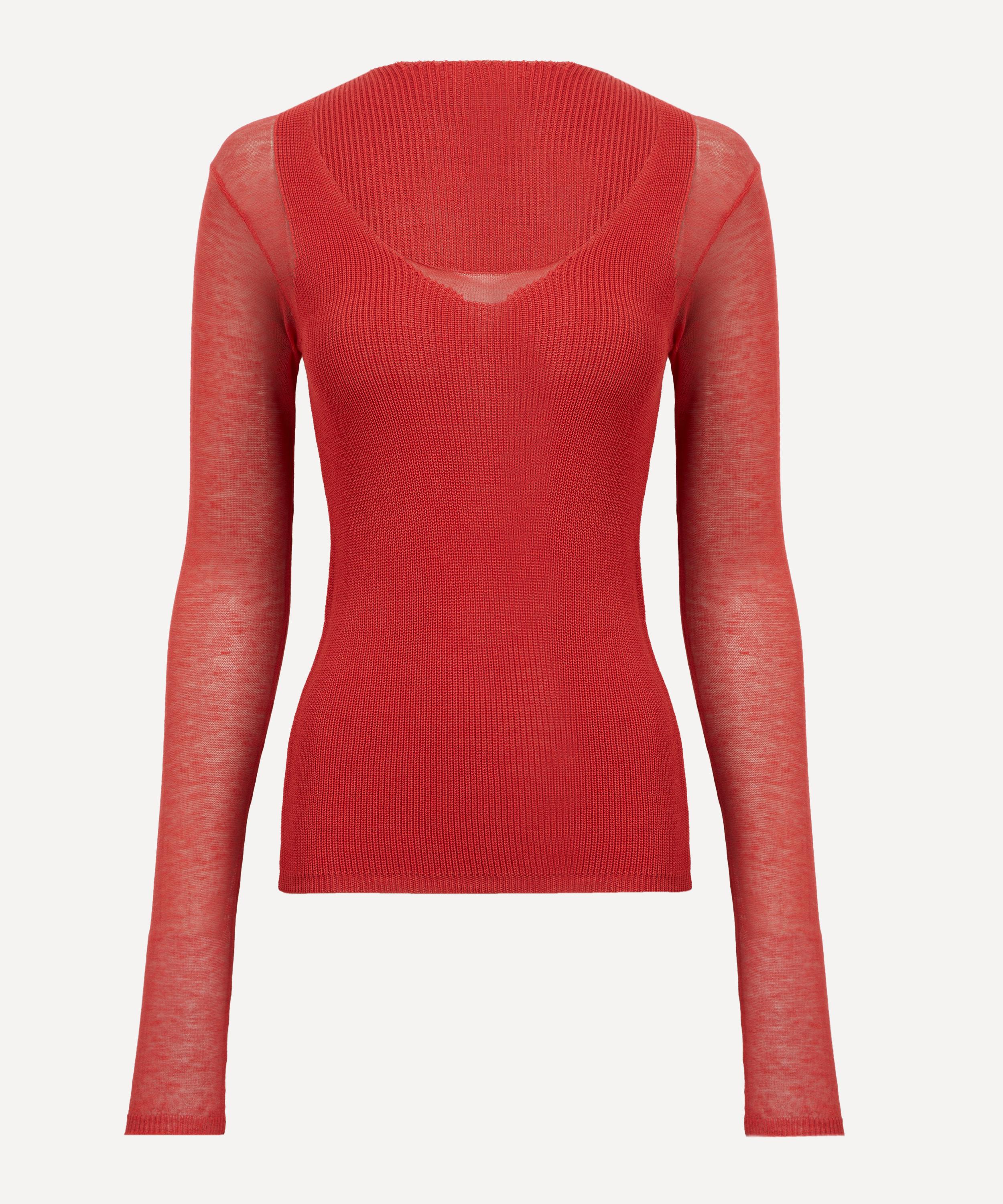 The Litam Top features a sophisticated long-sleeve, double-layered design, with a finely knitted outer layer elegantly draped over a sheer, semi-transparent interior.