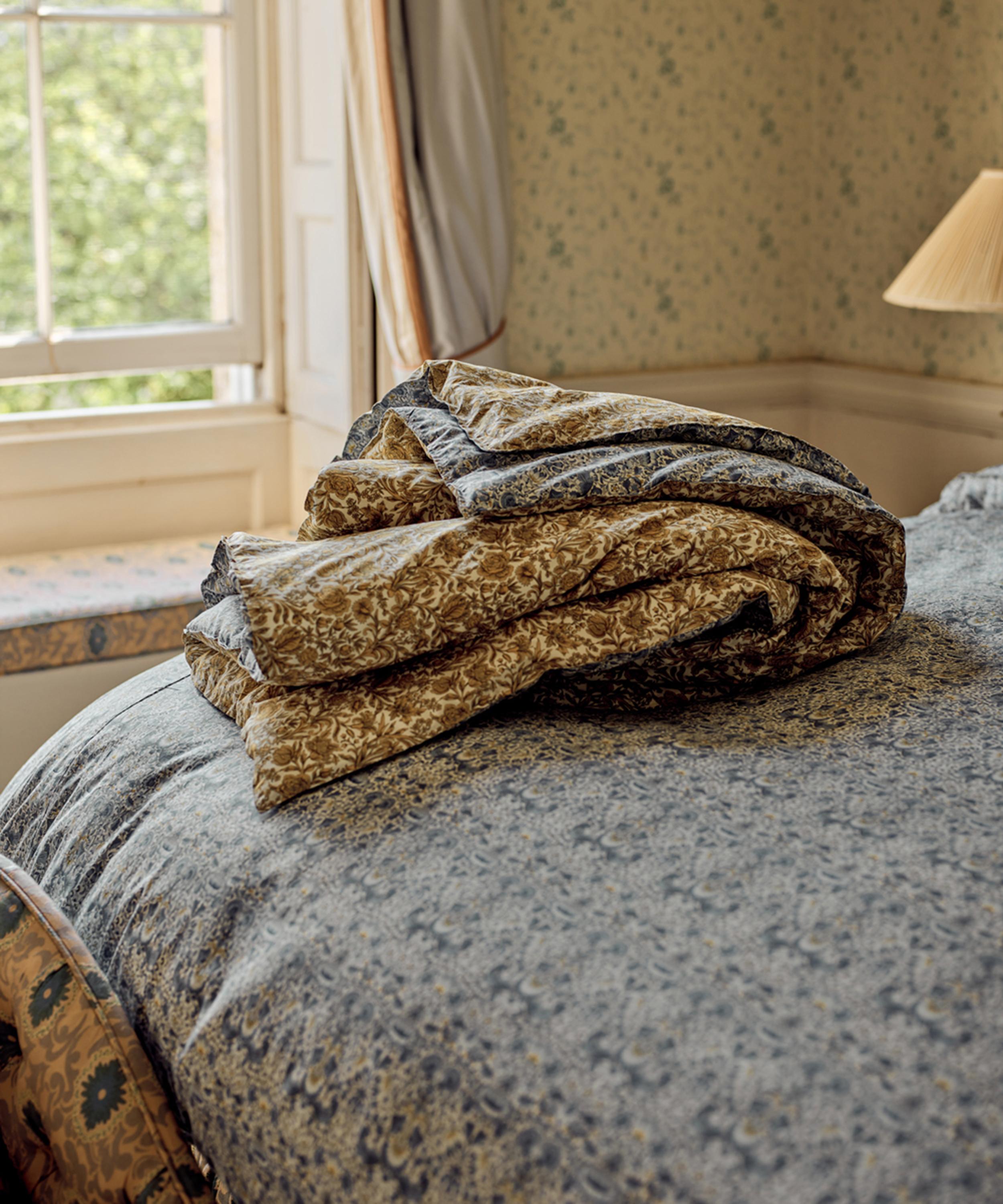 Somerset-born bedding brand Coco & Wolf is renowned for its Liberty print bedspreads, duvets and cushions, crafted from our inimitable Tana Lawn™ cotton, a modern masterpiece of fabric production that Liberty has been perfecting for over 100 years. The king heirloom quilt is dressed in Liberty Fabrics’ Lodden and Sambourne prints - use to infuse a touch of pattern into an otherwise, subdued sleeping space. We suggest embracing the maximalist trend by coupling with print-loaded cushions, linen throws and rattan décor.