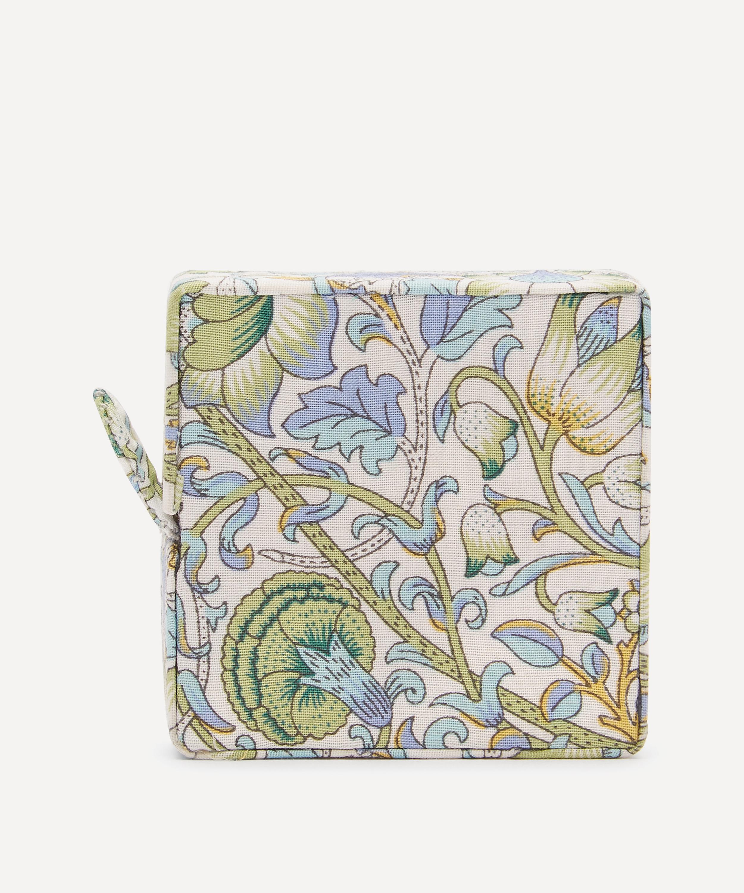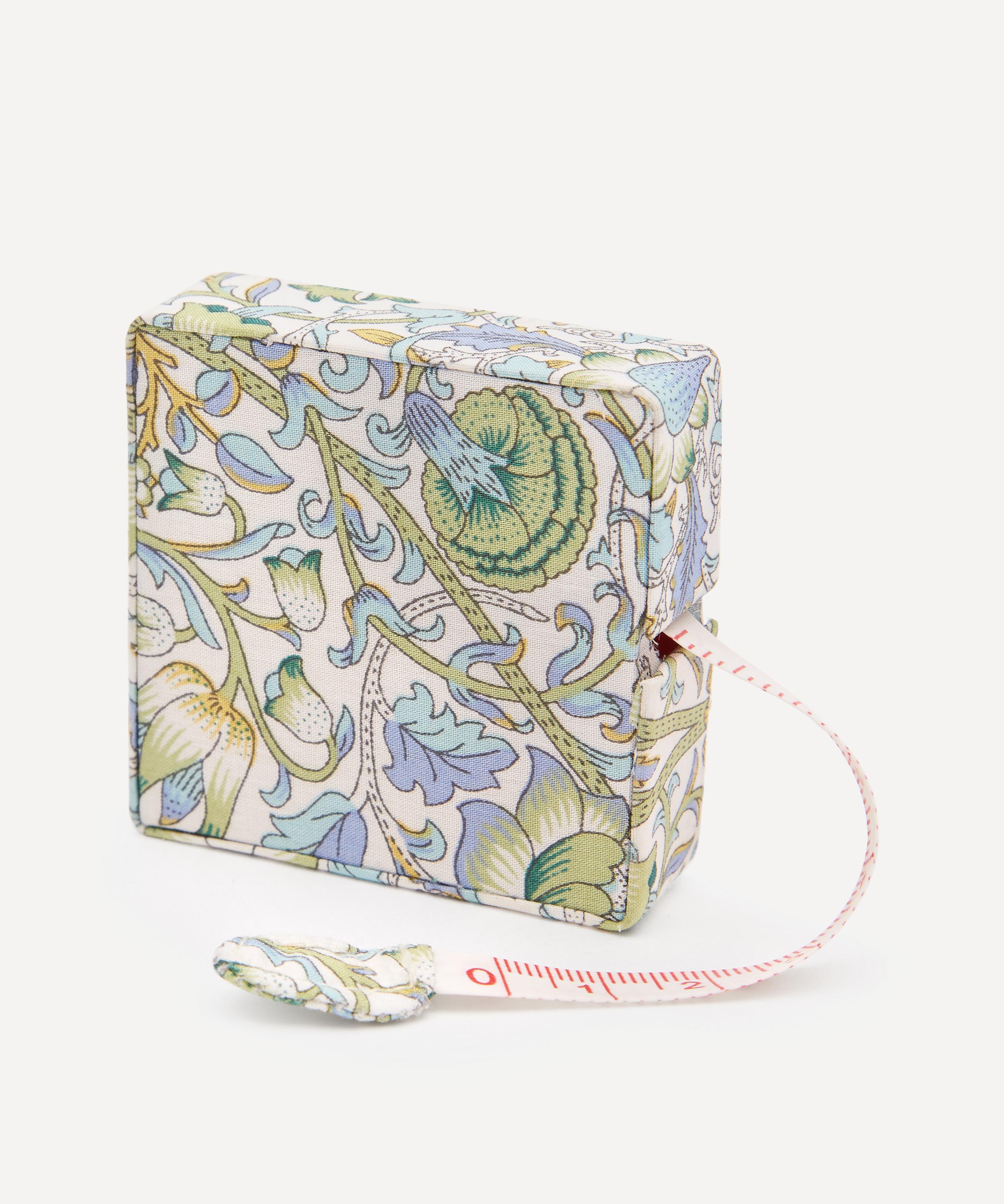 This measuring tape comes in a square fabric case featuring a classic Liberty print.