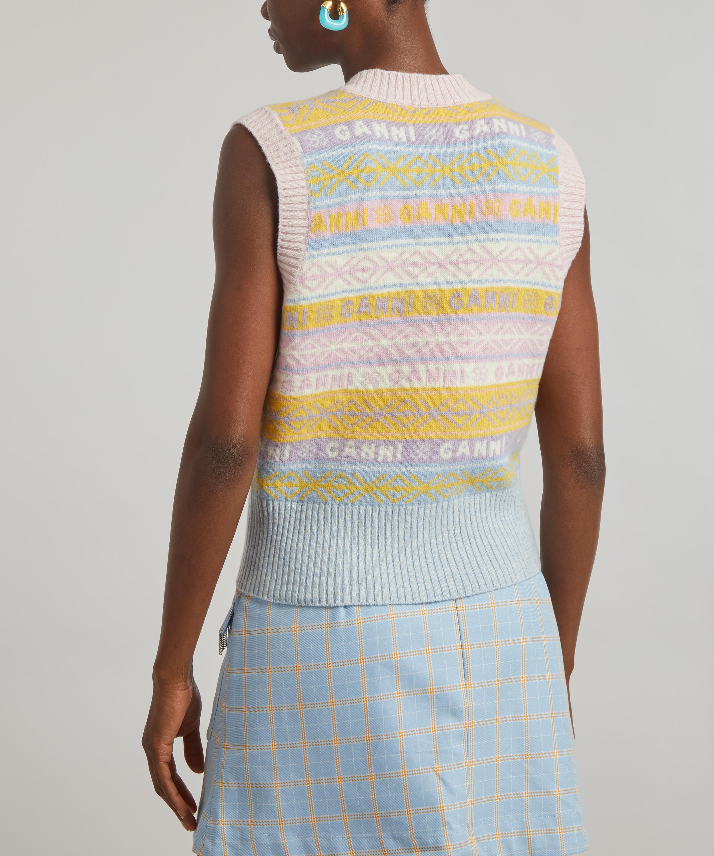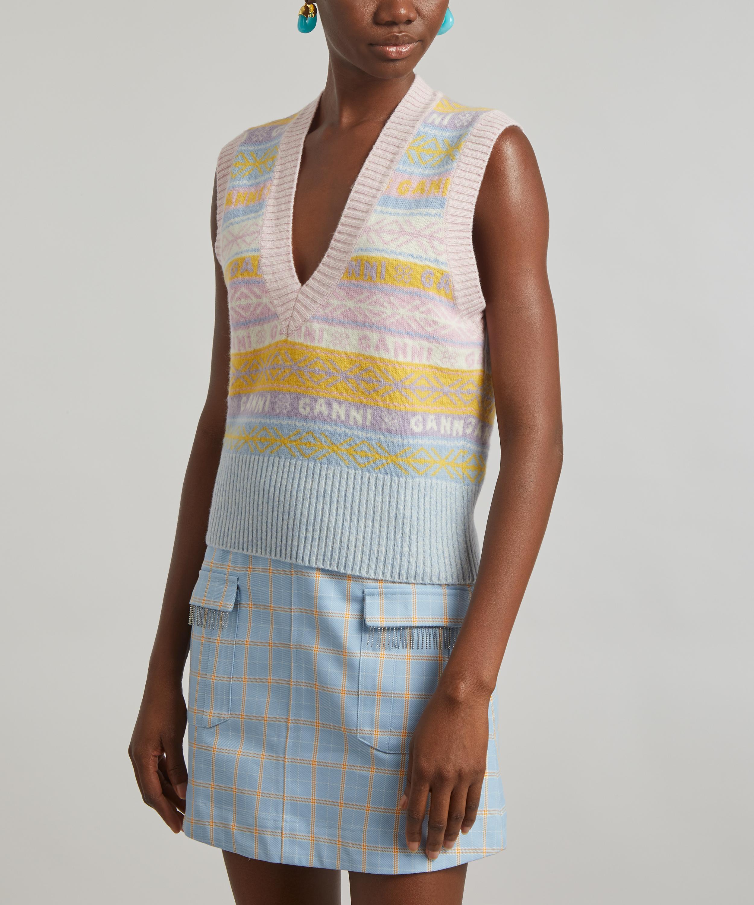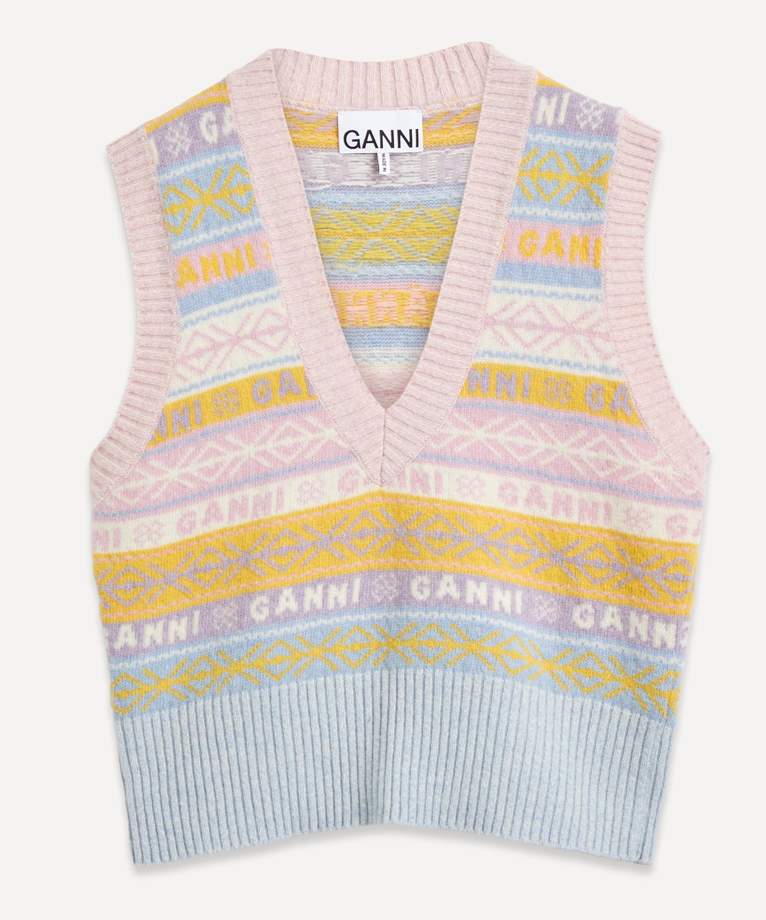 Sustainable and snug, this knitted V-neck vest is from cool-girl Scandinavian label, Ganni. Crafted from a recycled wool and polyester blend, this V-neck vest has ribbed trims and features a pretty pastel blend of tonal pink, lilac, blue and yellow Fair Isle stripes embossed with logo branding.