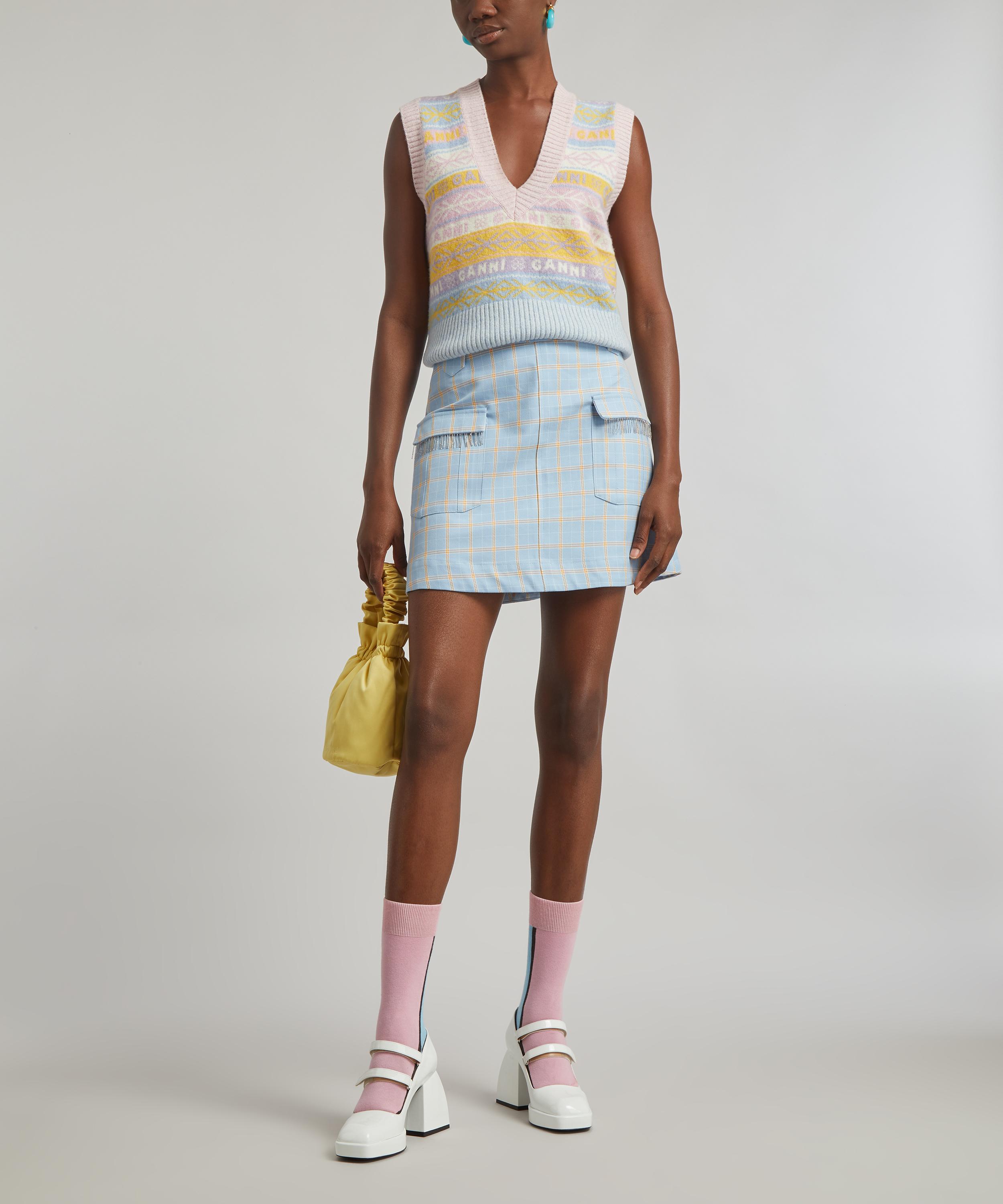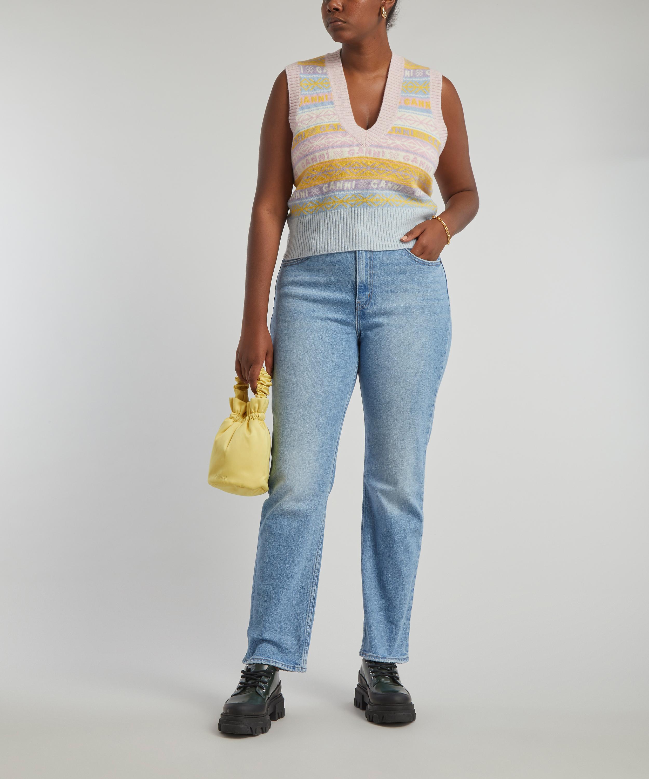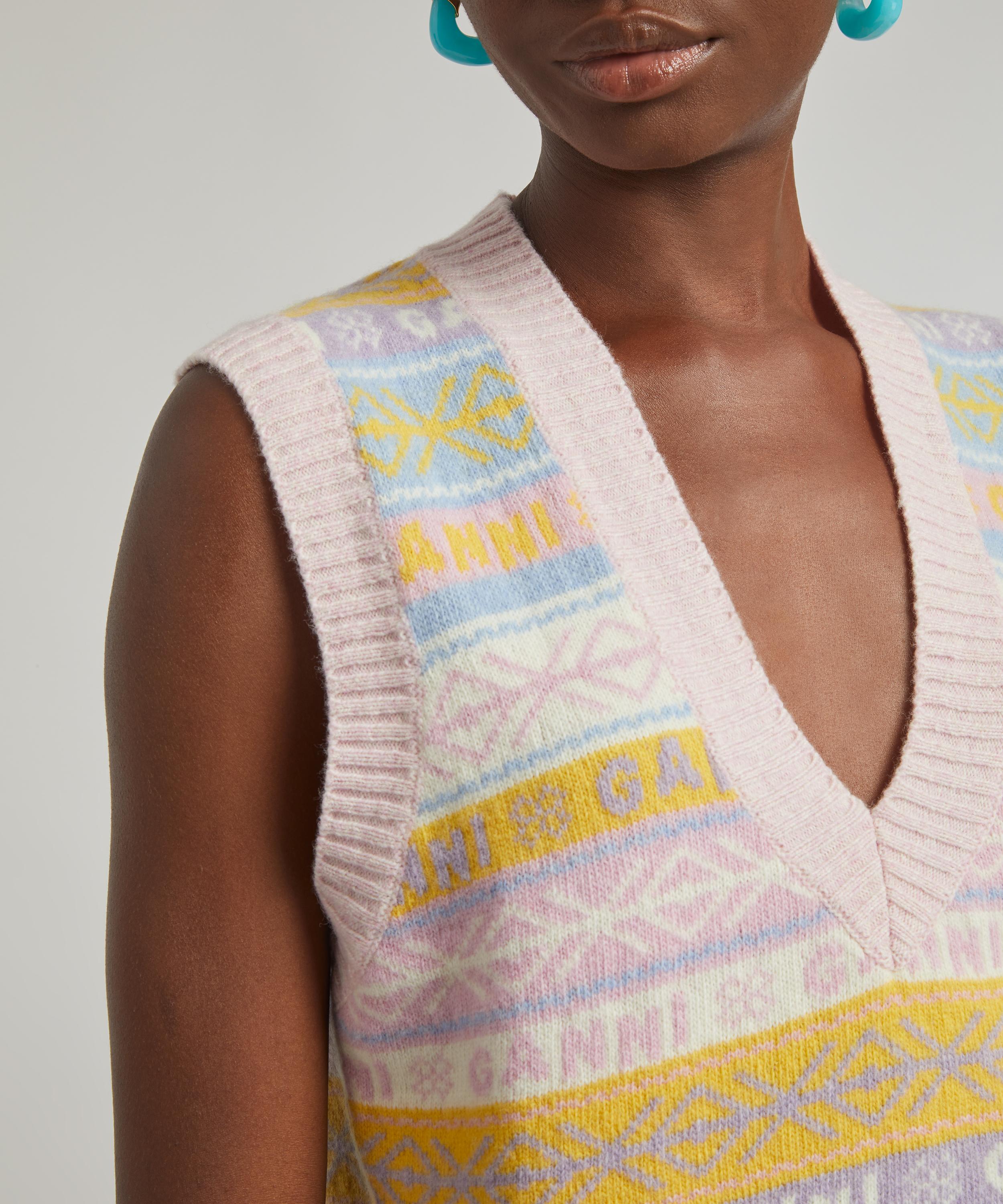 Sustainable and snug, this knitted V-neck vest is from cool-girl Scandinavian label, Ganni. Crafted from a recycled wool and polyester blend, this V-neck vest has ribbed trims and features a pretty pastel blend of tonal pink, lilac, blue and yellow Fair Isle stripes embossed with logo branding.