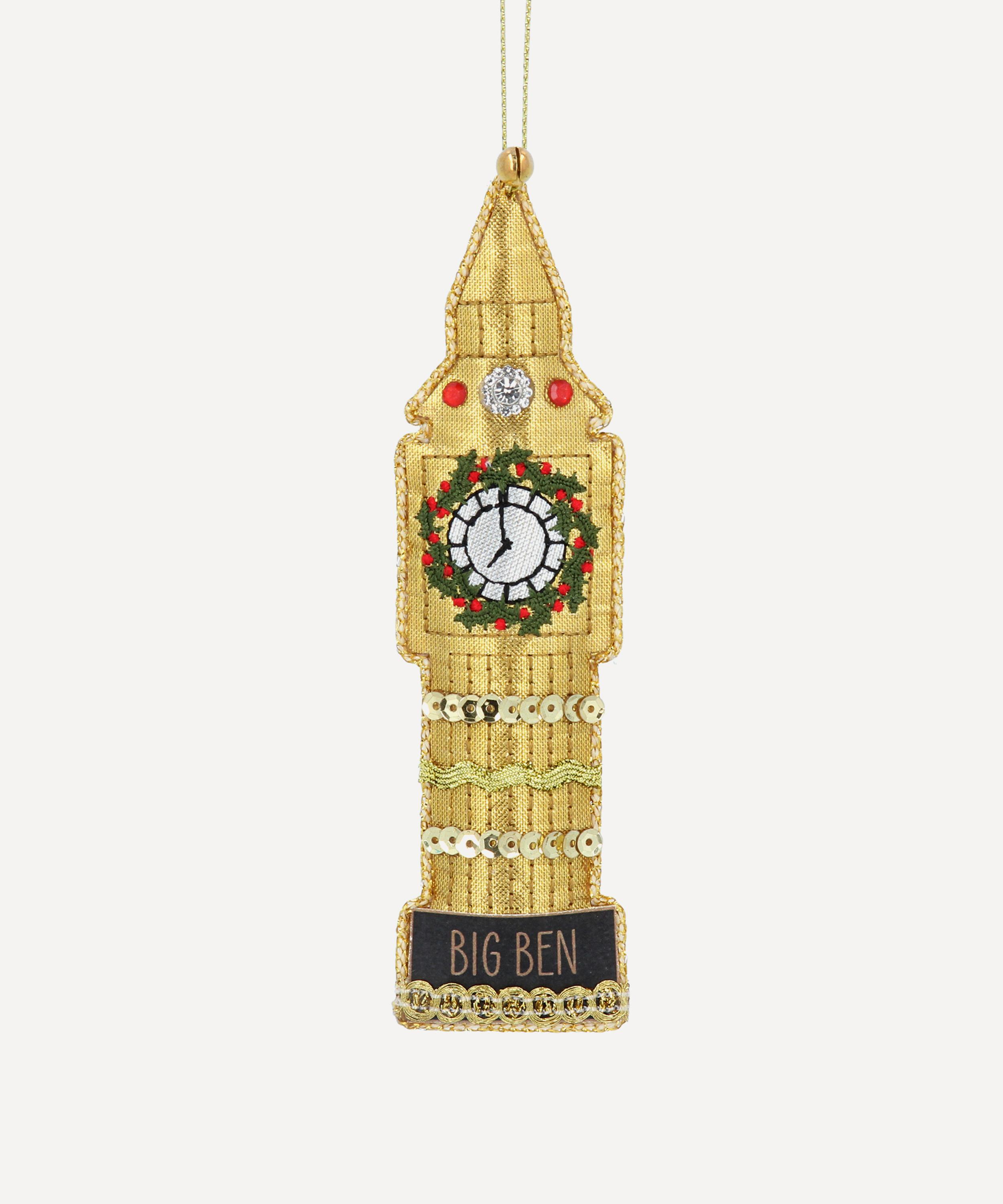 Following the silhouette of the iconic London monument, this decoration exudes opulence with its garland detailing and sequin accents. Incorporate it into a traditional scheme to add a subtle statement, or consider pairing it with other travel and novelty ornaments for a whimsical, themed tree.