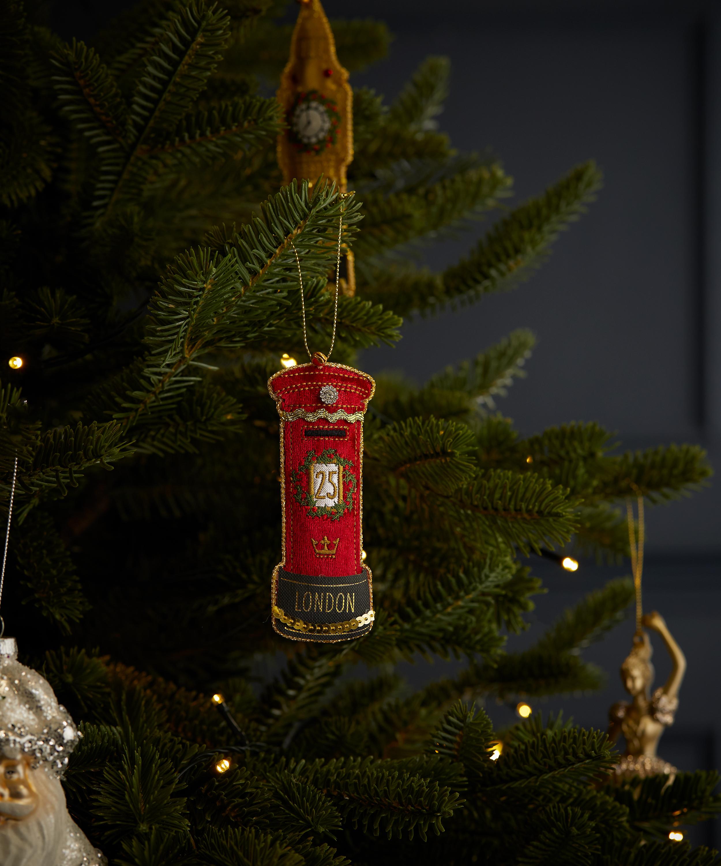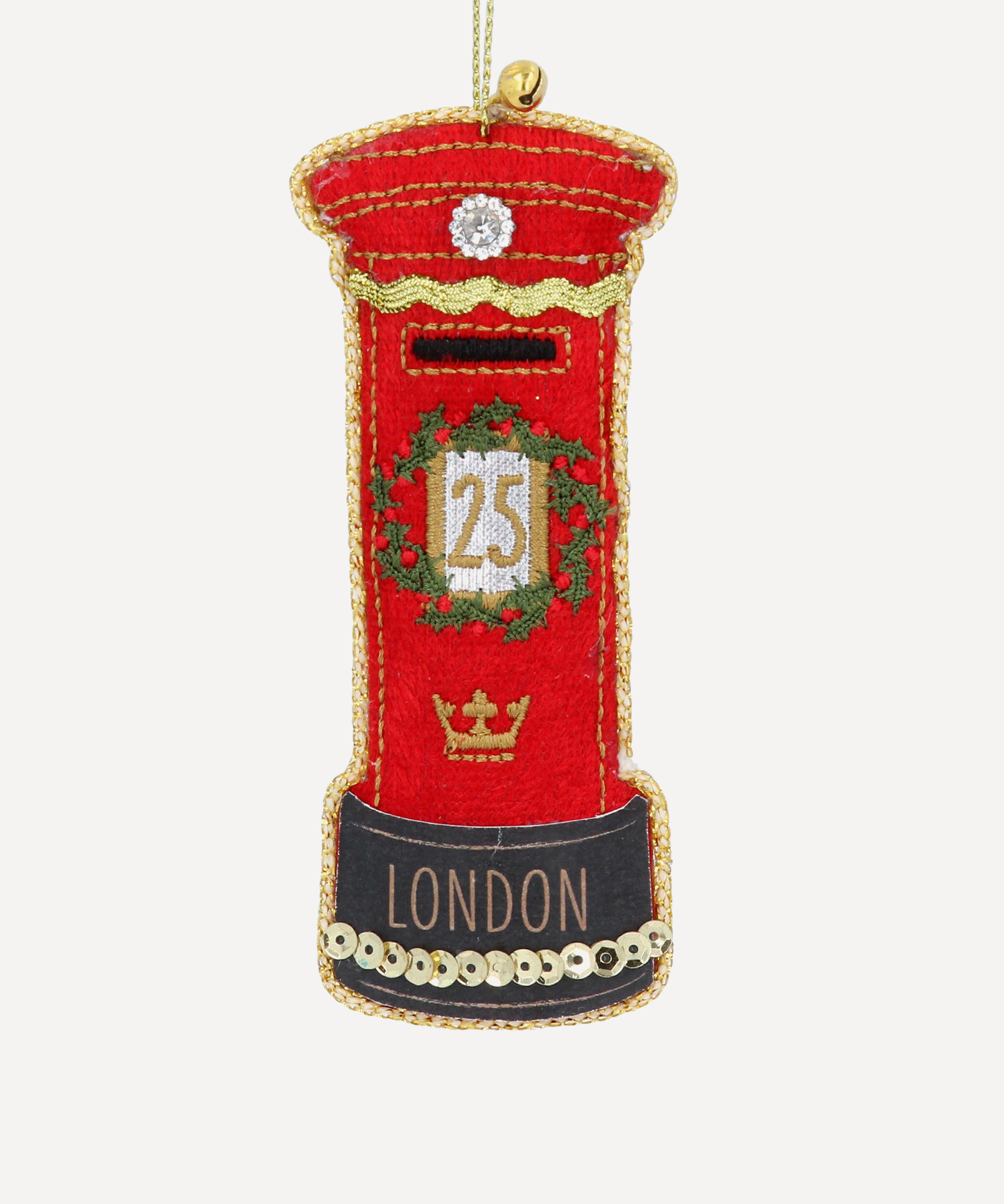 Following a silhouette of a traditional London post box, this decoration exudes opulence with its garland detailing and sequin accents. Incorporate it into a traditional scheme to add a subtle statement, or consider pairing it with other travel and novelty ornaments for a whimsical, themed tree.