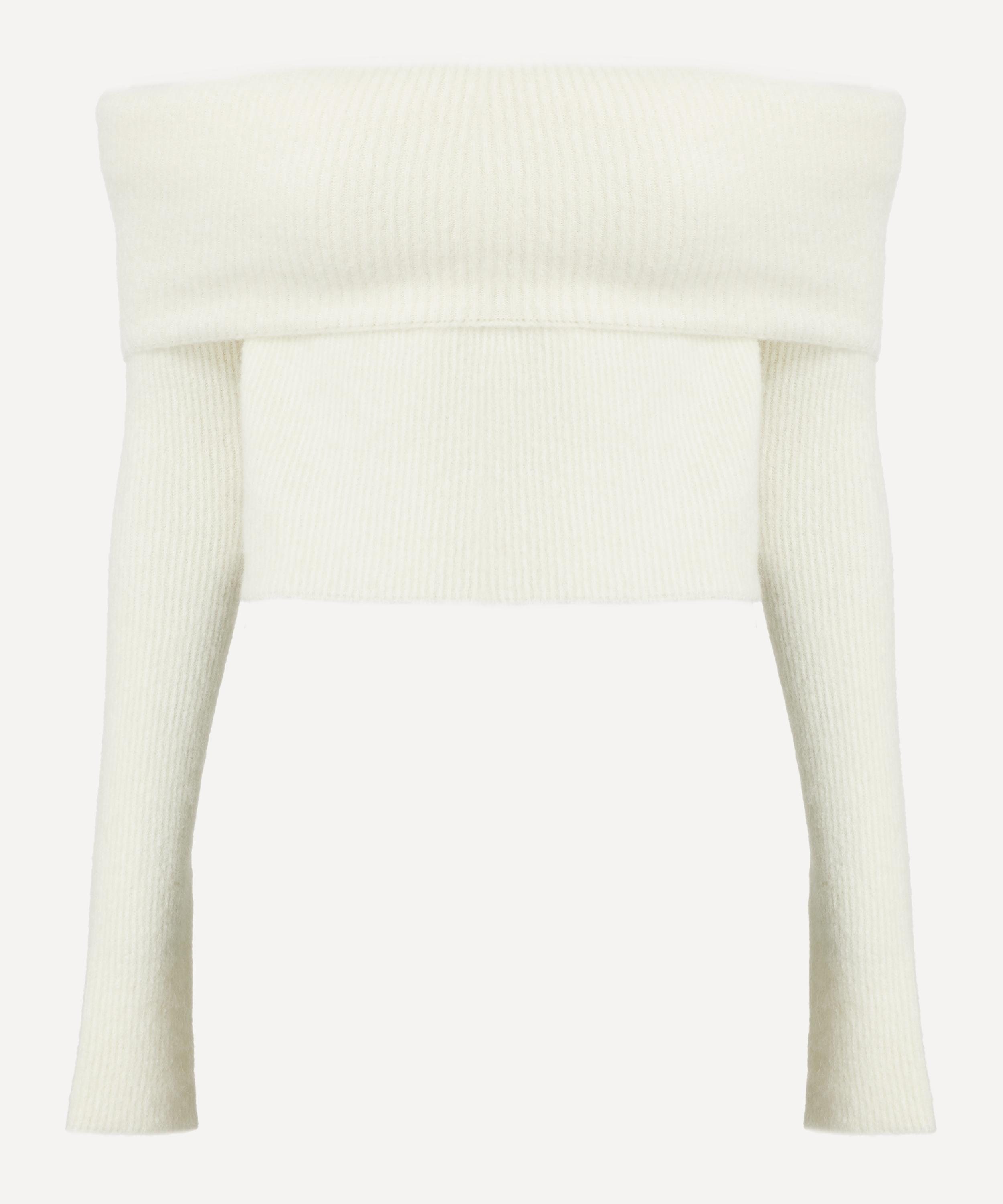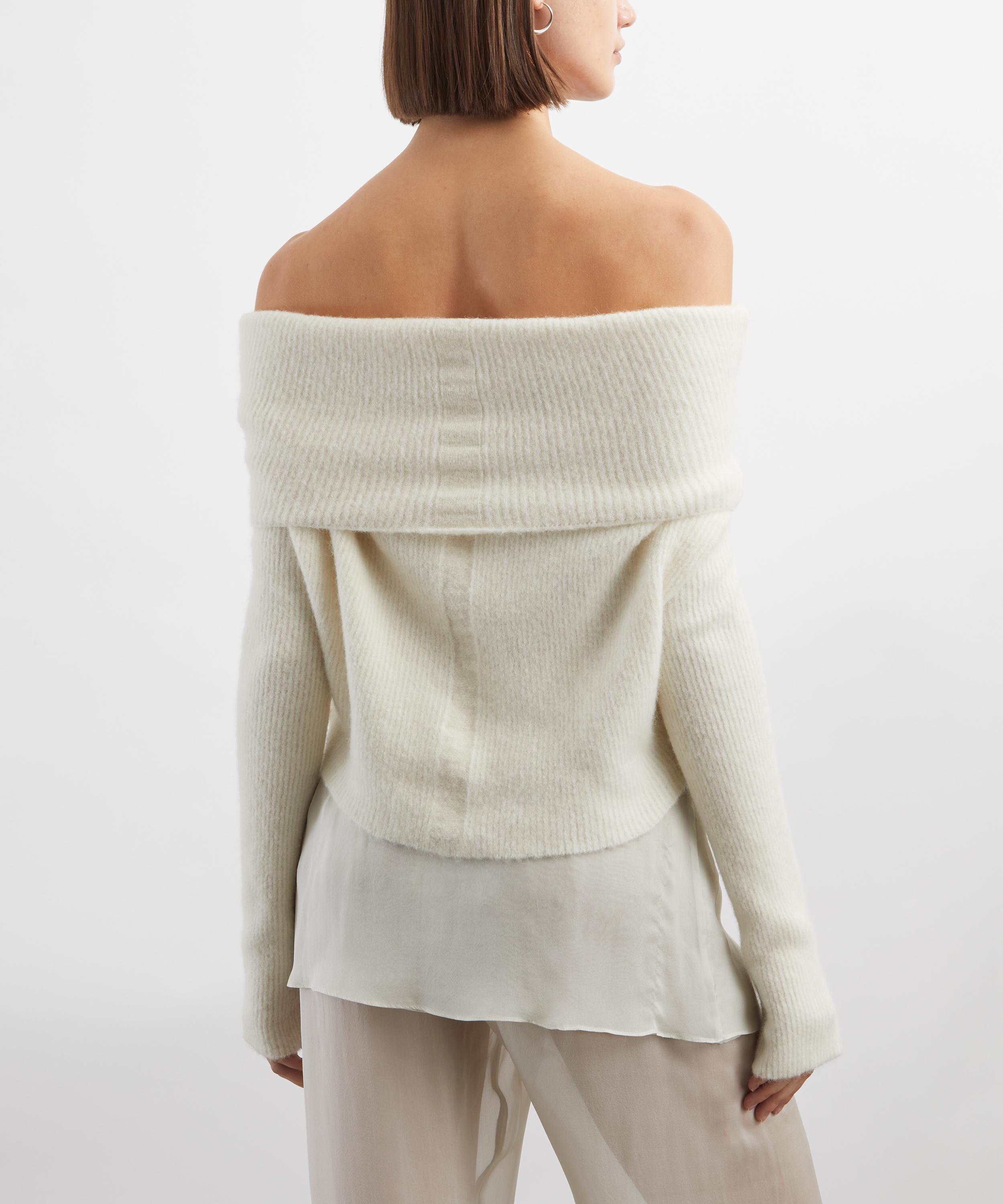 Crafted from wool, this ribbed knit showcases an off-the-shoulder silhouette, defined by a cowl neckline and long sleeves. A signature knit line tracing the spine adds a quietly distinctive finish.