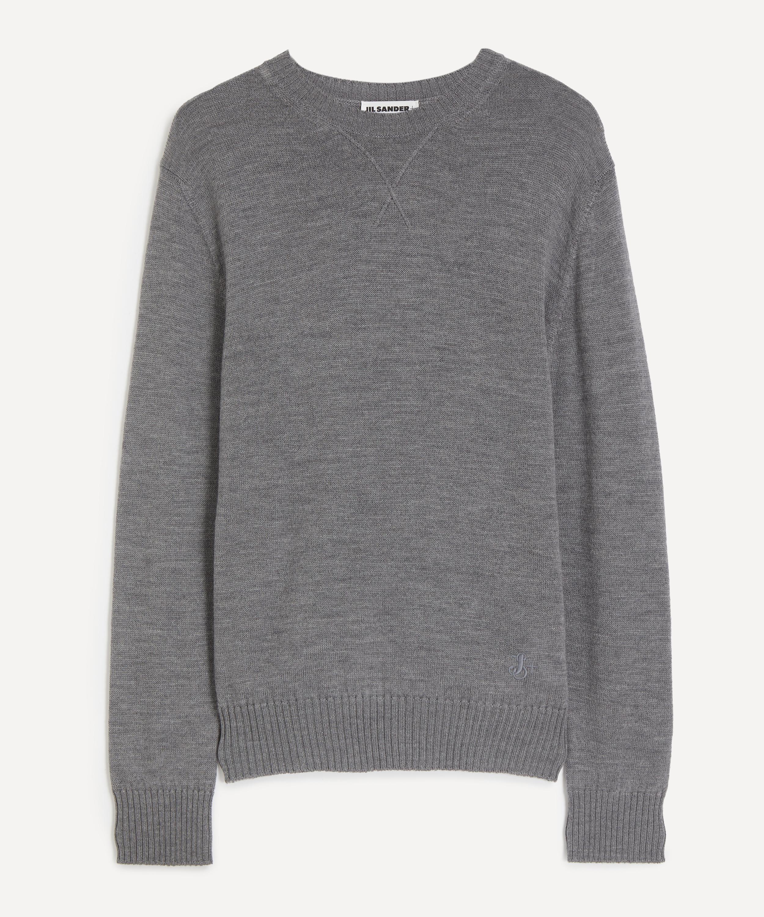 Masterfully crafted in Italy from pure virgin wool, this grey long-sleeve knit is defined by a classic crew neckline, ribbed trims, and subtle Jil Sander embroidery at the hip for a refined signature finish.
