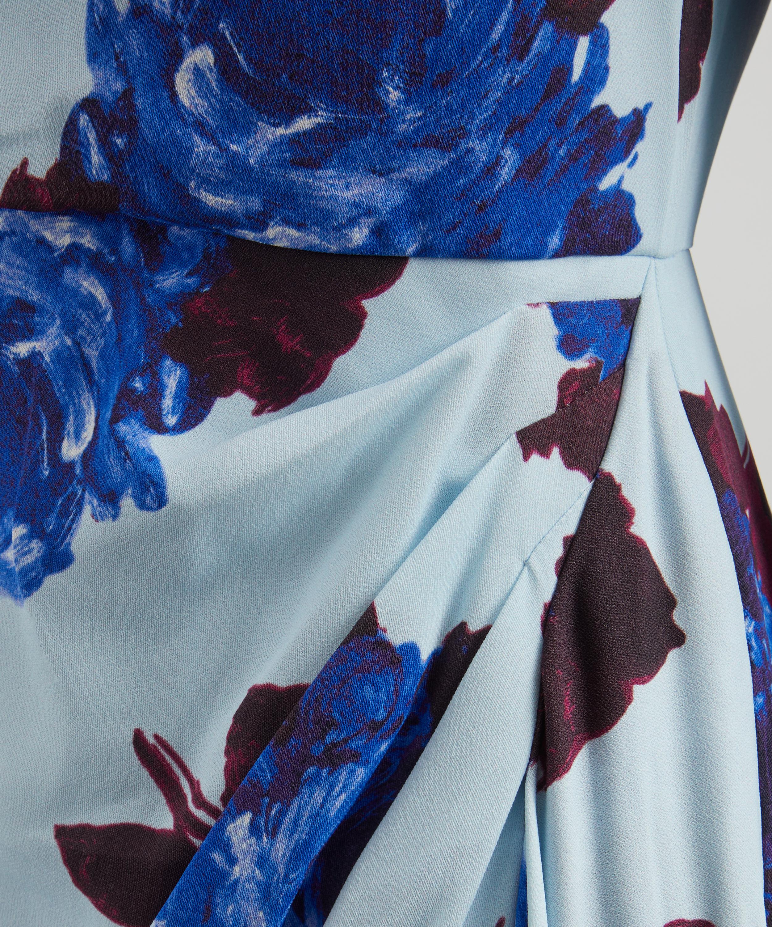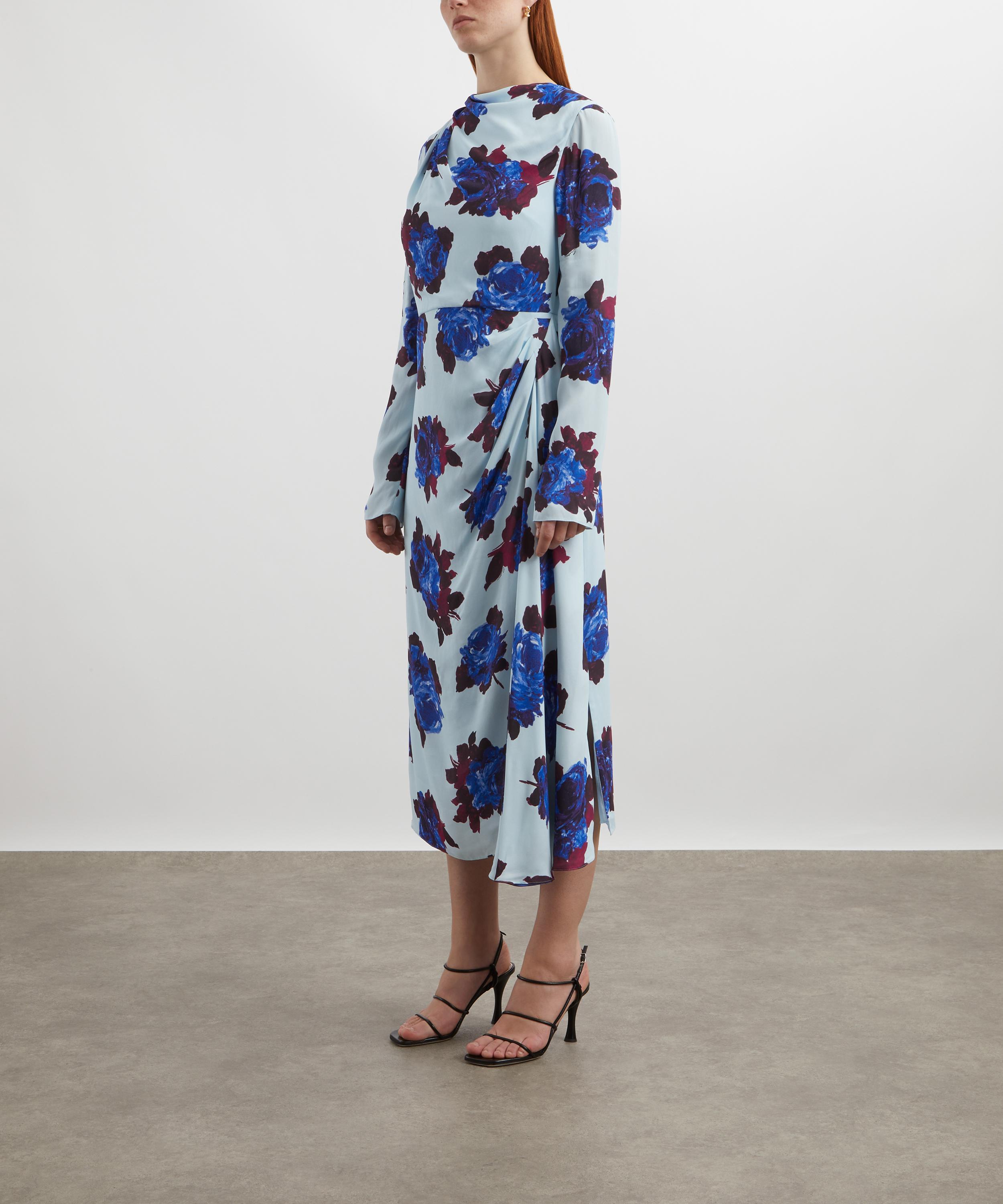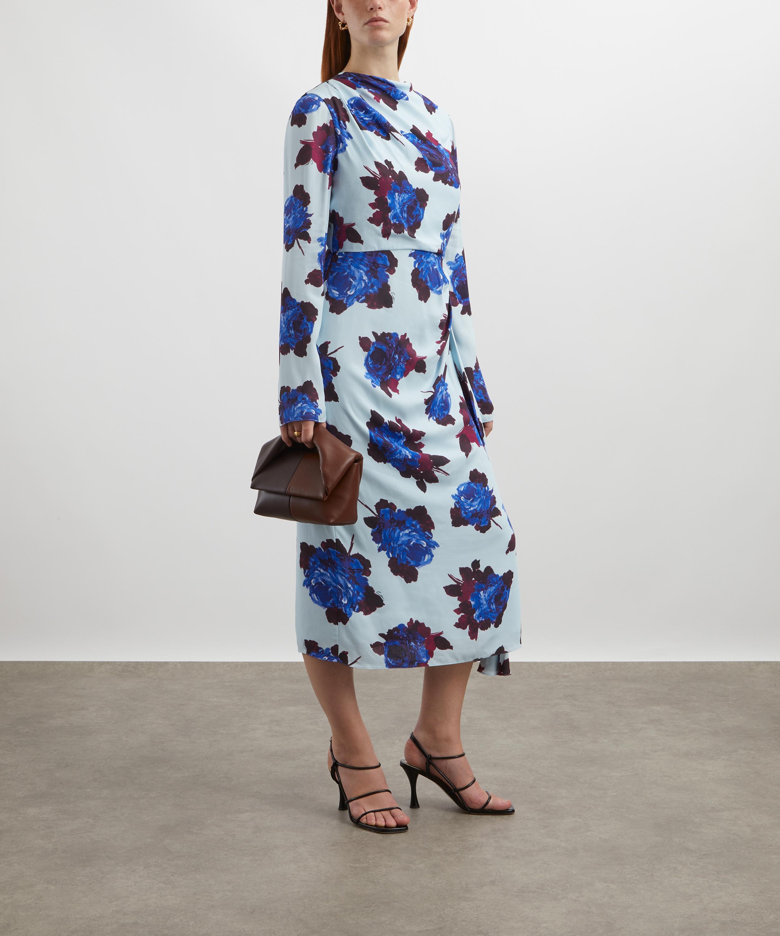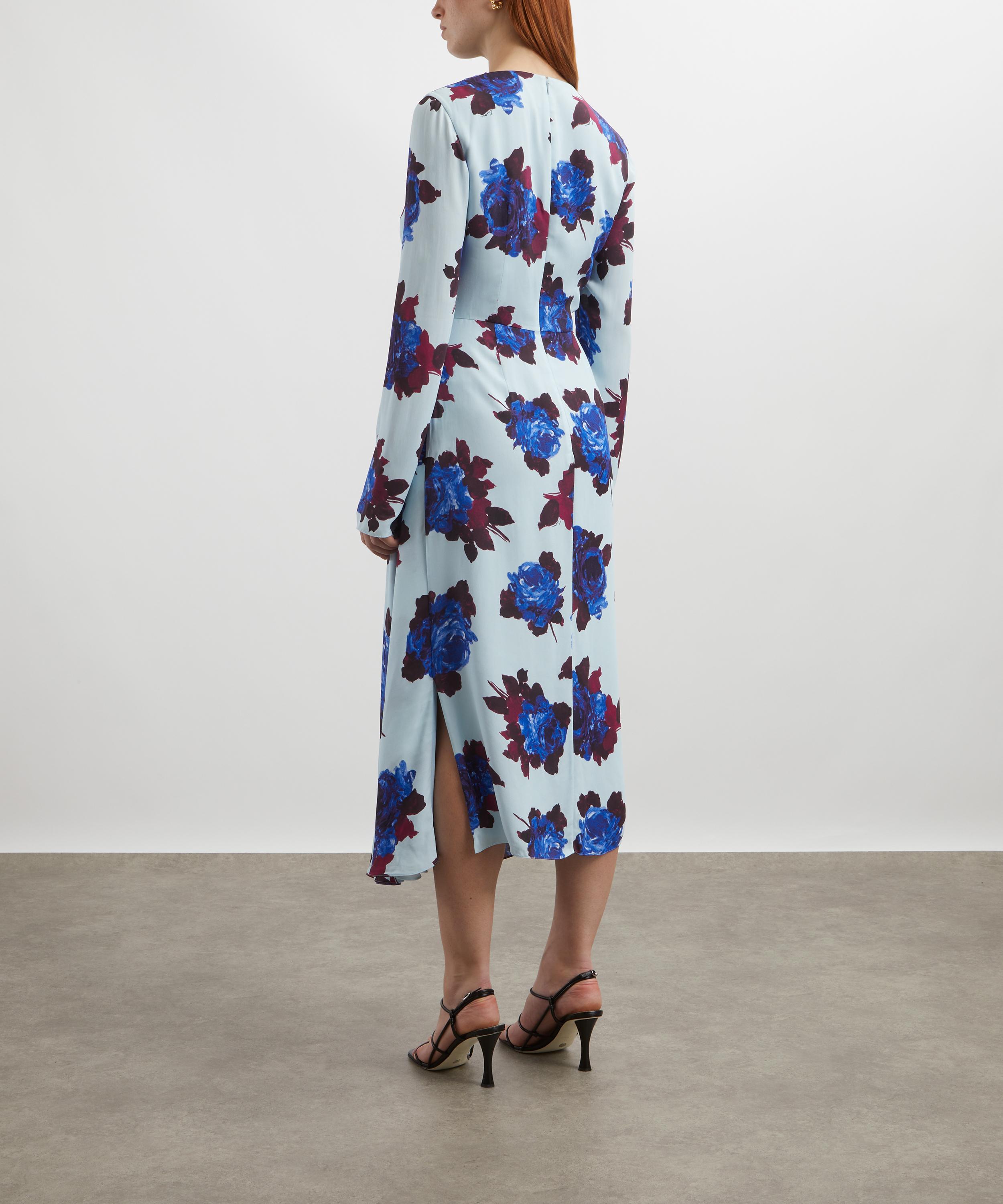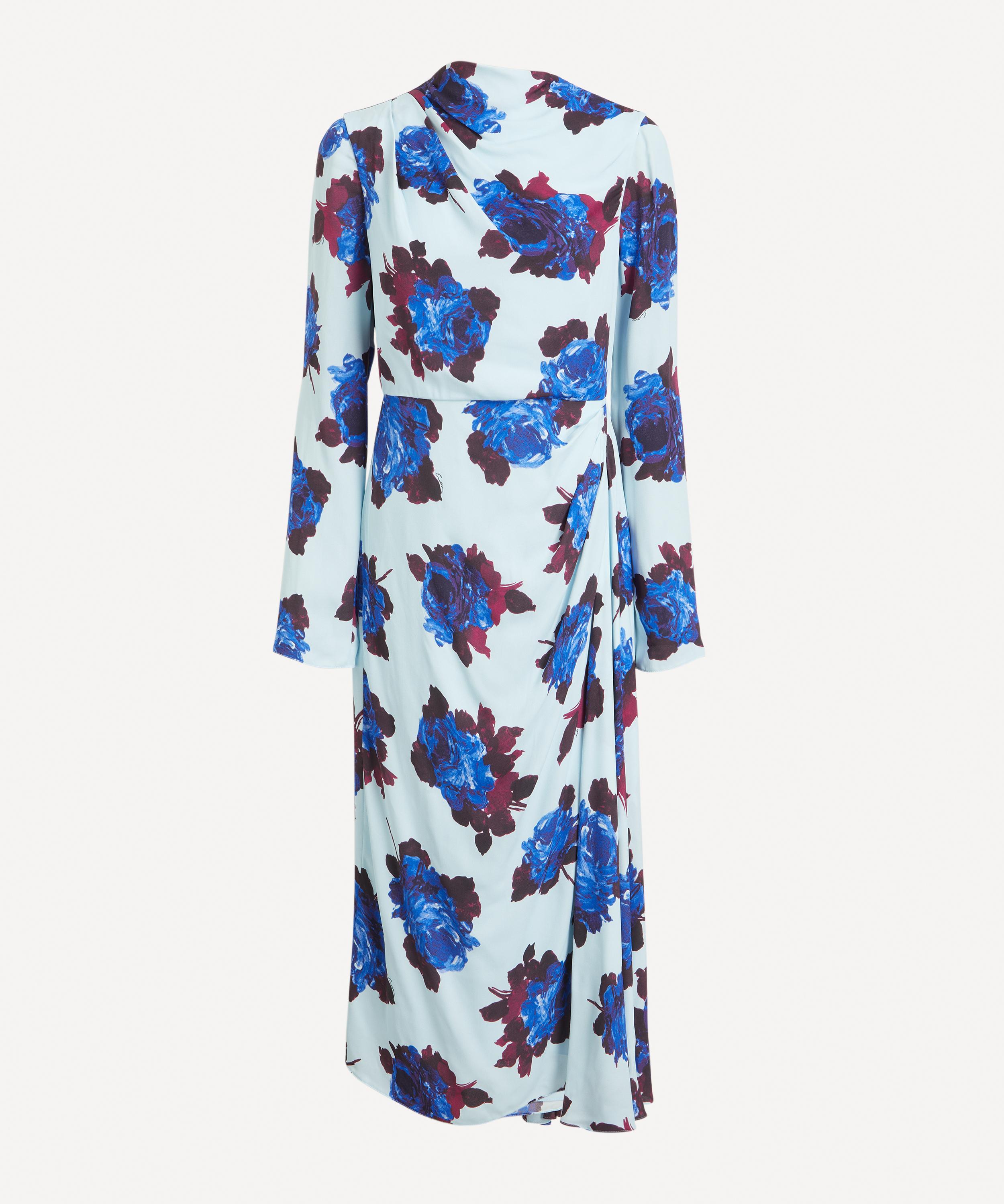 Made from lightweight ice blue viscose crepe, this elegant Erdem dress showcases this season’s Rossini Rose print in indigo and elderberry tones, inspired by the bold mid-century florals worn by opera singer Maria Callas off stage. Cleverly draped to fit and flatter the figure, this mid-length dress features a high neckline, gathered waist, and asymmetric hem.