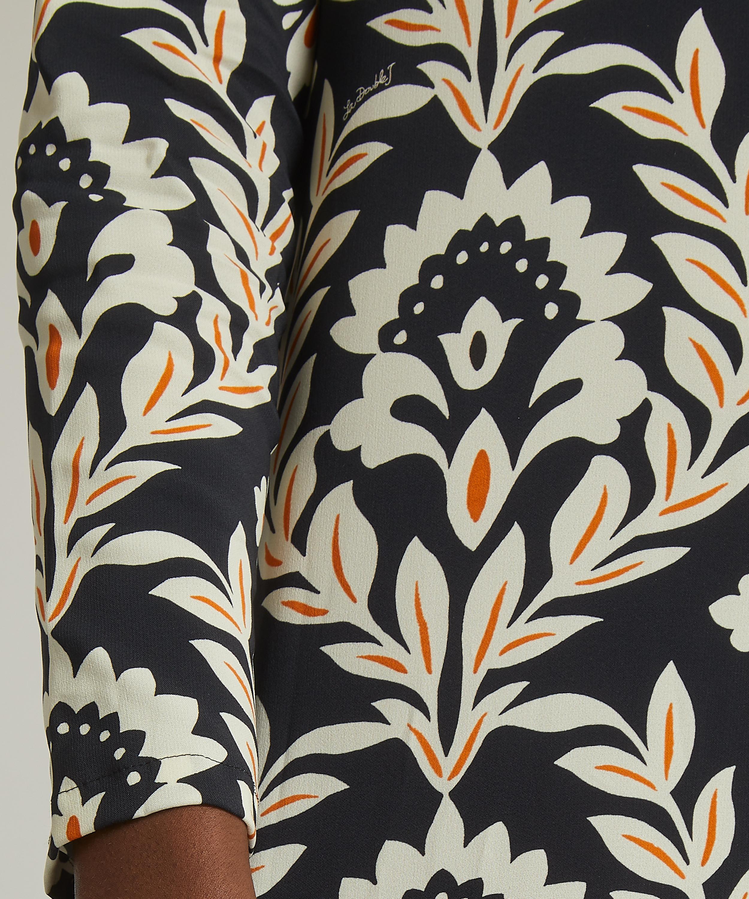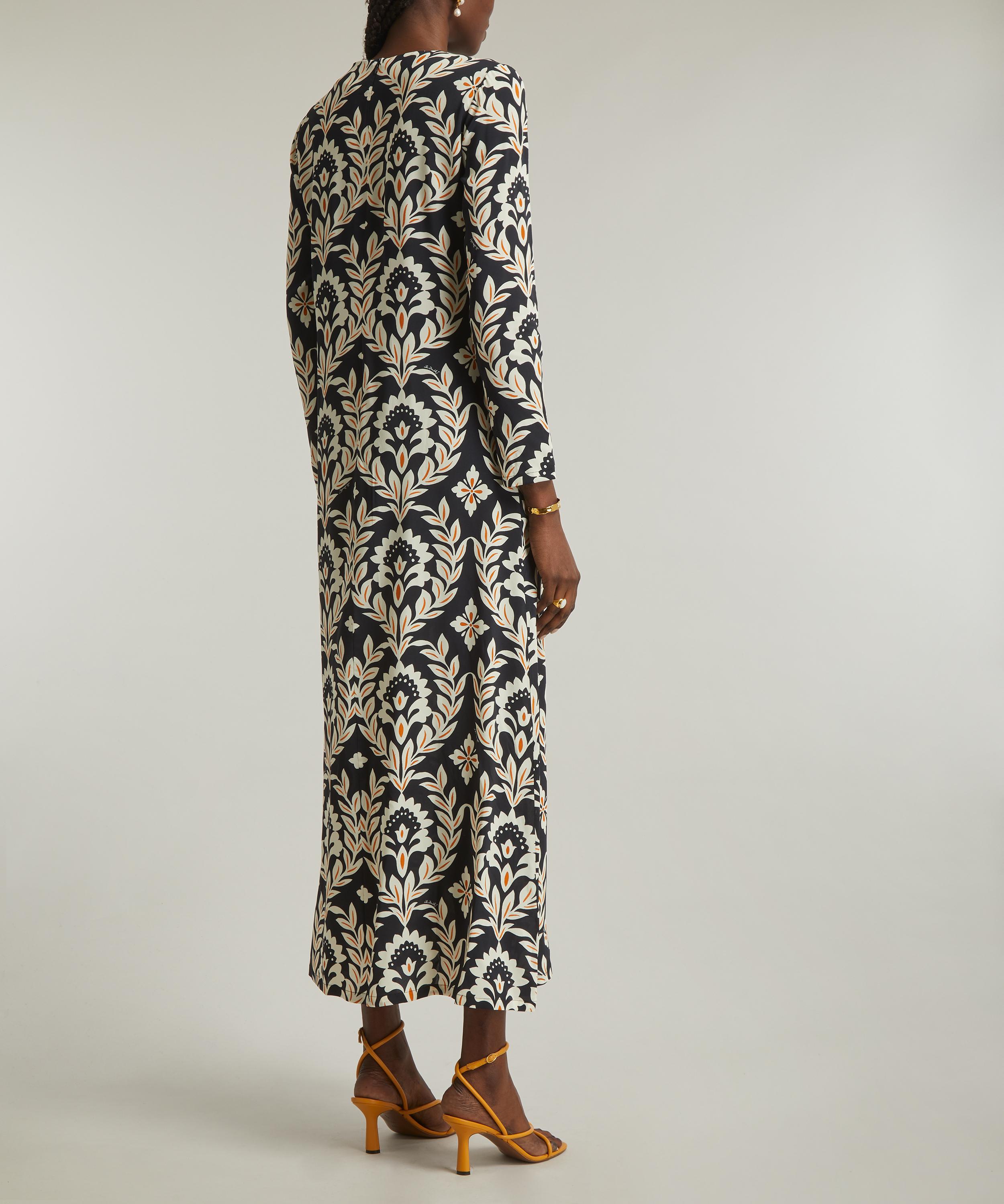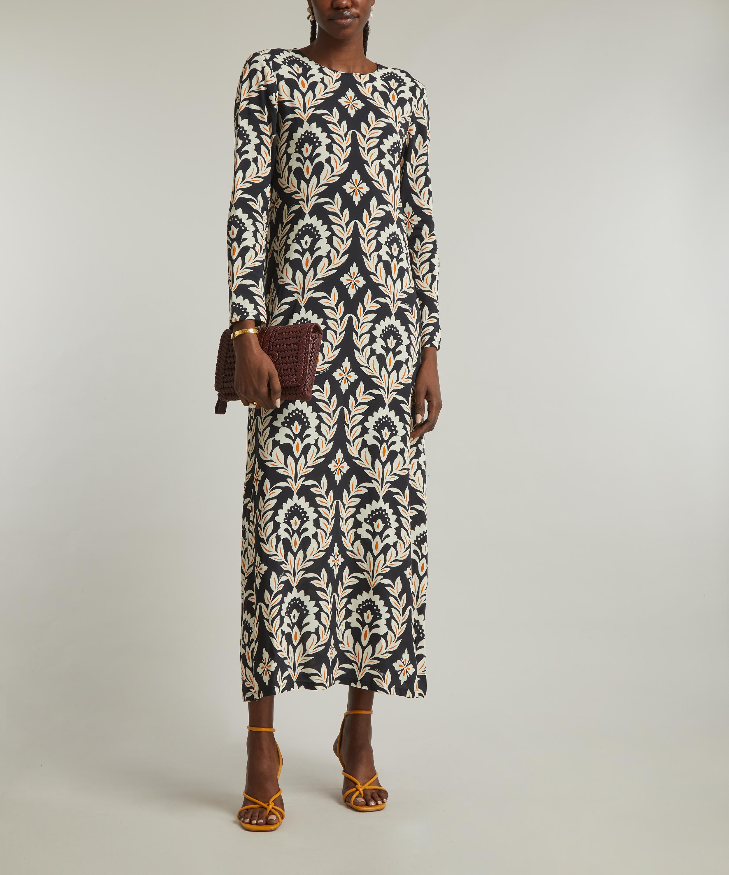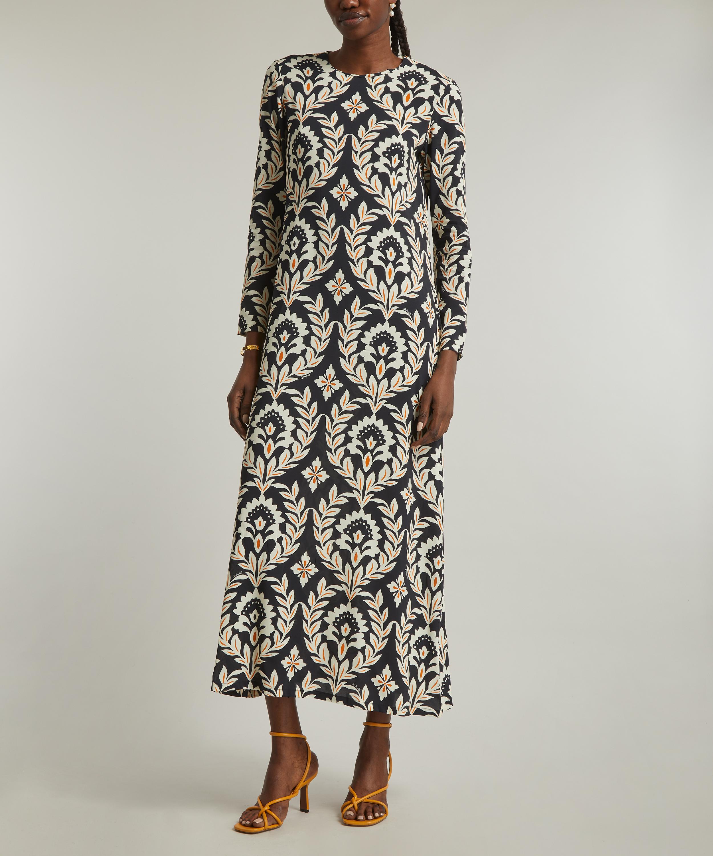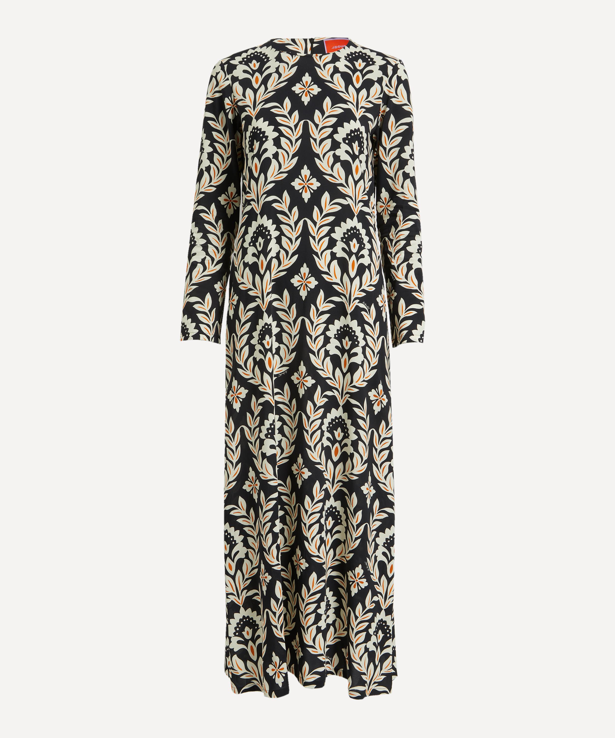 Long and loose in stretchy sablé fabric, this long sleeve maxi-dress boasts a flattering A-line silhouette that’s slim in the shoulders, and generous on the hips. Elegant and eye-catching, it’s adorned all-over in the bold and blooming Black Ghirlinda floral print.