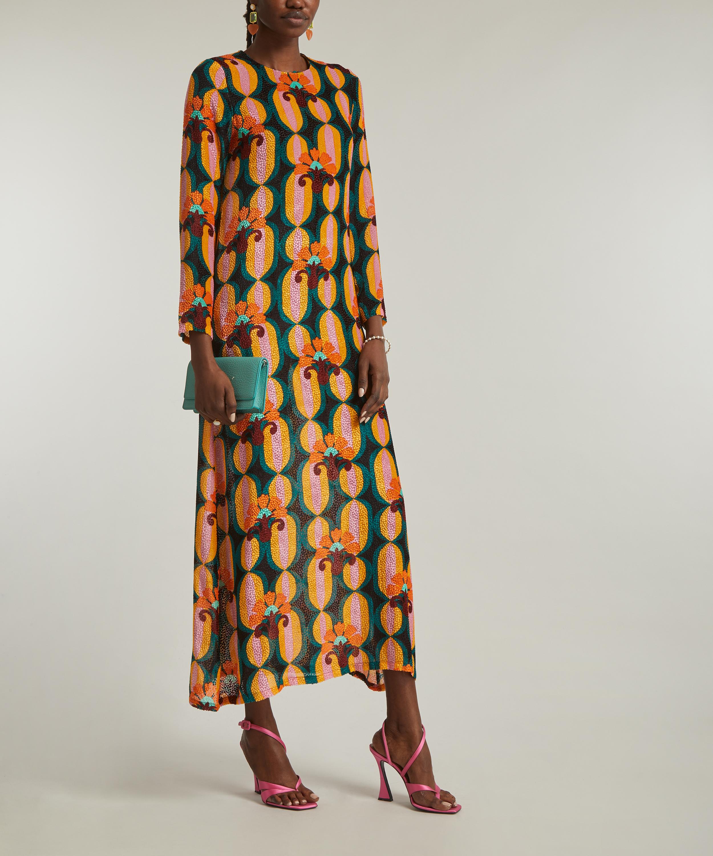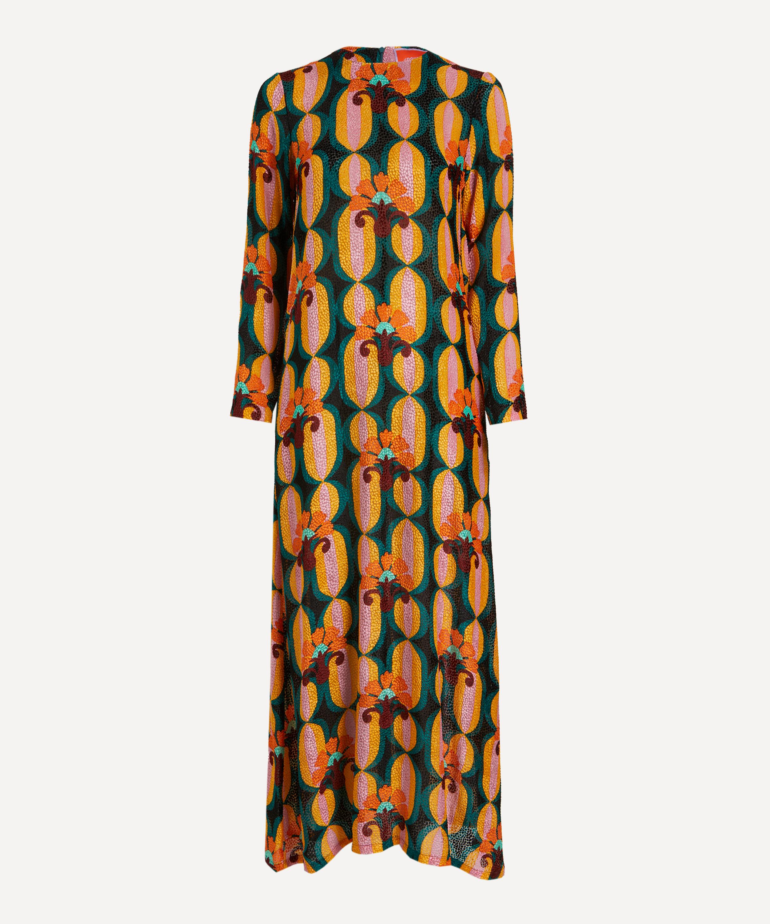Long and loose in luxe velvet Devoré fabric, this long sleeve maxi-dress boasts a flattering A-line silhouette that’s slim in the shoulders, and generous on the hips. Elegant and eye-catching, it’s adorned all-over in the bold and blooming Arcturus Blue Petrol floral print.