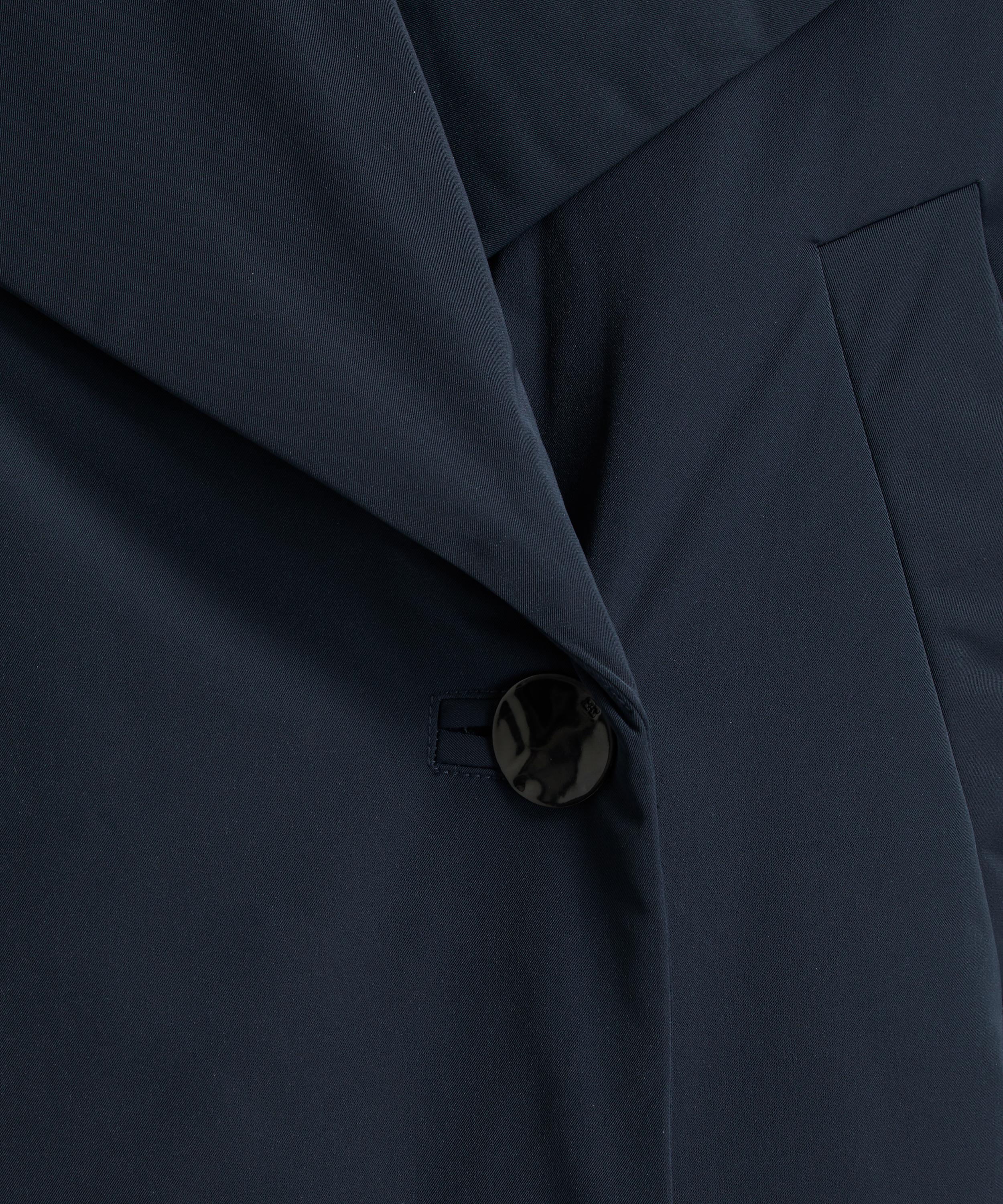 This lightweight twill coat is designed for a slightly oversized silhouette with a wrap-over front button closure, an exaggerated notched lapel, and two welt side pockets placed near the chest for a striking, off-beat finish.