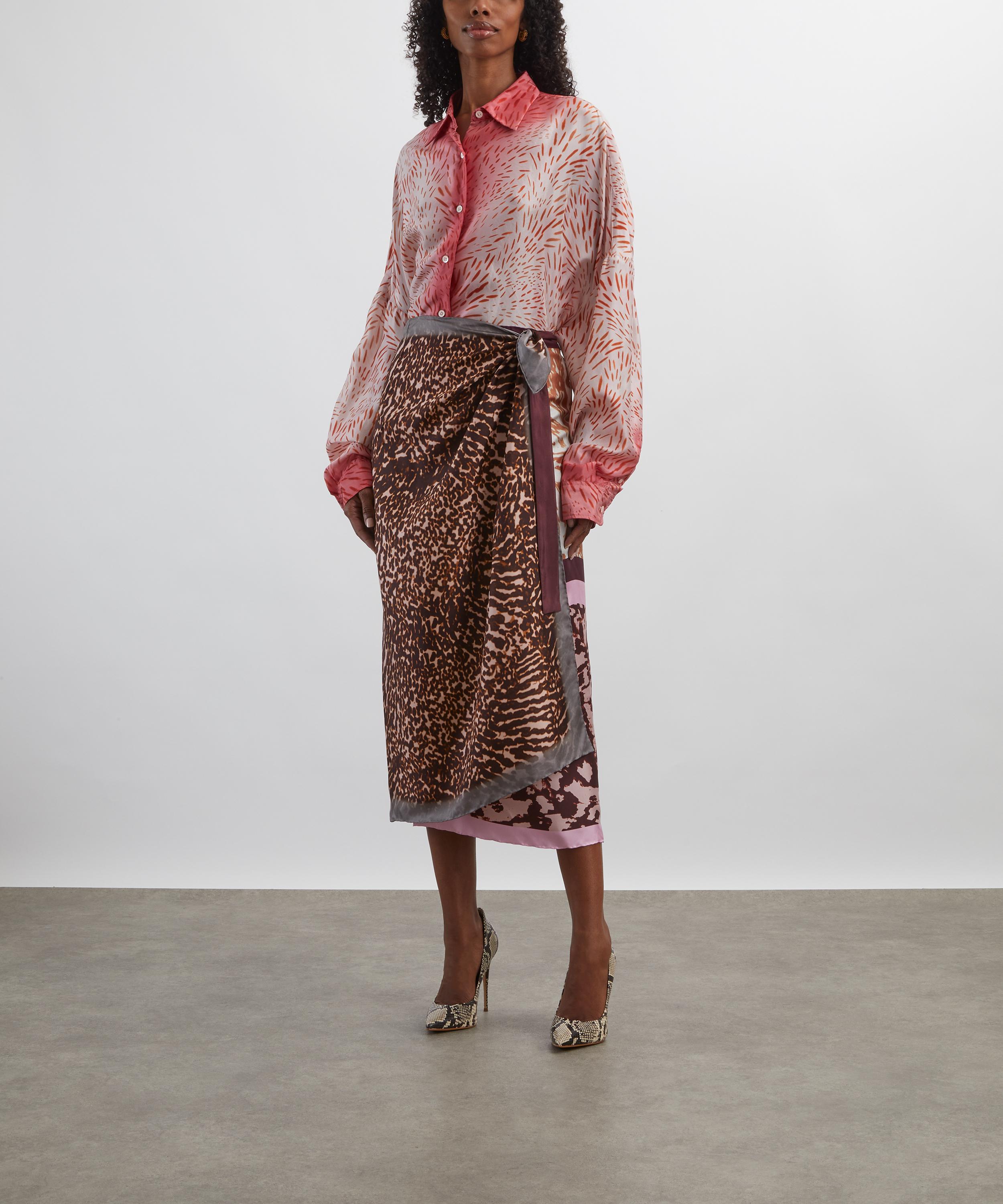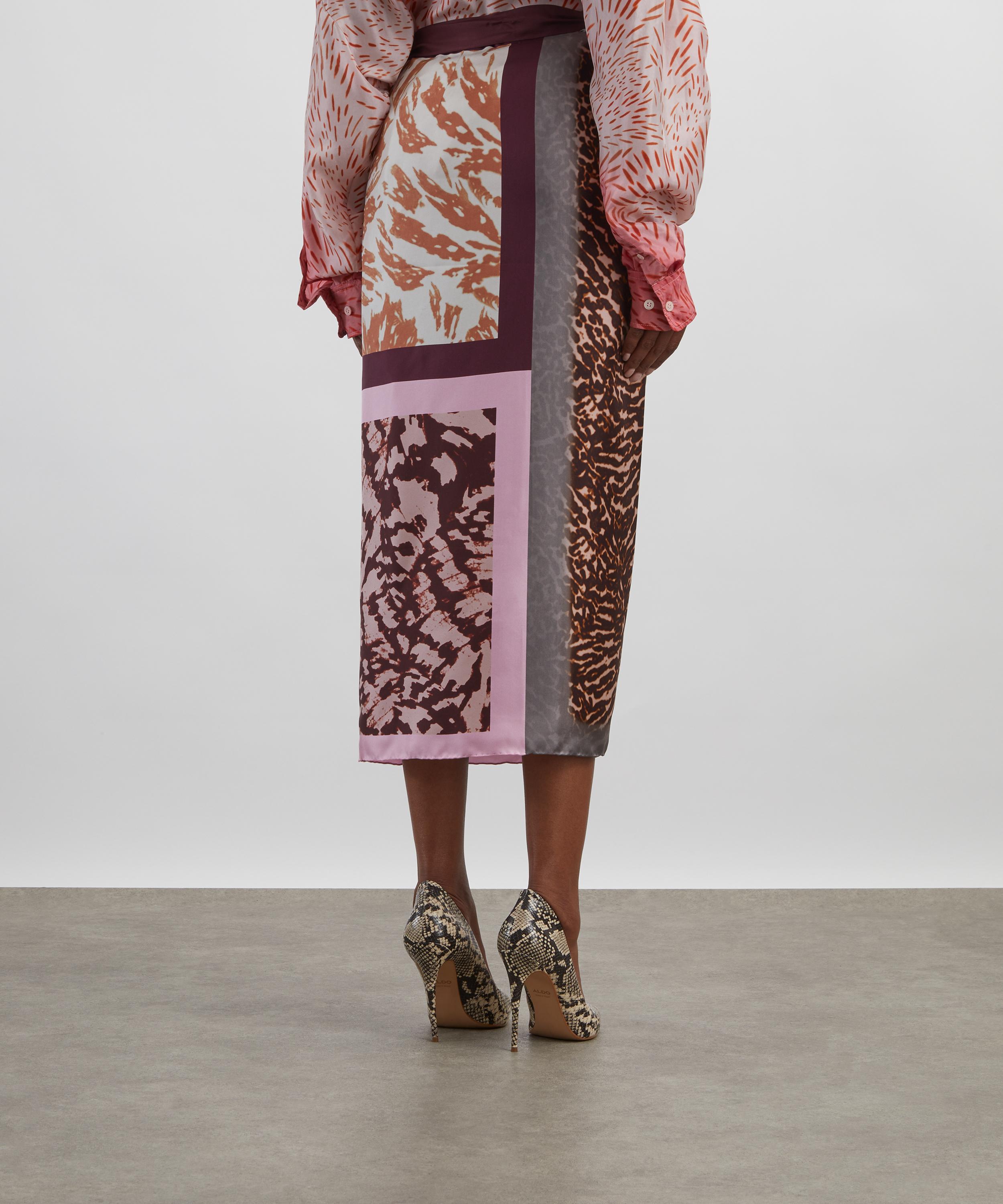 Constructed from an eclectic mix of floral collage scarves, this silk midi skirt showcases a refined wrap design, secured with waist ties for a customisable, tailored fit.