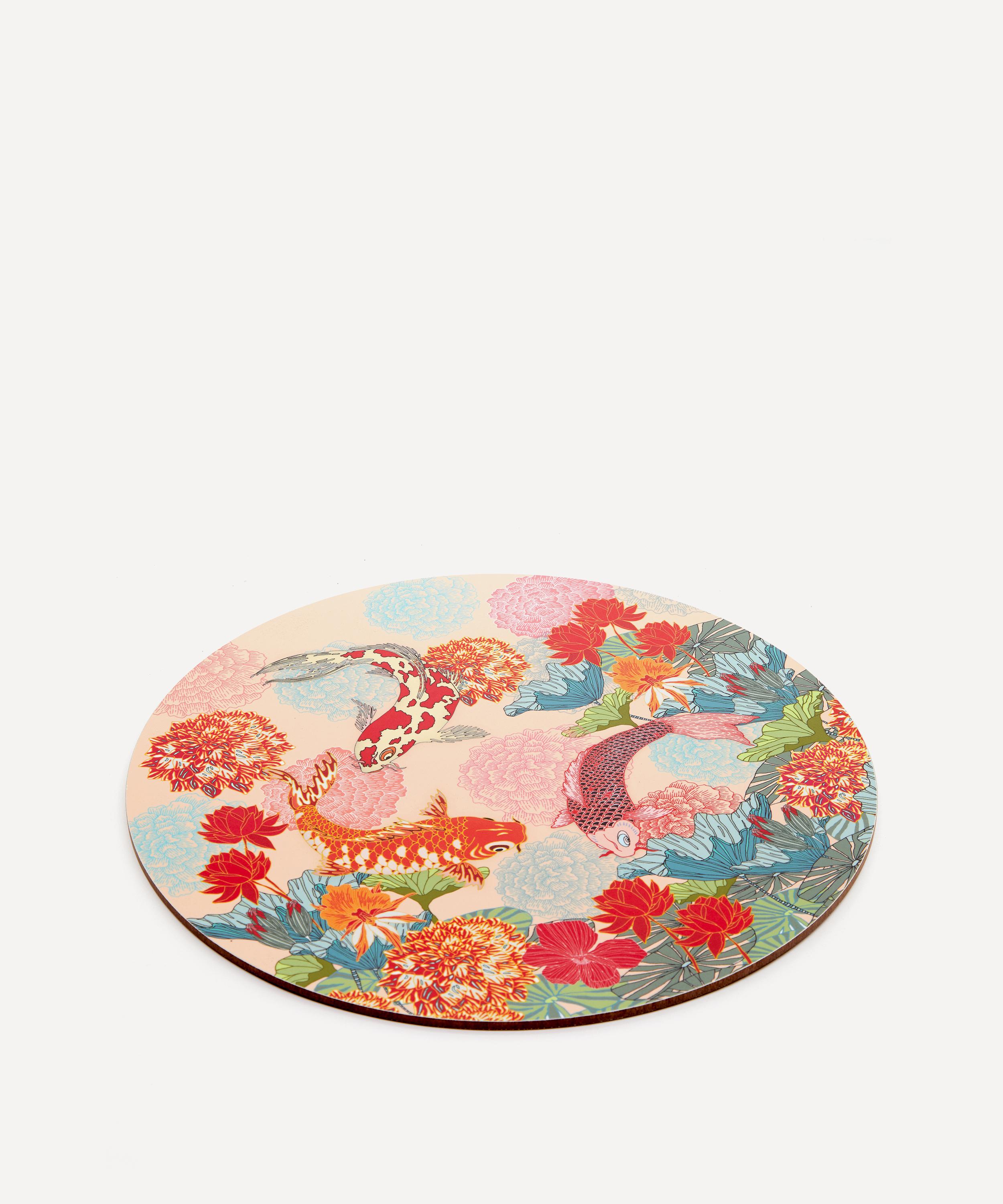The perfect balance between tradition and contemporary, this round table mat is inspired by the simplicity and elegance of the Orient lifestyle. A truly individual piece, pink and red Koi fish weave their way through the red lotus flowers, irises and grasses in an enlightening, oriental scene. With a non-slip base and protective melamine coating, this table mat is as practical as it is appealing – buy multiples to create your own characterful dining curation.