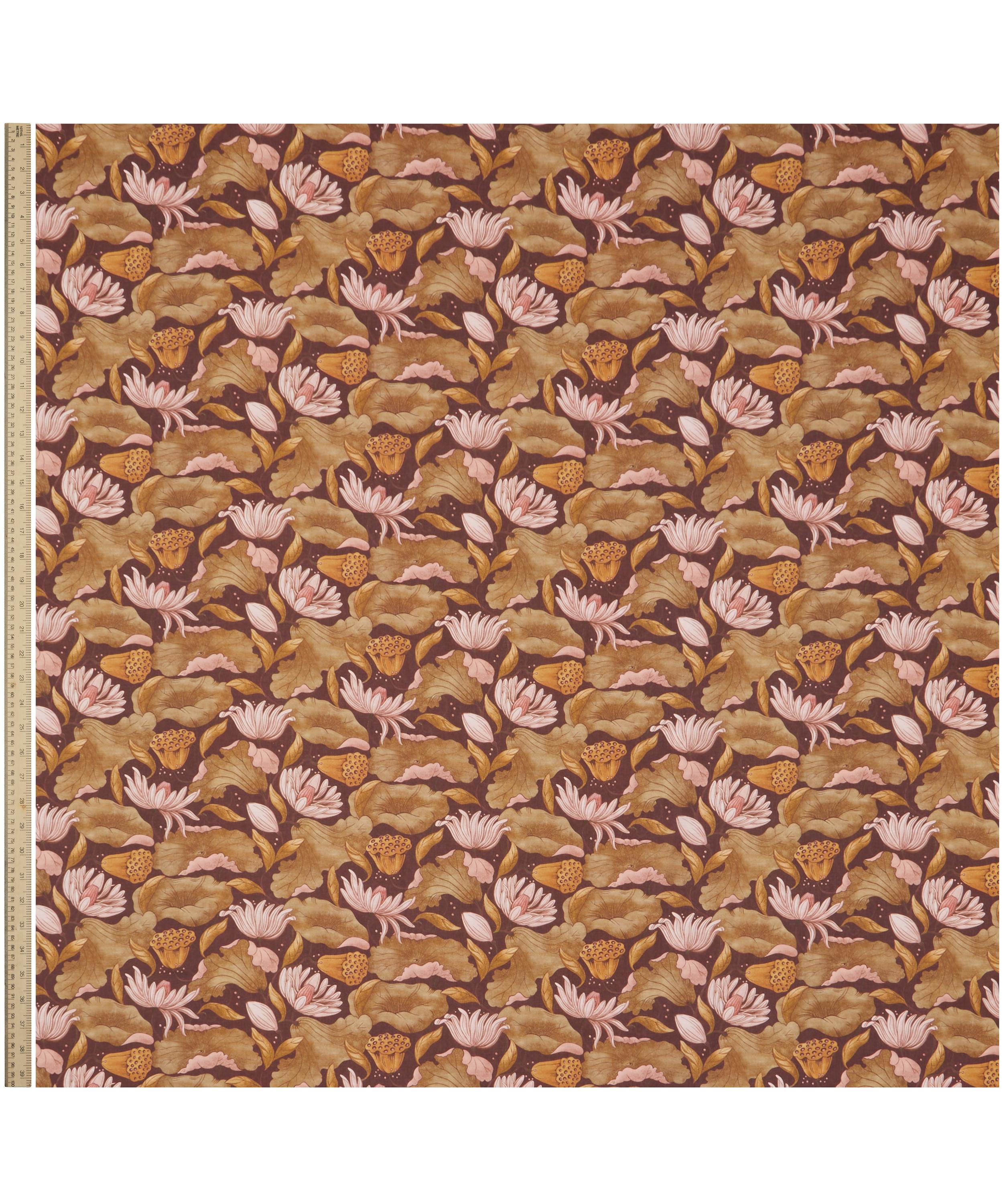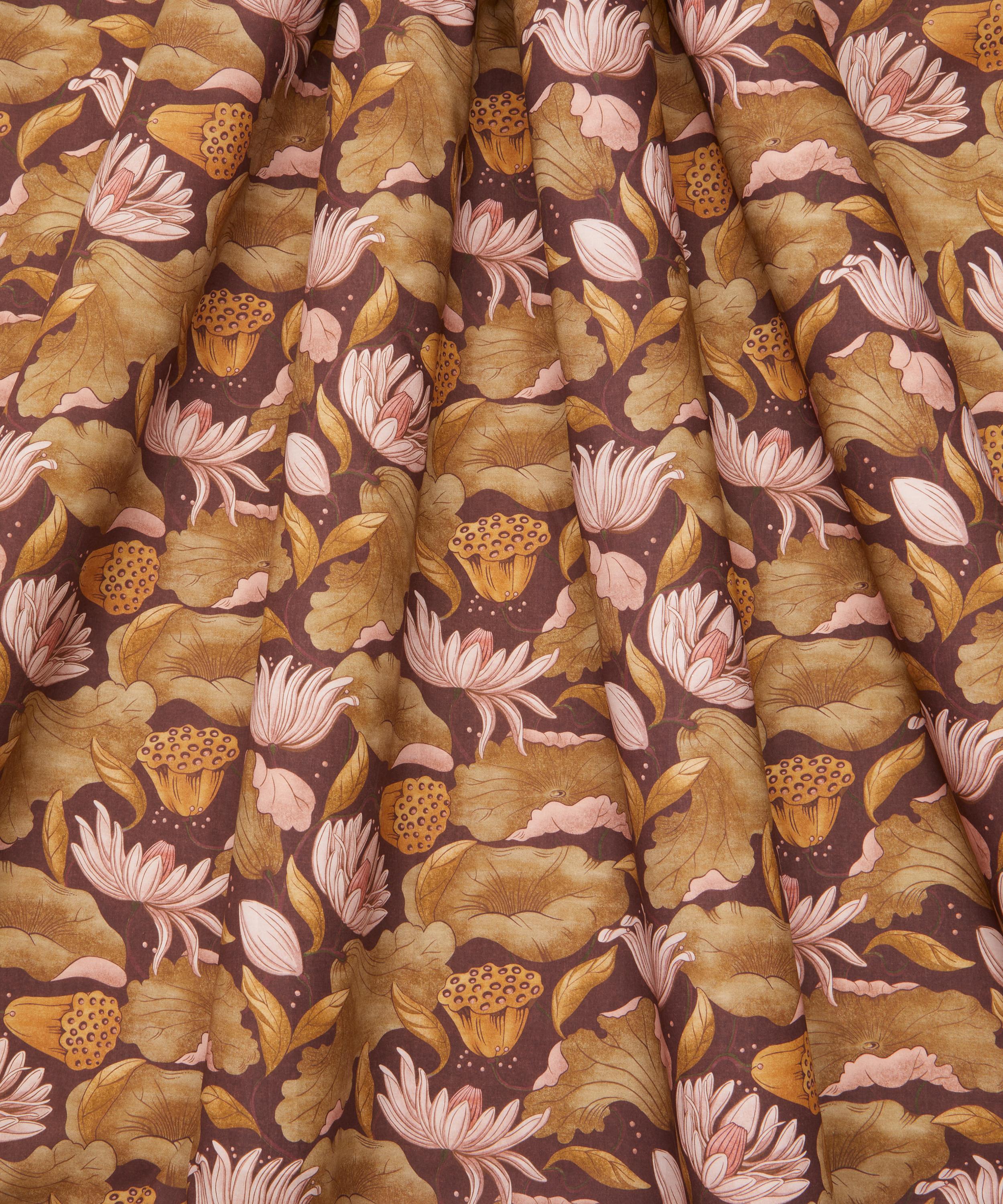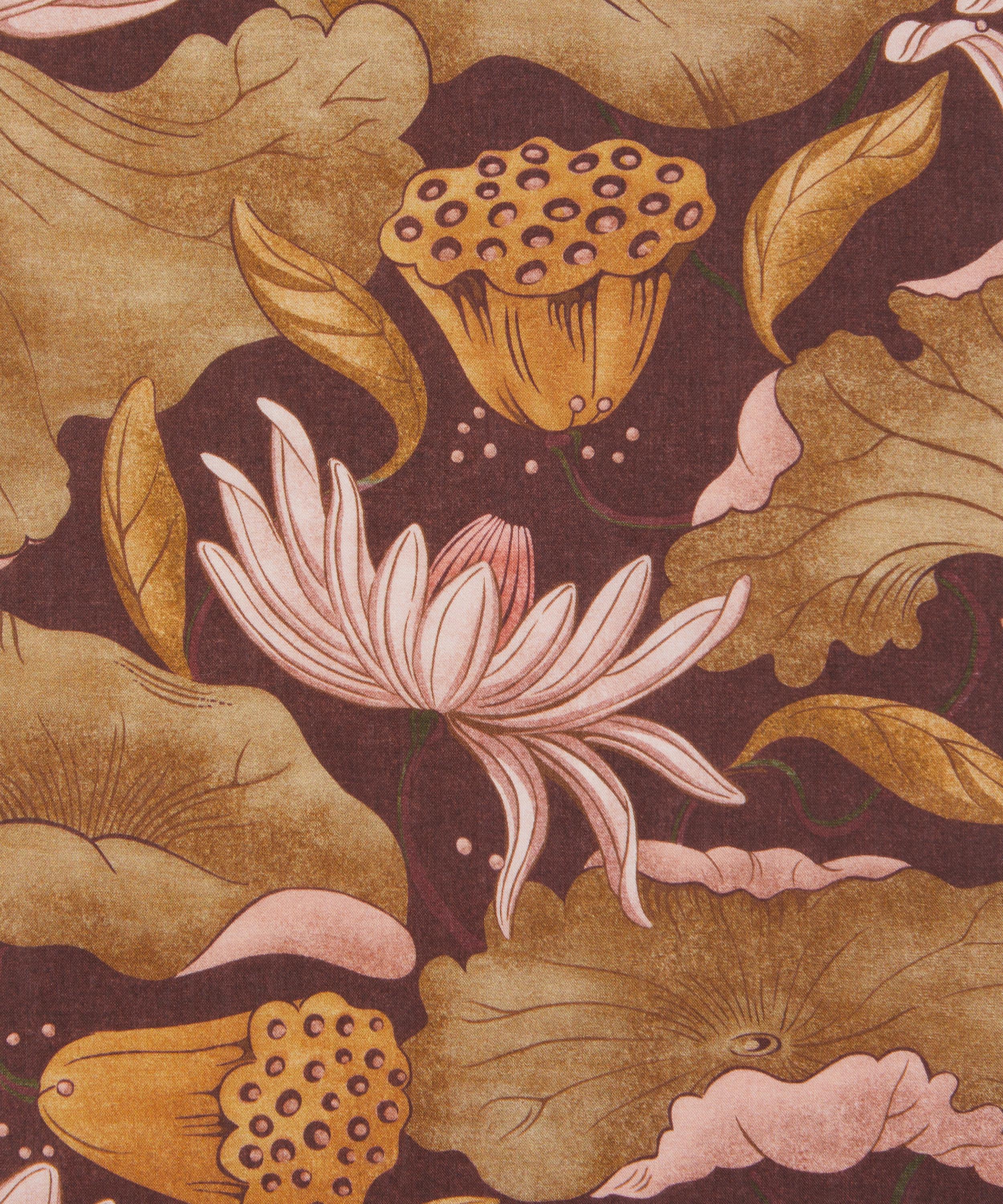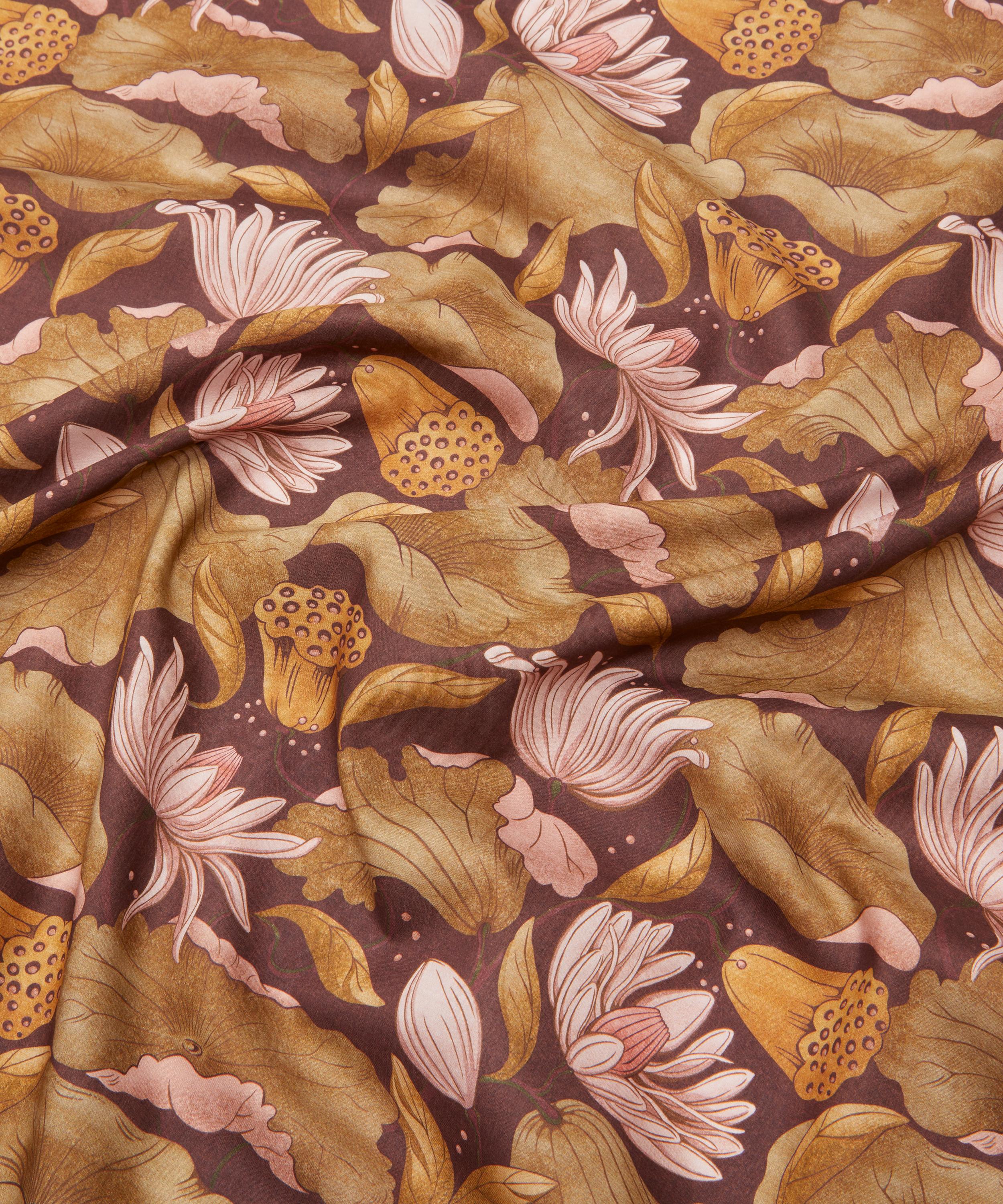 Adapted from a series of small textile fragments discovered in the Liberty archive dating from the early 1900s, this statement print conjures a dreamy, Japonaiserie aesthetic. Reimagined using a selection of additional natural motifs, majestic trails of fluttering lotus flowers, leaves, and seed pods intertwine in an almost choreographed dance. Subtle nuances in tonality enhance the design’s intricate textures, adding a sense of tactile richness.