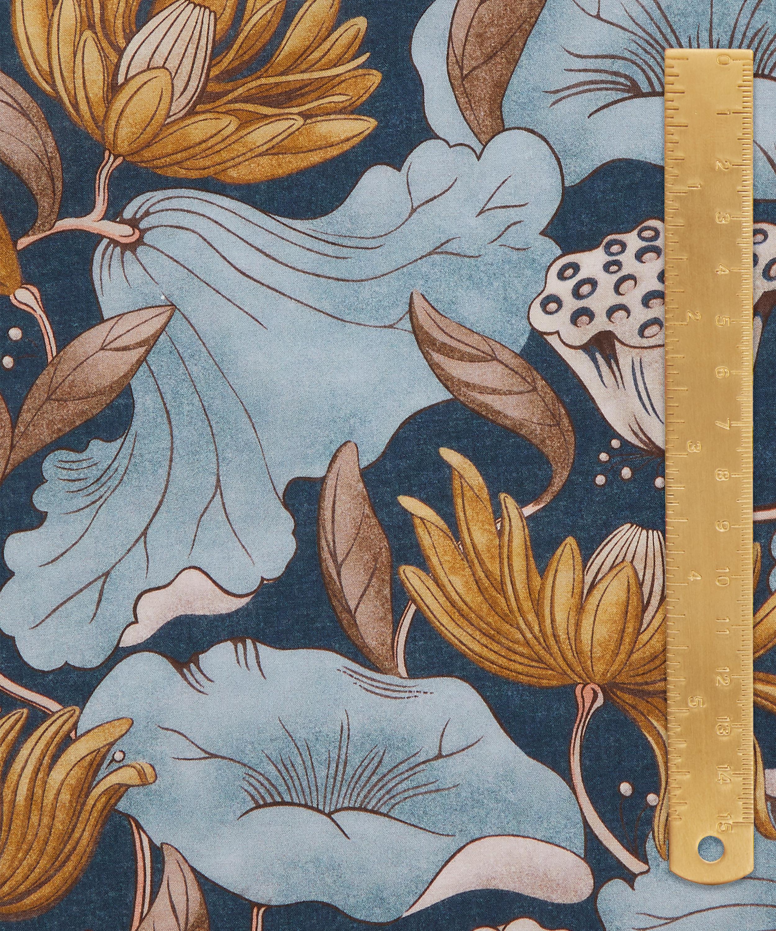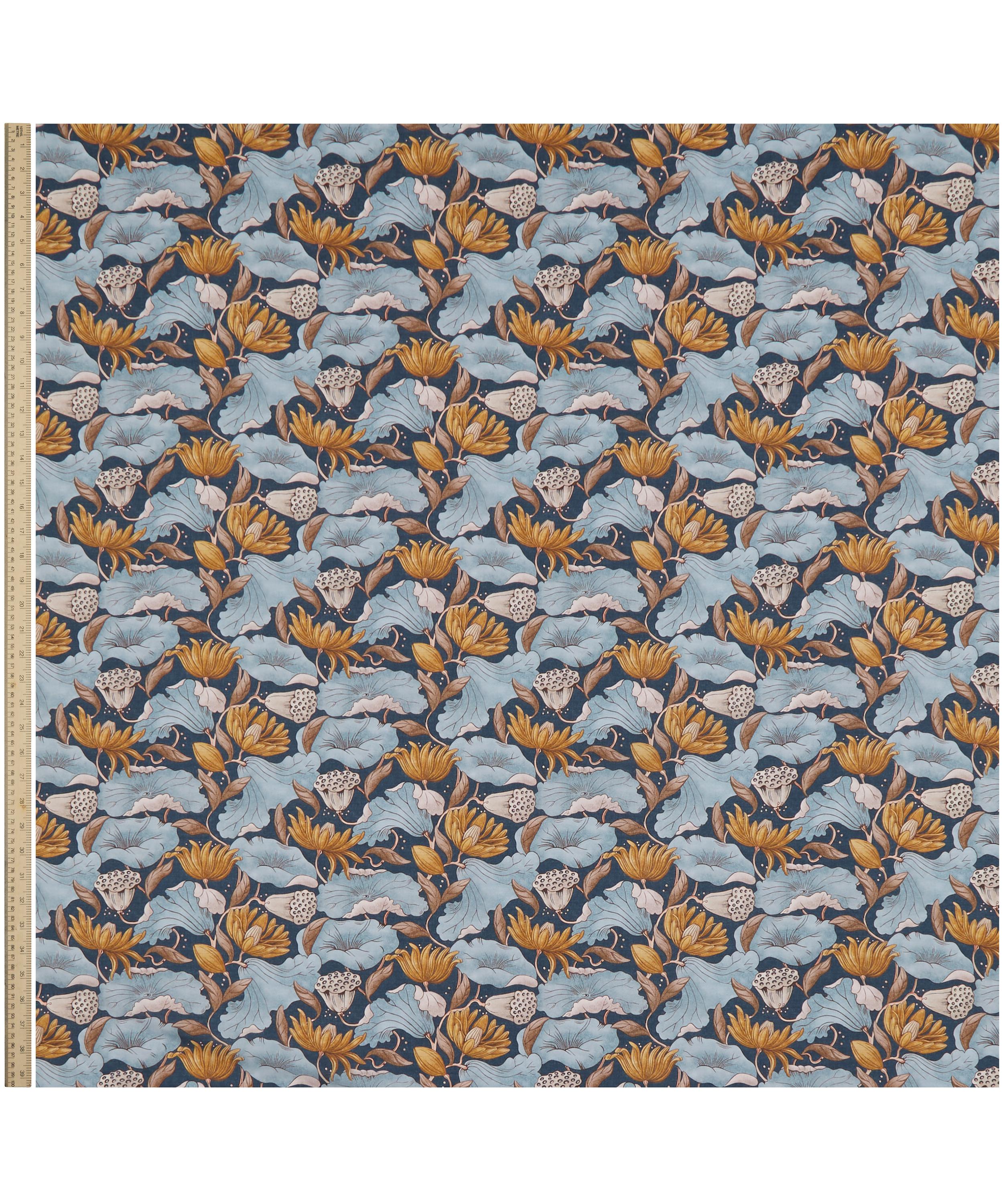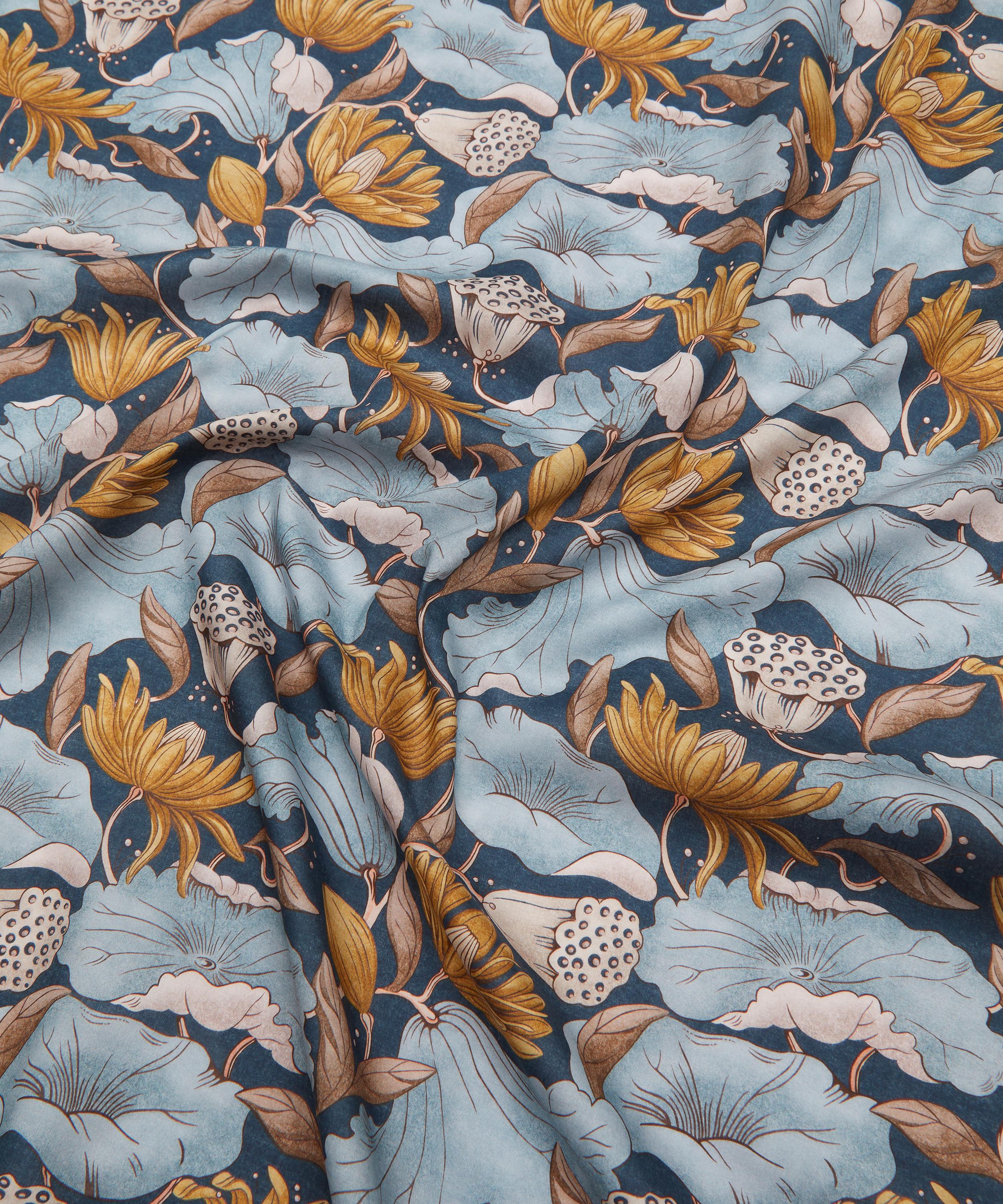 Adapted from a series of small textile fragments discovered in the Liberty archive dating from the early 1900s, this statement print conjures a dreamy, Japonaiserie aesthetic. Reimagined using a selection of additional natural motifs, majestic trails of fluttering lotus flowers, leaves, and seed pods intertwine in an almost choreographed dance. Subtle nuances in tonality enhance the design’s intricate textures, adding a sense of tactile richness.