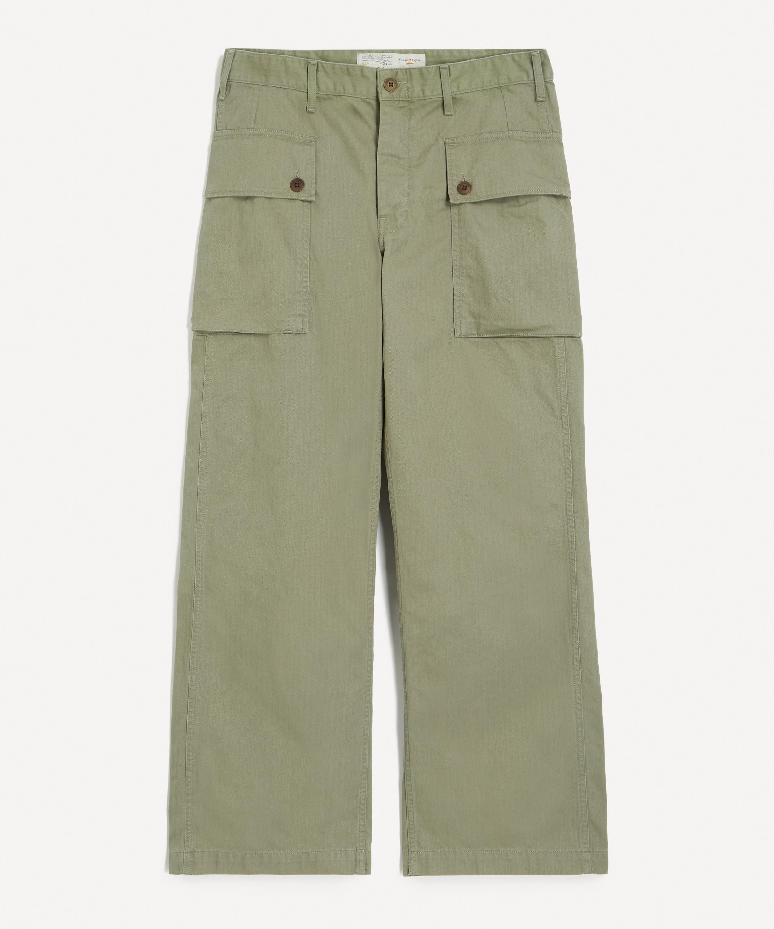 Cut from a tightly woven herringbone twill in sage green, these combat-style cargo trousers are designed with a loose, wide fit and a comfortable high waist. Two spacious cargo pockets complete the look, staying true to authentic workwear roots.