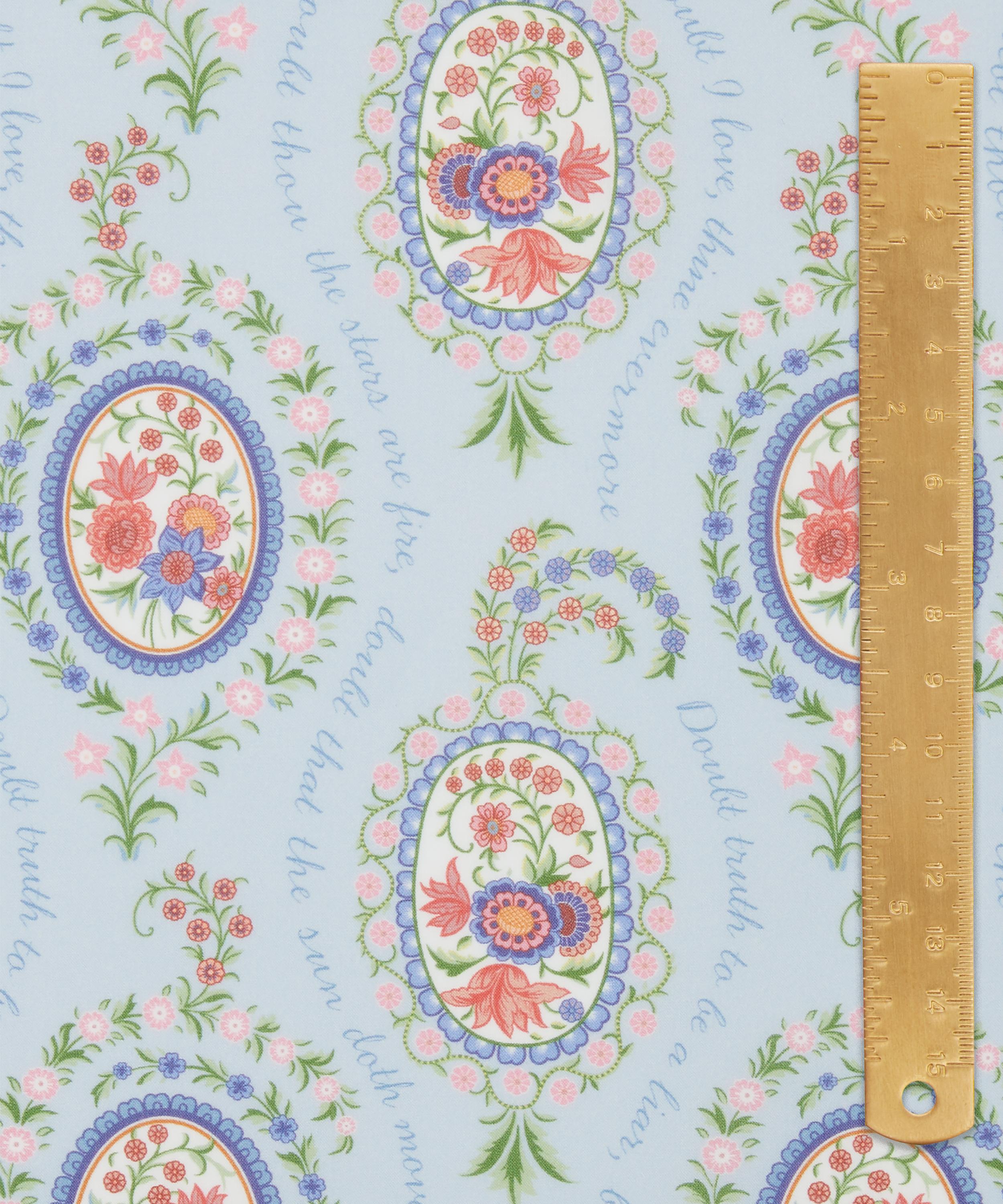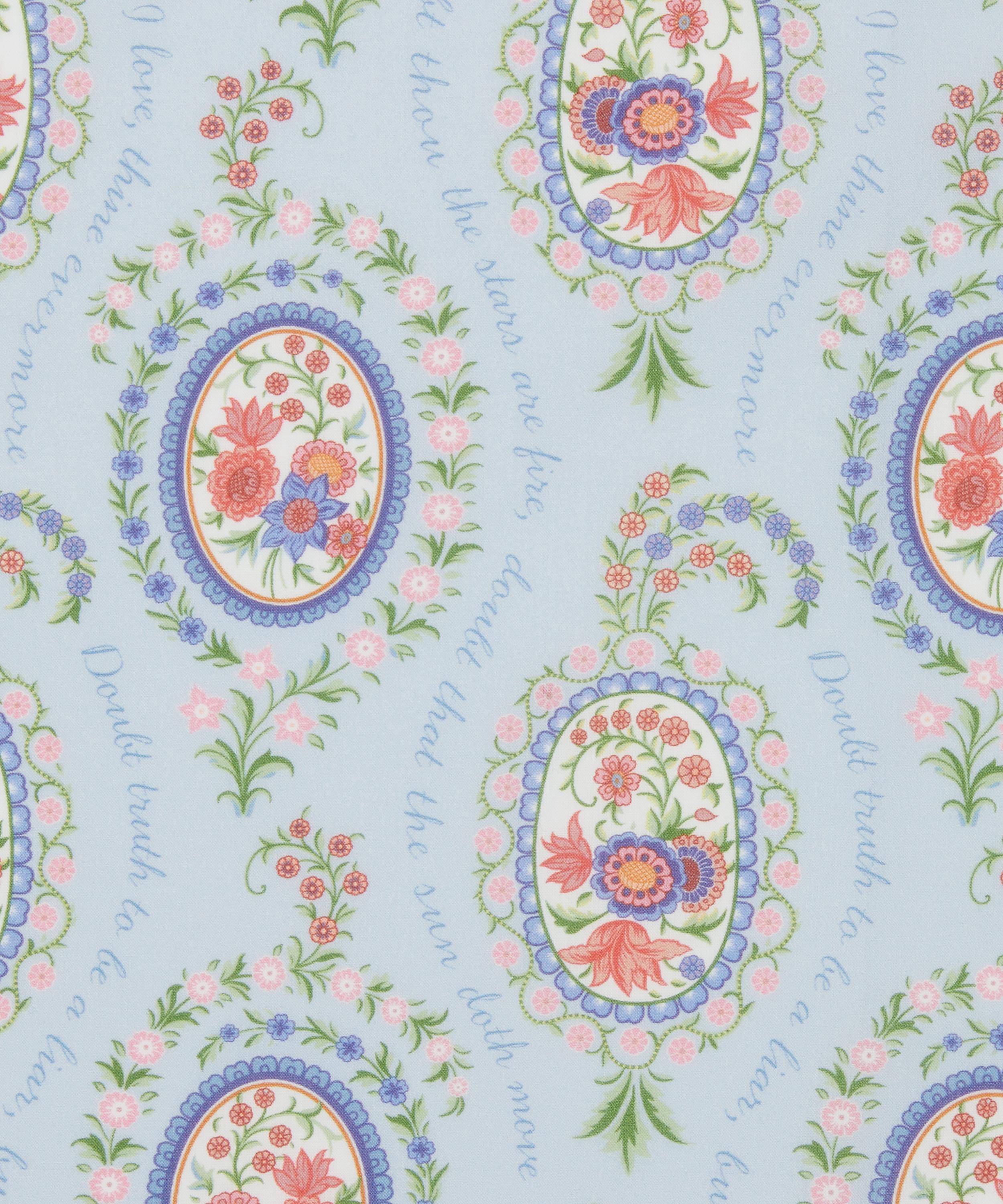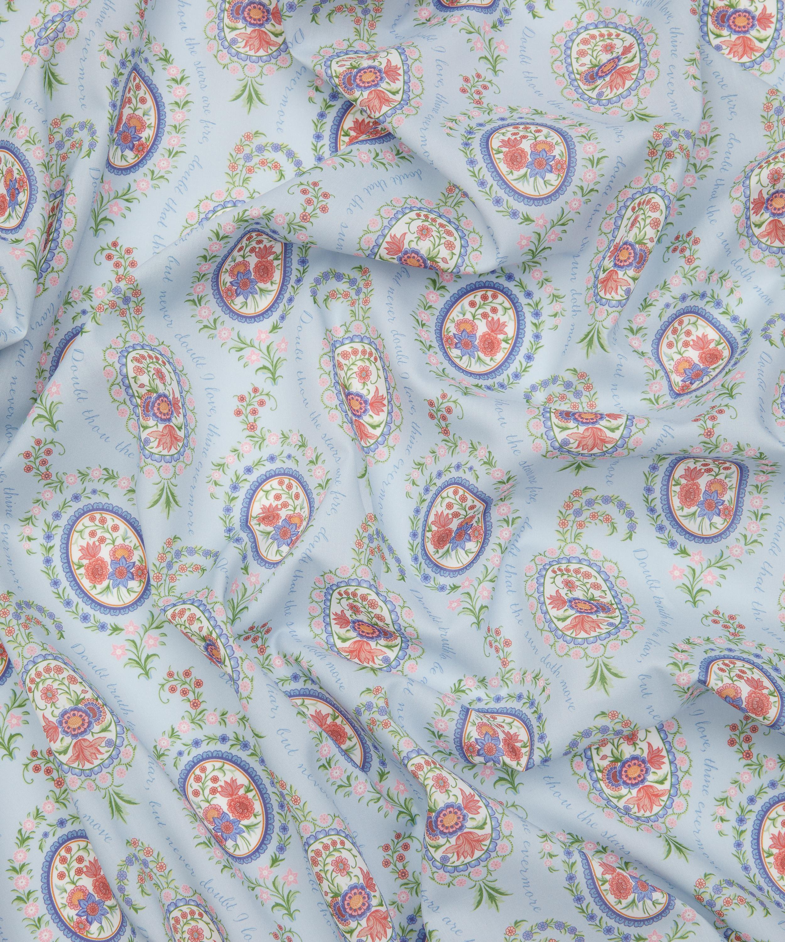 Love Poem draws inspiration from a miniature hand-painted artwork found within the pages of an archival pattern book dating back to the 1820s. Arranged in and around oval shaped botanical vignettes, its delicate blooms feature Persian-style flowers including tulips, chrysanthemums, and carnations. Take a closer look to discern the subtle words of a romantic love poem, gracefully woven amidst the elegant motifs.