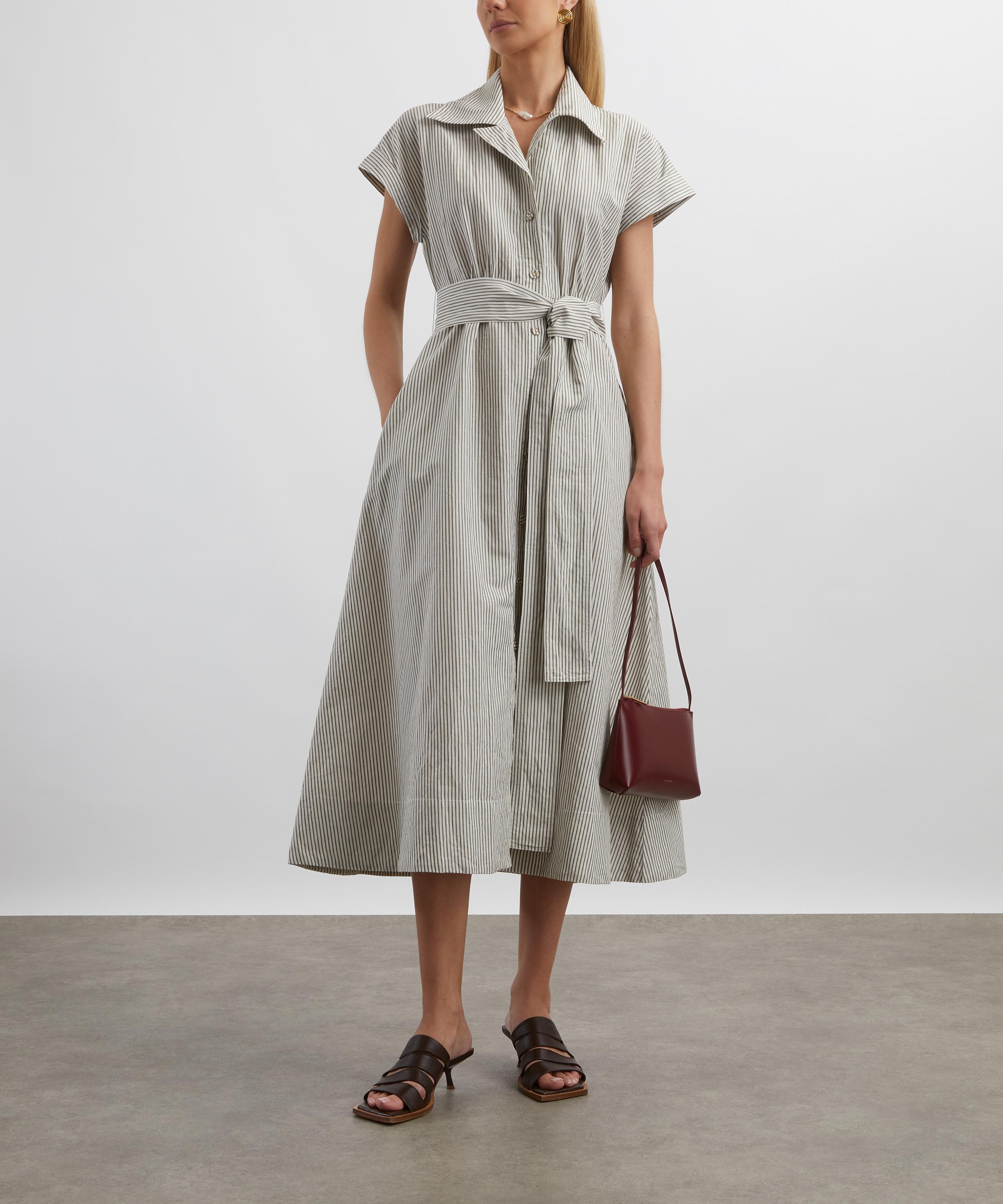 In a moss-and-white striped linen weave, Lucy captures the essence of effortless elegance. Designed with an open notched collar and short winged sleeves, it features a detachable waist belt that creates a softly flared silhouette when cinched.