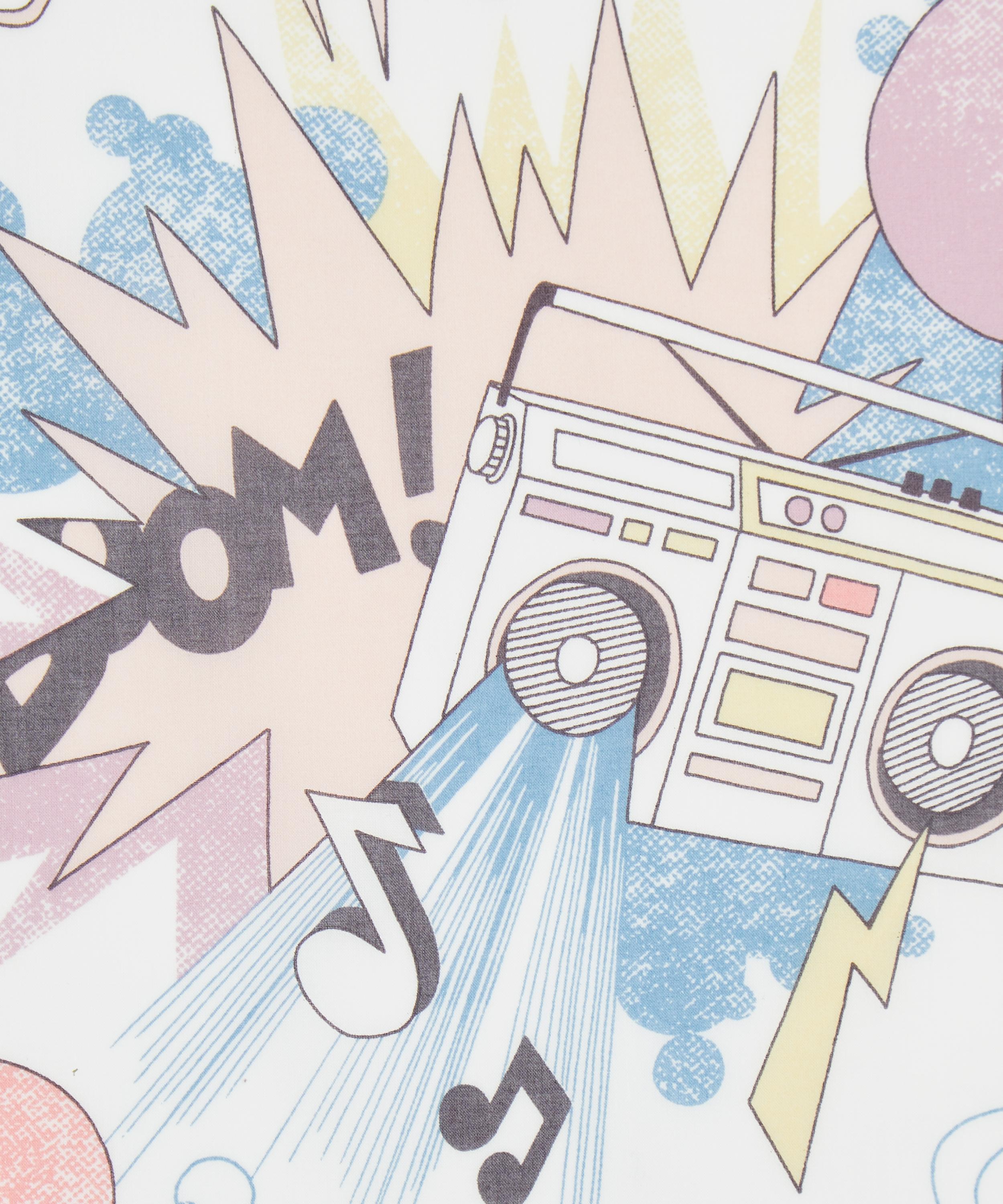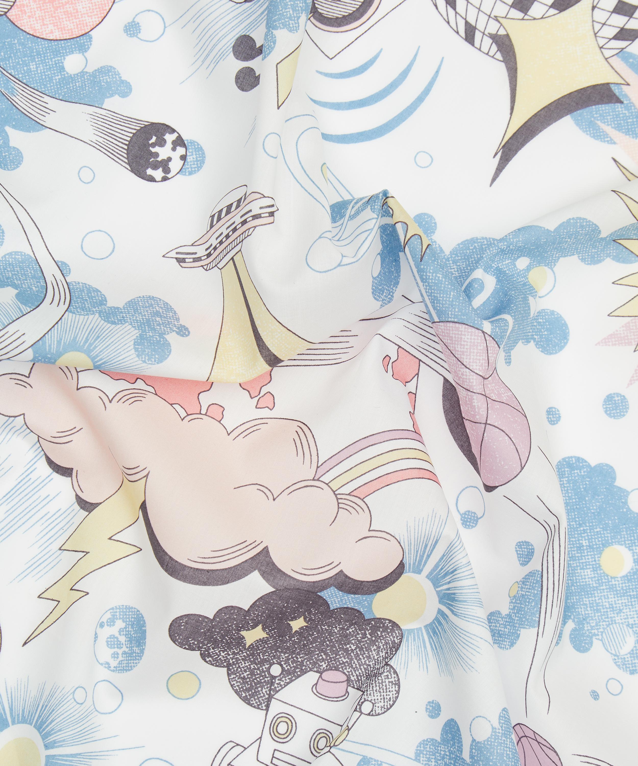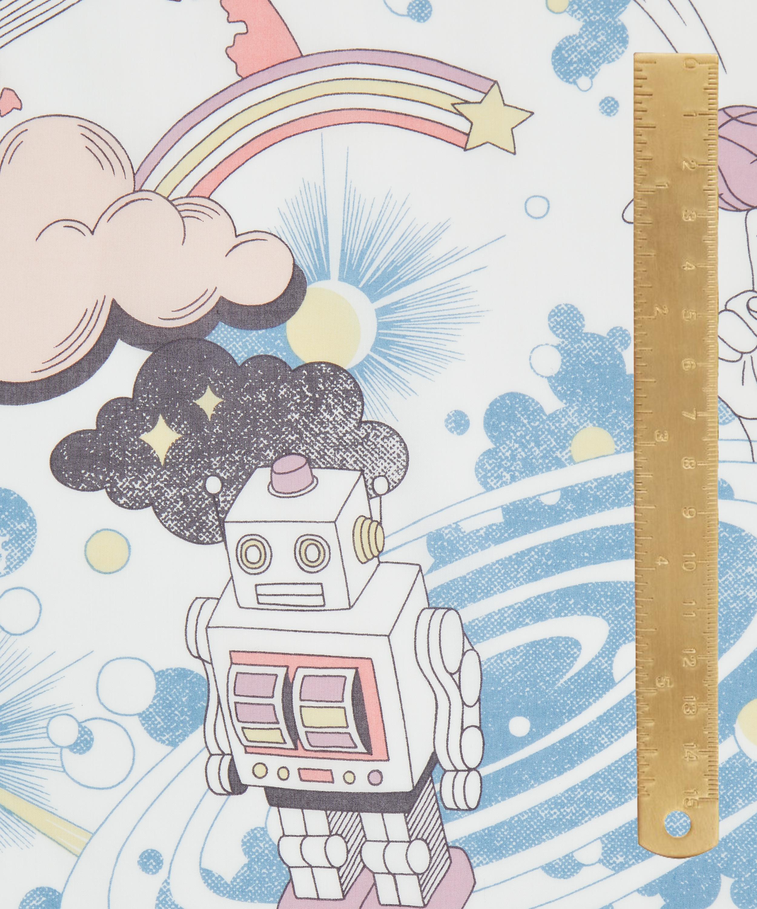 Lukey’s Robot is a contemporary design inspired by youth culture and hip-hop. Featuring an array of playful motifs, this whimsical conversational pattern embodies the style and attitude central to this subculture. Rainbows, robots, stars, planets, and even bouncing basketballs make an appearance, creating a three-dimensional, fantastical comic strip story.