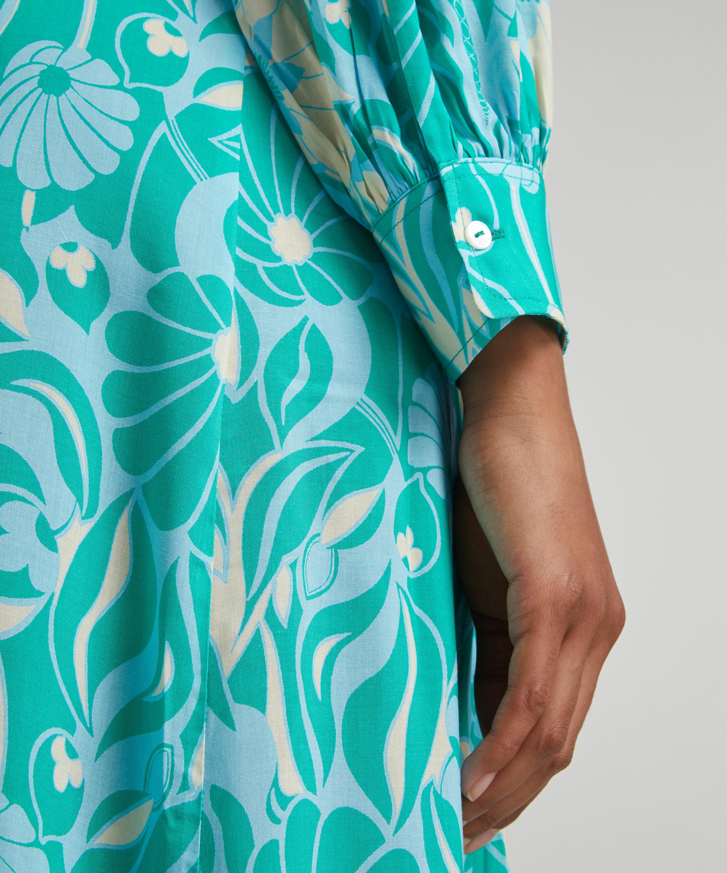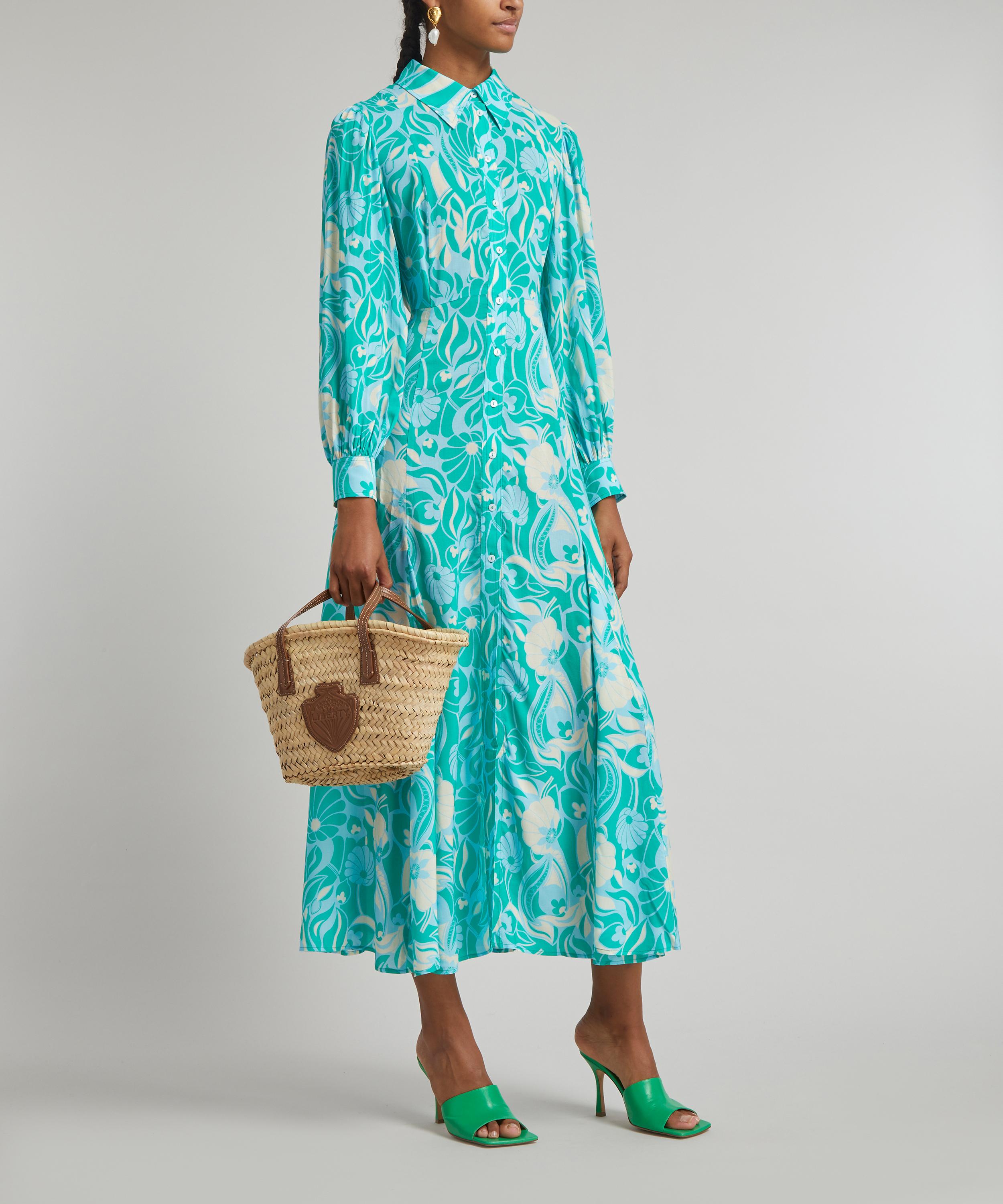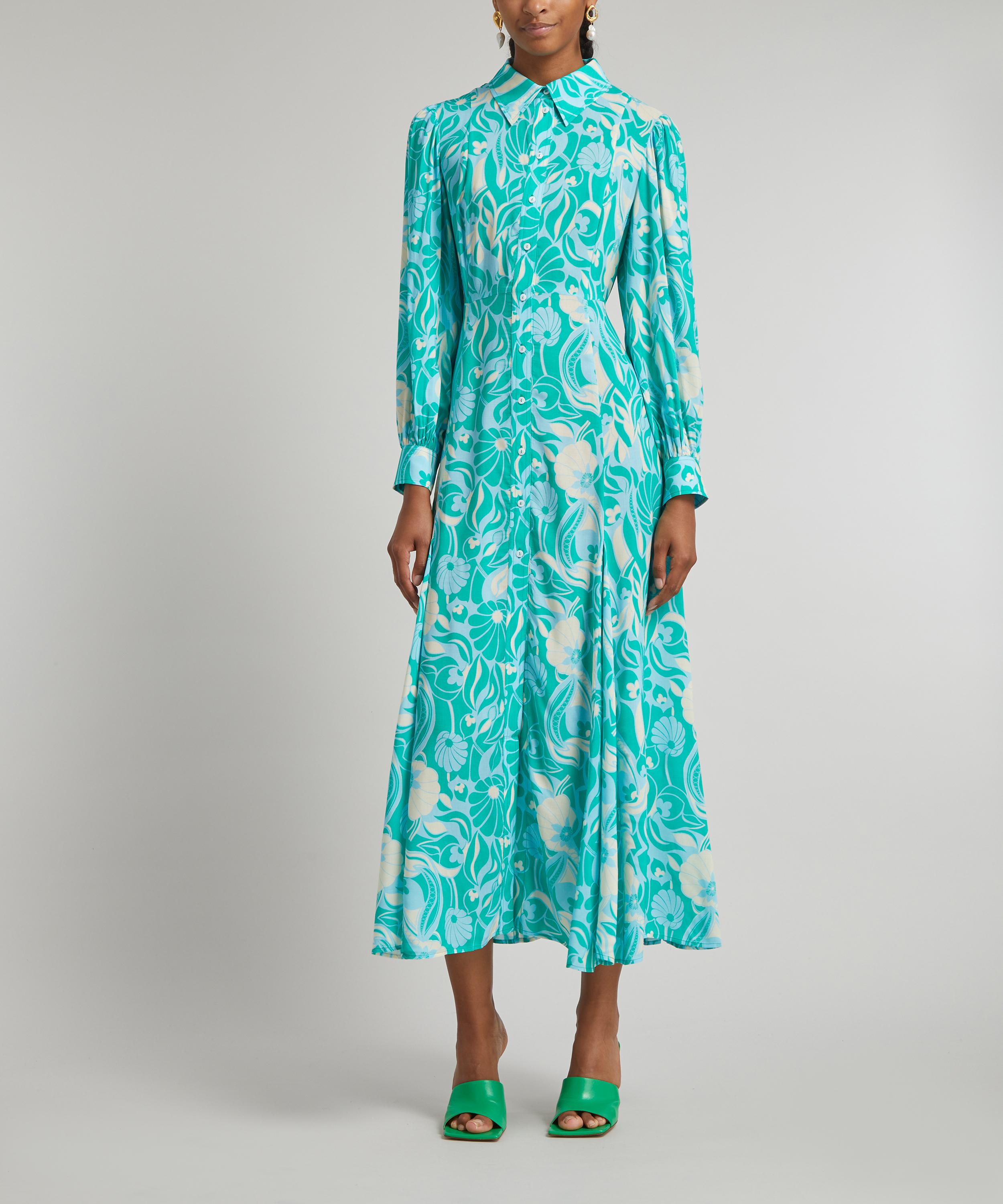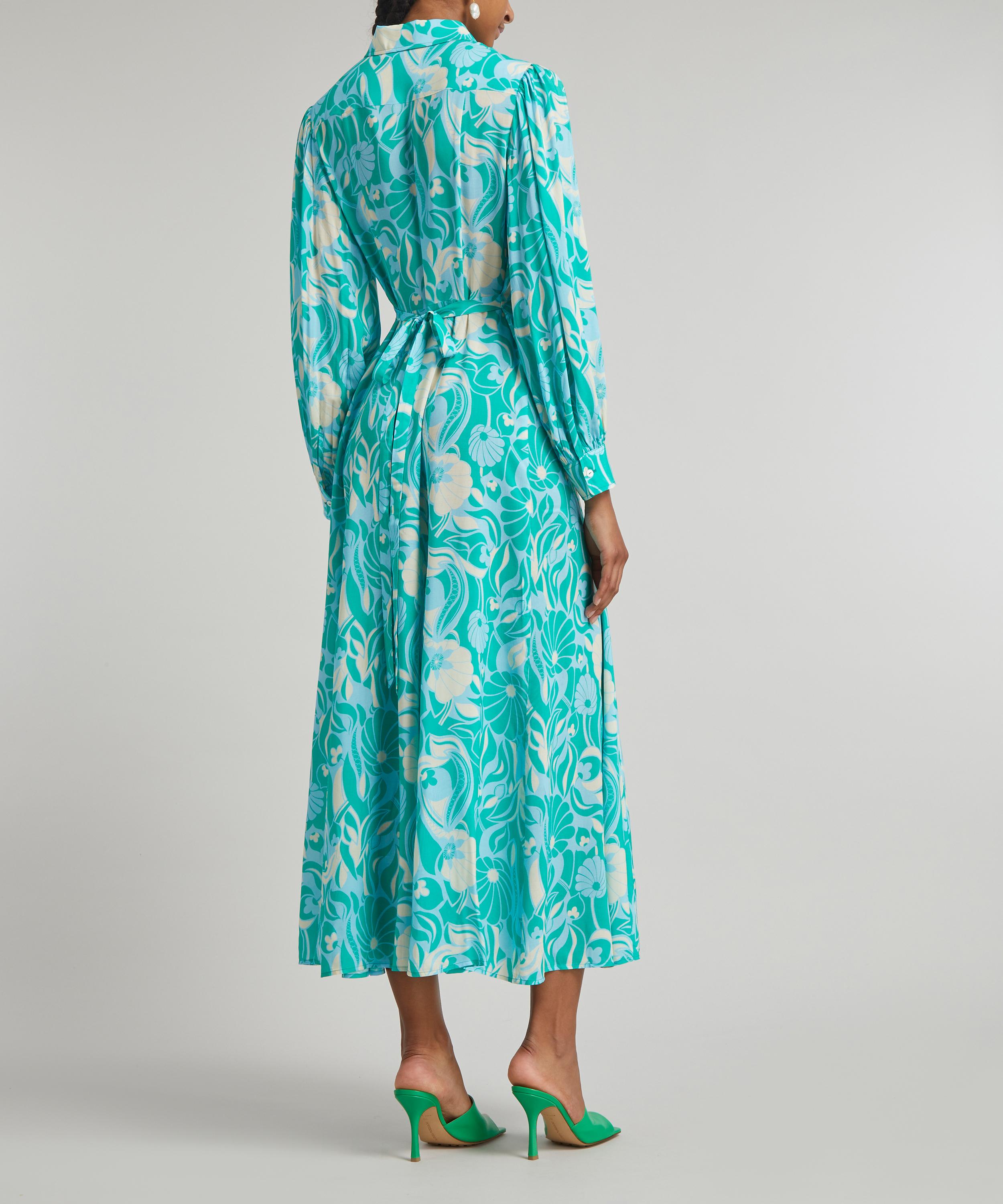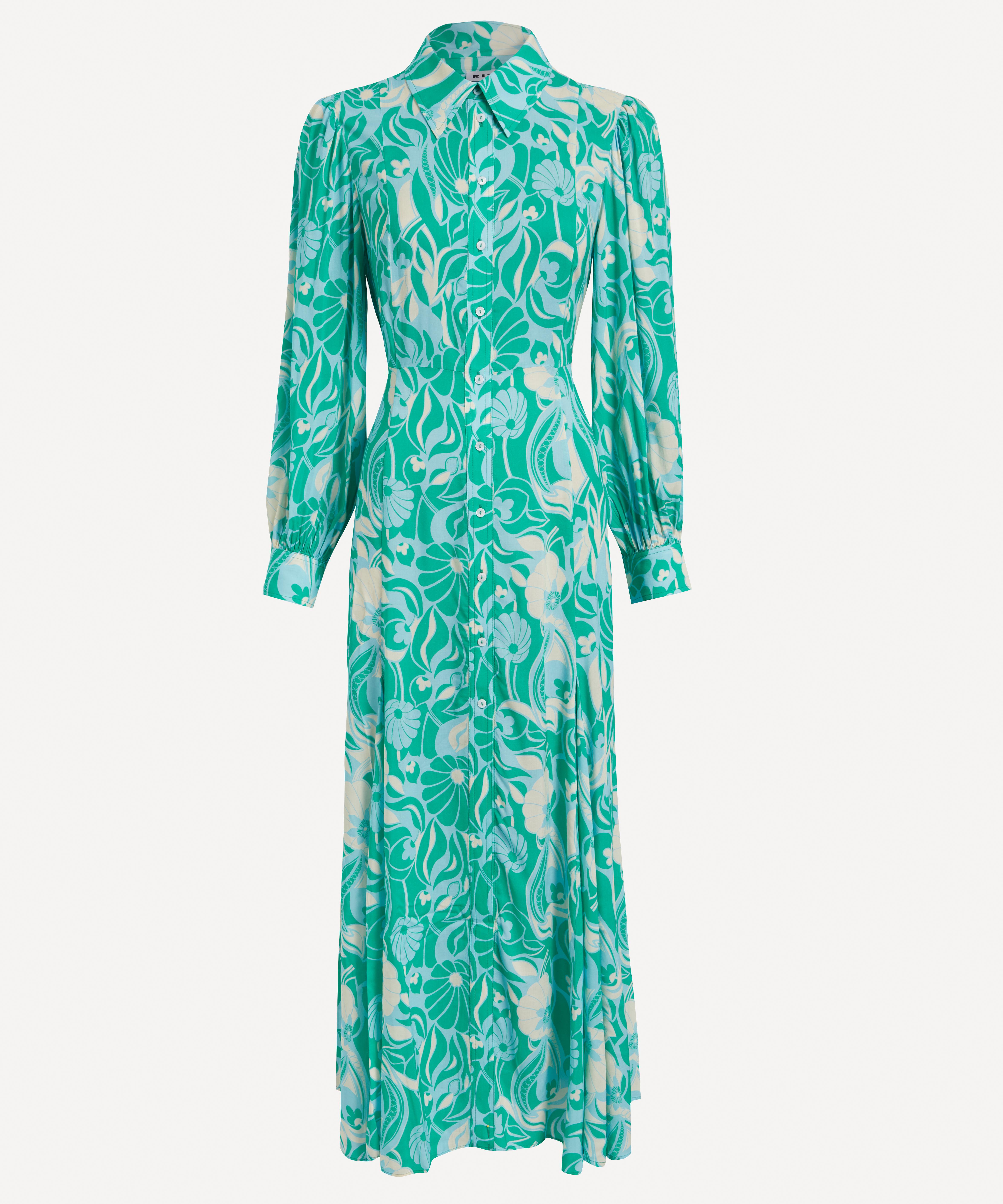Every piece by RIXO is a bold statement rooted in timeless design. Crafted from a silky smooth viscose-crepe in a hand-painted floral print, the Maddison dress is elegantly shaped to a flattering straight fit that falls to a floaty, ankle-length A-line skirt. A classic button-down design with long bell-sleeves that gather at the cuffs, it has apron-style waist ties for a fitted silhouette. Simply pair it with zingy green mules for an eclectic evening edit.