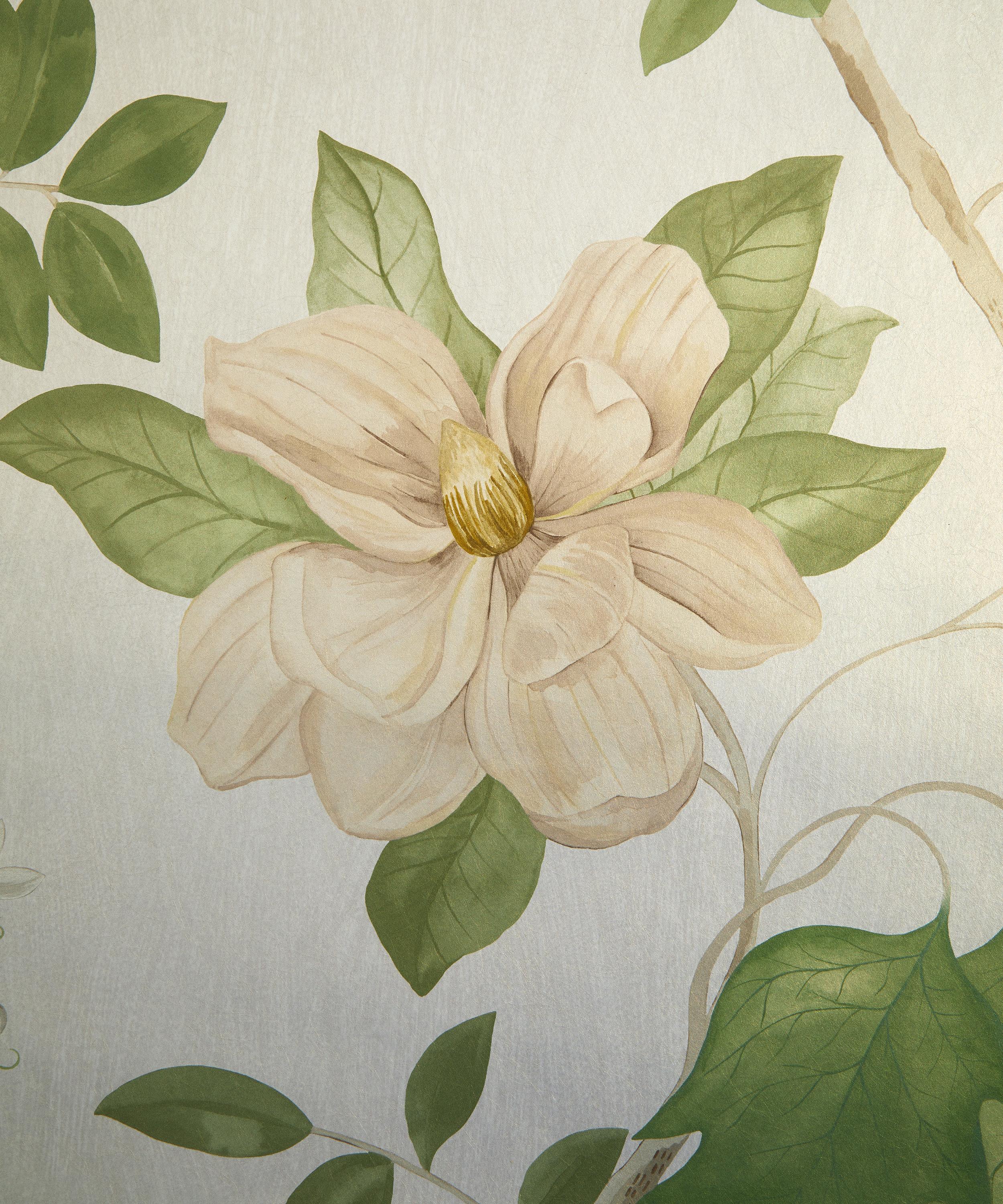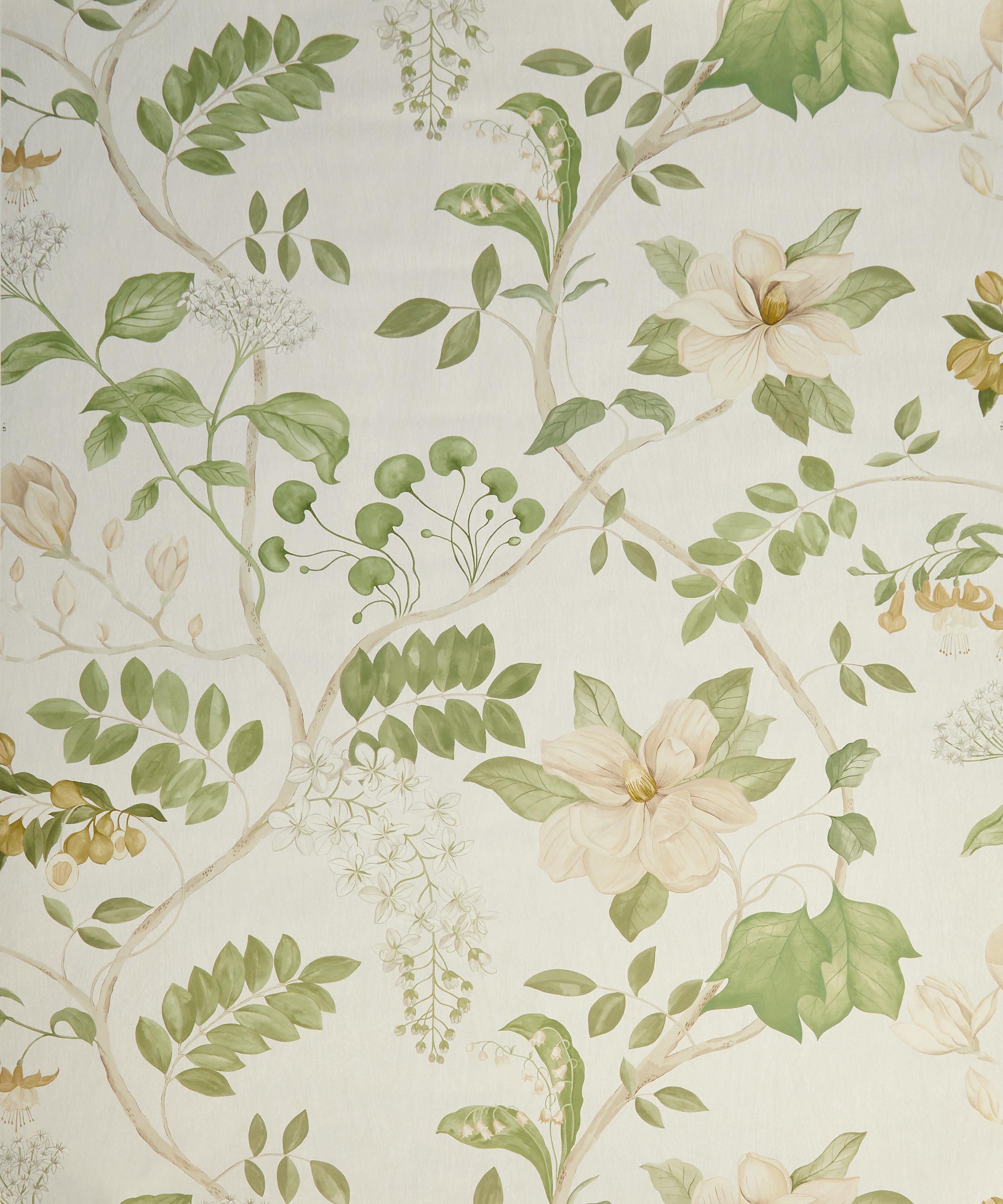 Hand-painted in the Liberty Design Studio, Magical Plants feature an exquisite illustration of a majestic trailing garden filled with magnolias, wisteria, lily of the valley and other assorted florals adorned on leafy branches. This botanical wonder is printed on a wide-width textured ground finished with a subtle lustre and sheen.