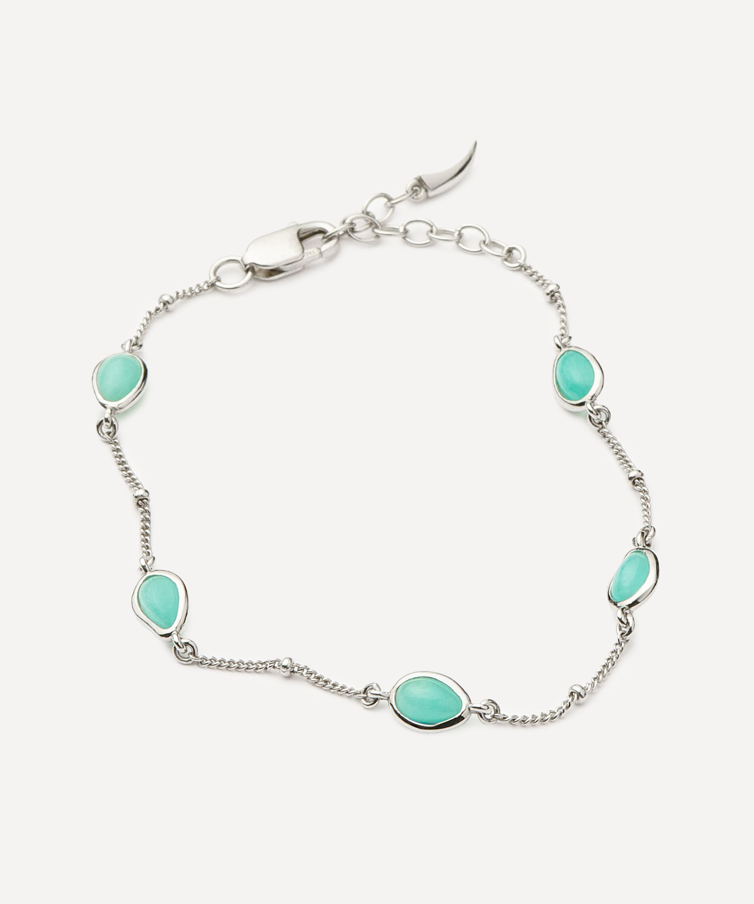Crafted from rhodium-plated silver, it features a delicate bobble chain adorned with tranquil blue amazonite stones - a token of peace - fitted into molten settings. Team it with other charm bracelets, bangles or chunky chains for a wonderfully contrasting effect.